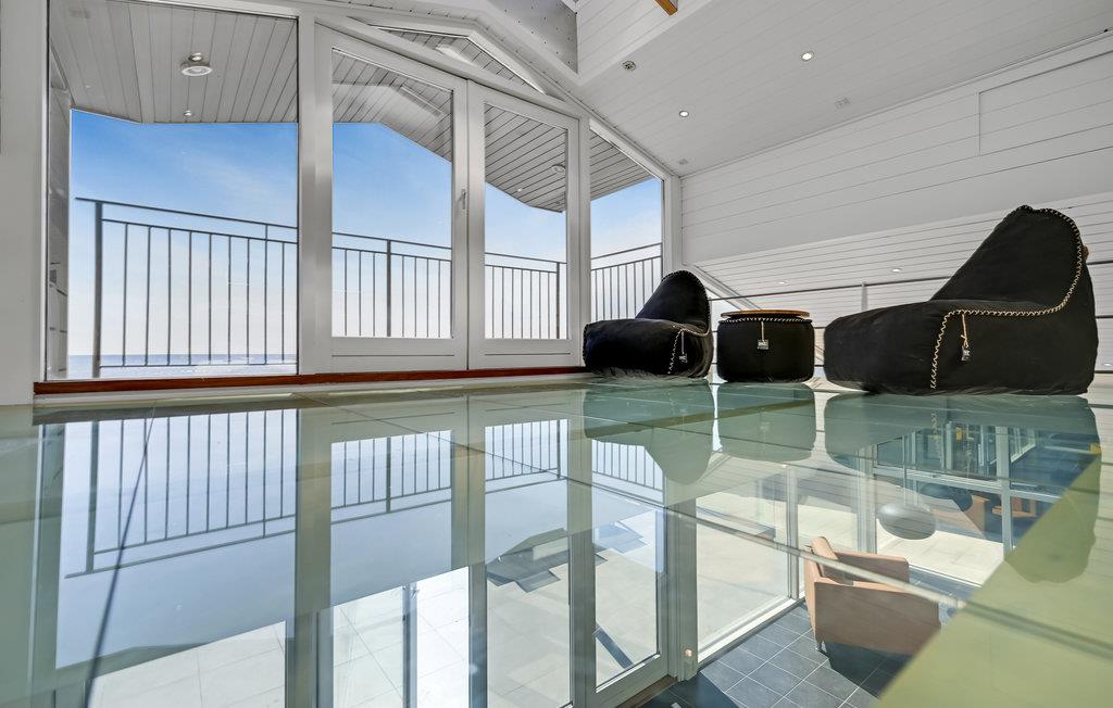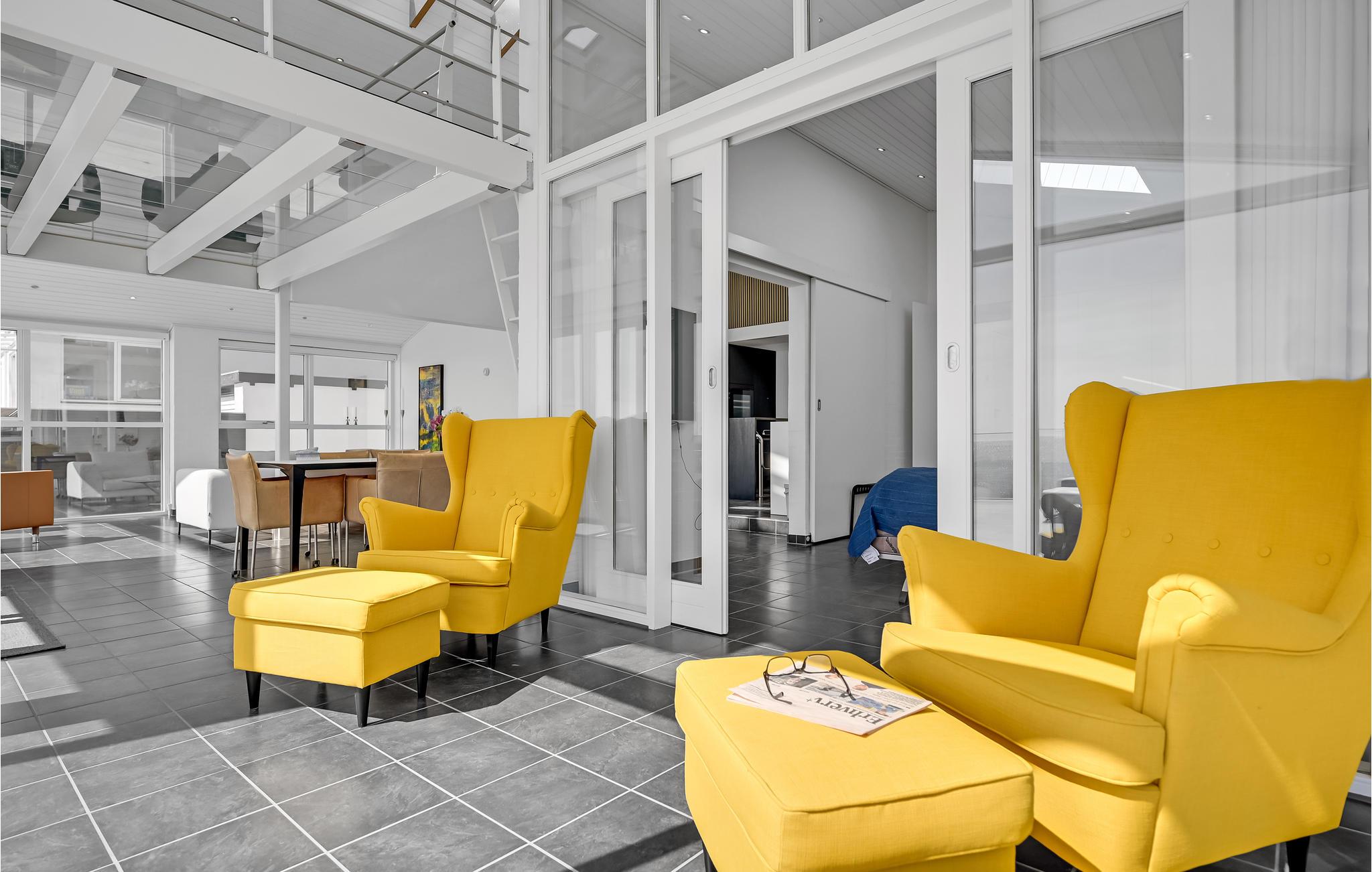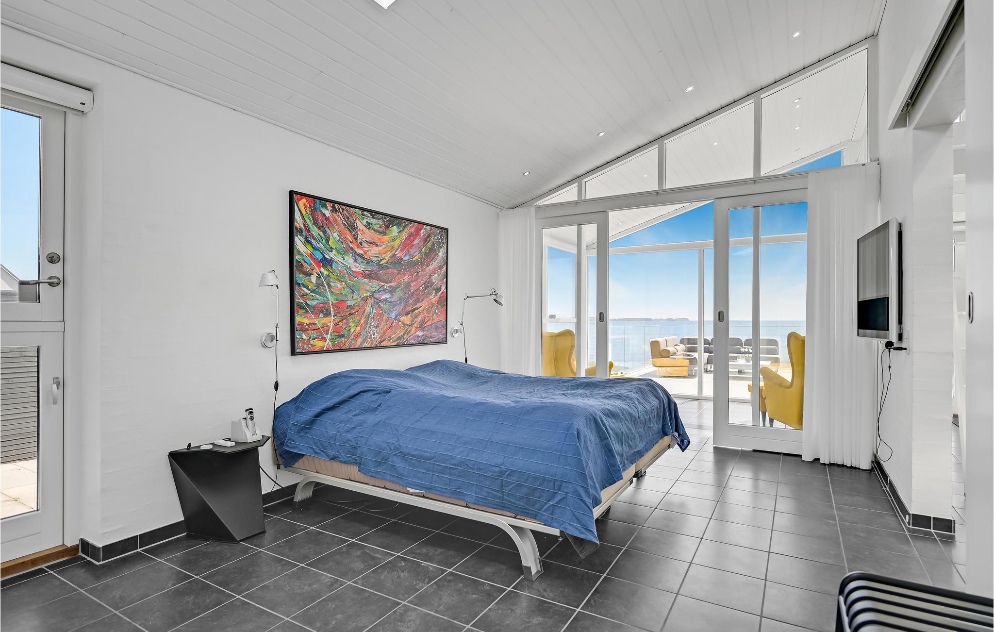Dette lækre feriehus er noget helt særligt, og så er der oven i købet en betagende havudsigt. I vinterhalvåret kommer I sikkert til at tilbringe en god del af tiden i den flotte stue med ild i biopejsen og et glas vin ved hånden om aftenen, for der er et fantastisk miljø. Arkitekturen og den flotte konstruktion af spær under loftet og store lysindfald giver samtidig huset en rummelig fornemmelse. Om sommeren kan I nemt træde ud på den åbne terrasse med havemøbler og grill.