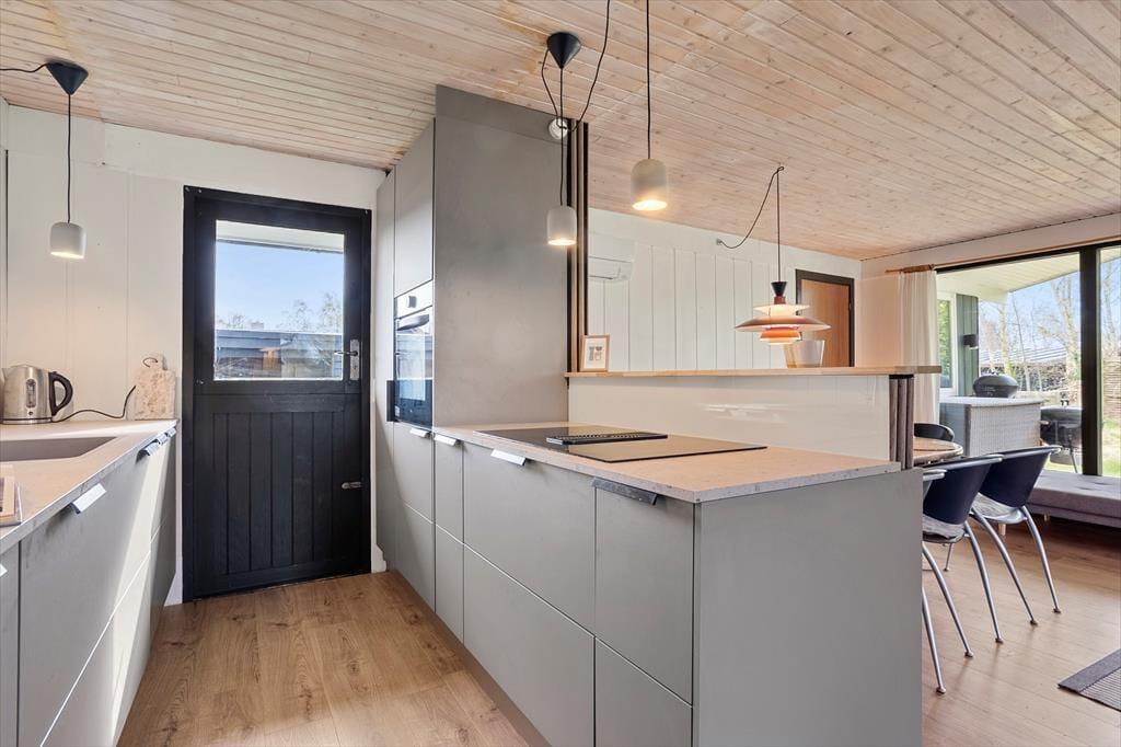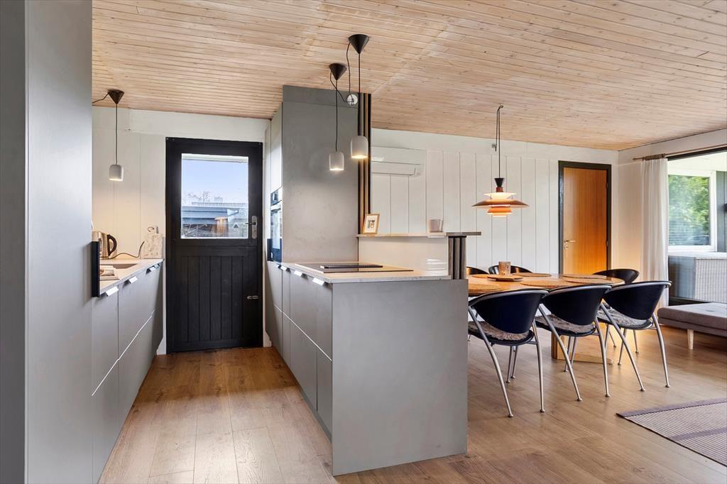 Når du træder indenfor, mødes du af et lyst og enkelt indrettet hjem, der skaber en afslappet atmosfære. Stuen er indbydende med store vinduer, der lukker masser af lys ind, og en brændeovn, som skaber hygge på køligere dage. Huset har et funktionelt køkken, hvor der er mulighed for at lave gode måltider til hele familien. Soveværelserne er rummelige og komfortable, og badeværelset er med bruser.