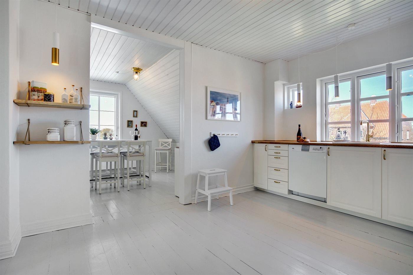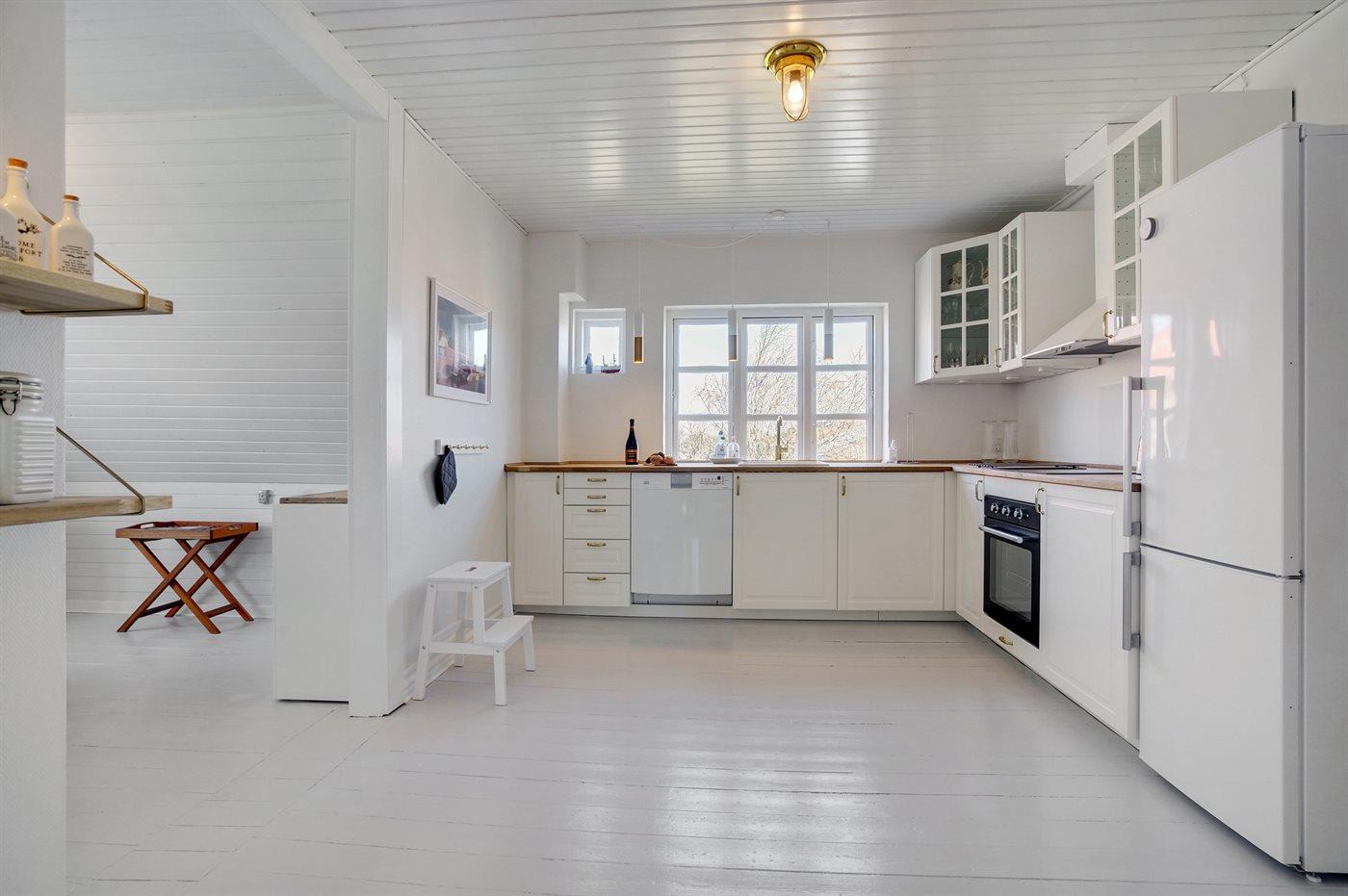 Køkkenet er udstyret med 1 køleskab. Der er 4 induktionskogeplader, varmluftovn, mikrobølgeovn samt opvaskemaskine.