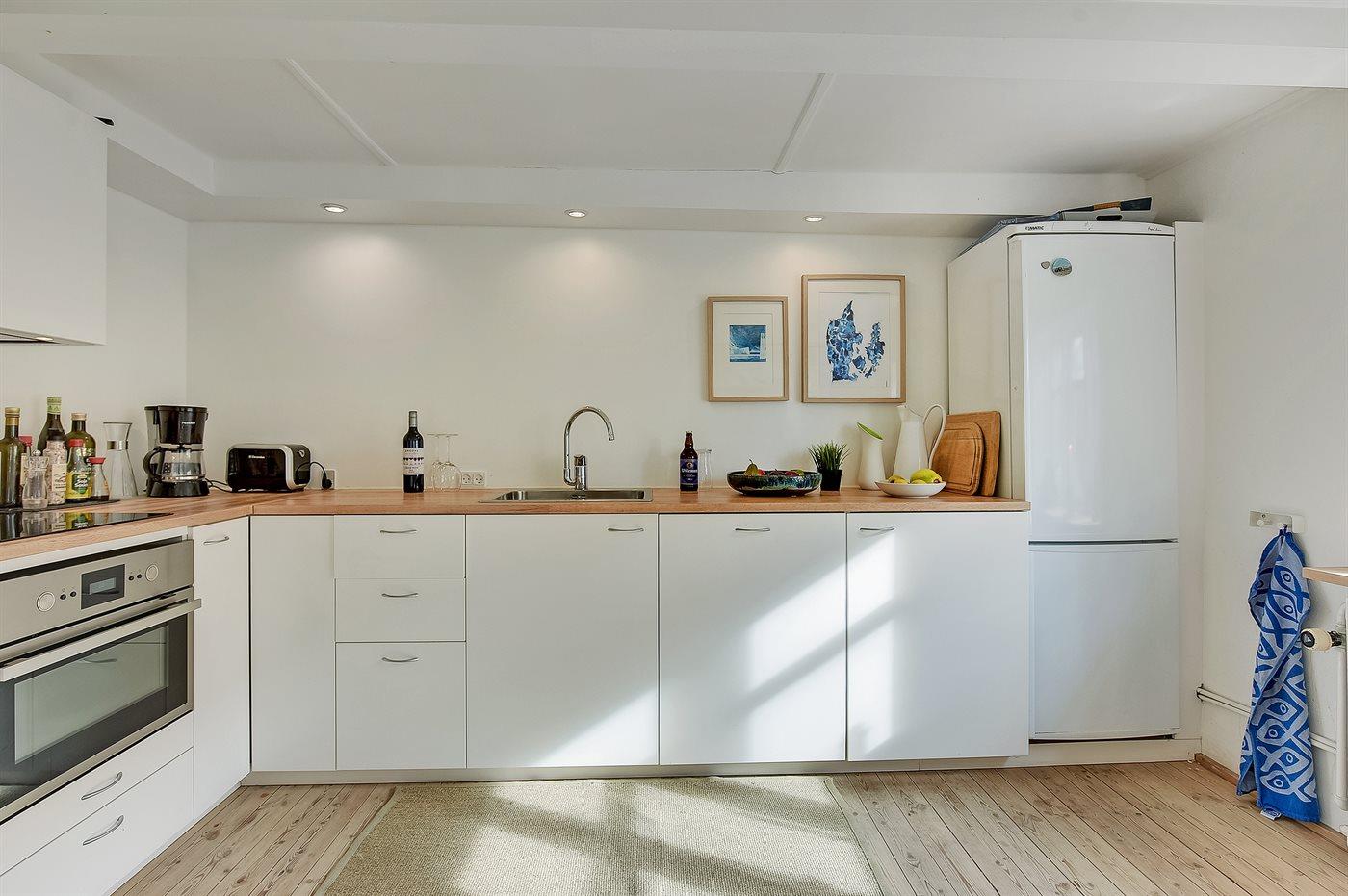 Køkkenet er udstyret med 1 køleskab. Der er 4 induktionskogeplader, varmluftovn samt opvaskemaskine.