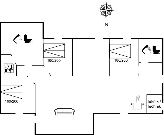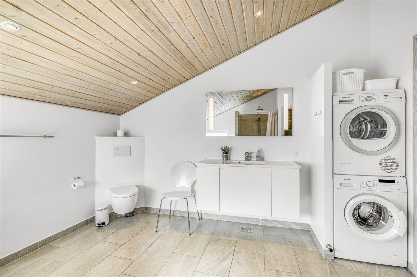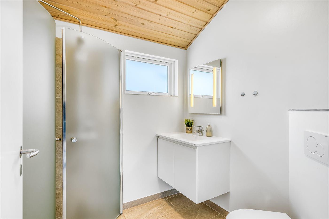Der er 2 badeværelser med bruseniche og 2 toiletter. Der er gulvvarme på 2 badeværelser. Vinkelbadekar. I saunaen er der mulighed for afslapning.