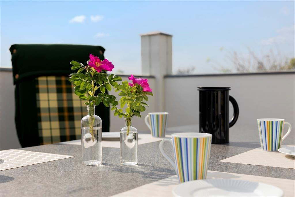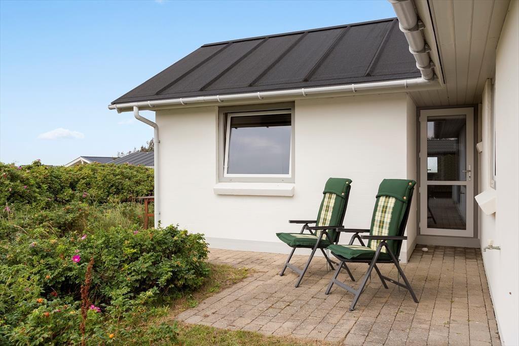 Udenfor finder du flere dejlige terrasser, hvor du kan slappe af og nyde solens varme eller finde skygge på de solrige dage. Der er både en sydvestvendt terrasse, der er perfekt til at spise måltider udendørs, og en østvendt terrasse, hvor du kan nyde morgenkaffen. Fra både stue og soveværelse har du direkte adgang til terrasserne, hvilket gør det nemt at gå ud og nyde den friske luft. Når du er klar til at udforske området, er det kun en kort gåtur til stranden, hvor du kan tage en dukkert i det friske vand eller gå lange ture langs den brede sandstrand.