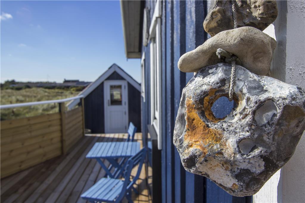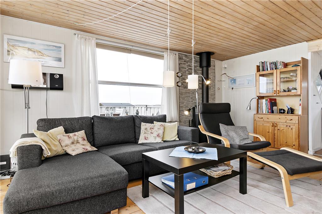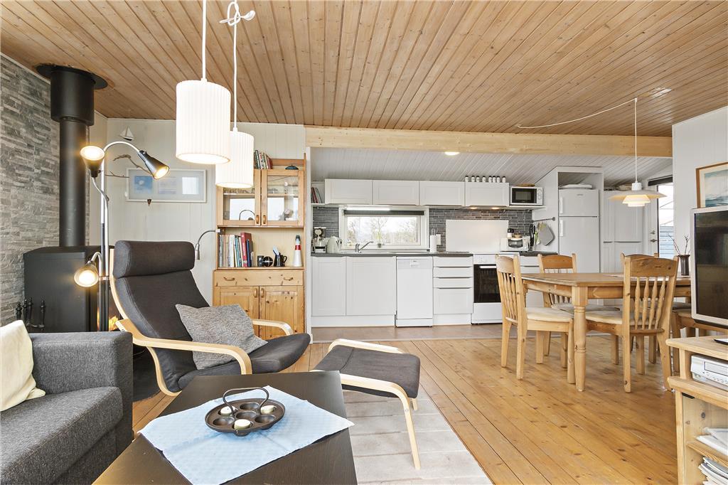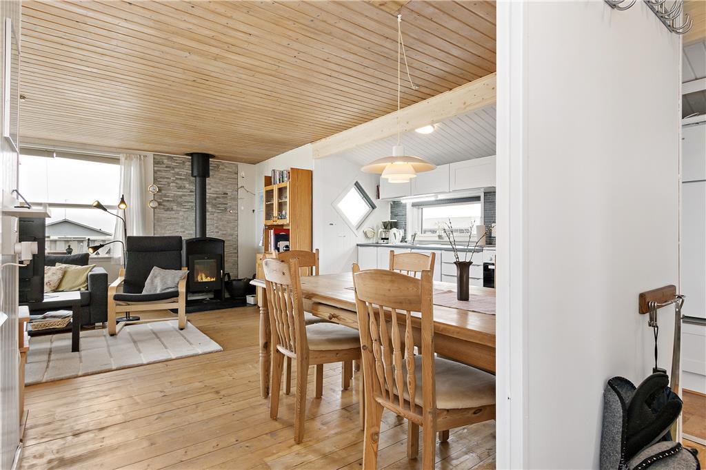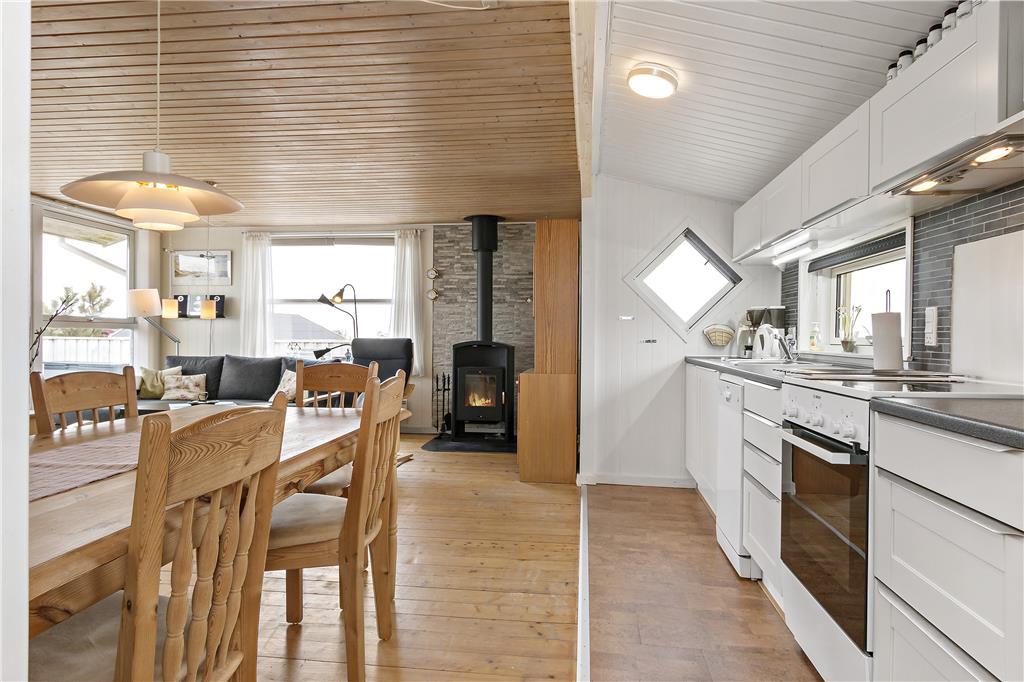 Fra indgangen via den overdækkede terrasse kommer man ind i det åbne køkken, som fungerer som husets hjerte. Her har du spisekrogen med store vinduer mod nord og sofagruppen med flot udsigt mod sydvest. Om man sidder ved spisebordet eller i sofaen, kan men flere steder se det blå Vesterhav med fiskekutterne i det fjerne. Efter en rask tur på stranden er det skønt at nyde brændeovnens varme. Der er brænde ved huset til kr. 25 pr. kurvfuld. Pengene lægges til ejer i huset. I forlængelse af terrassen ligger annekset, som også har tv.