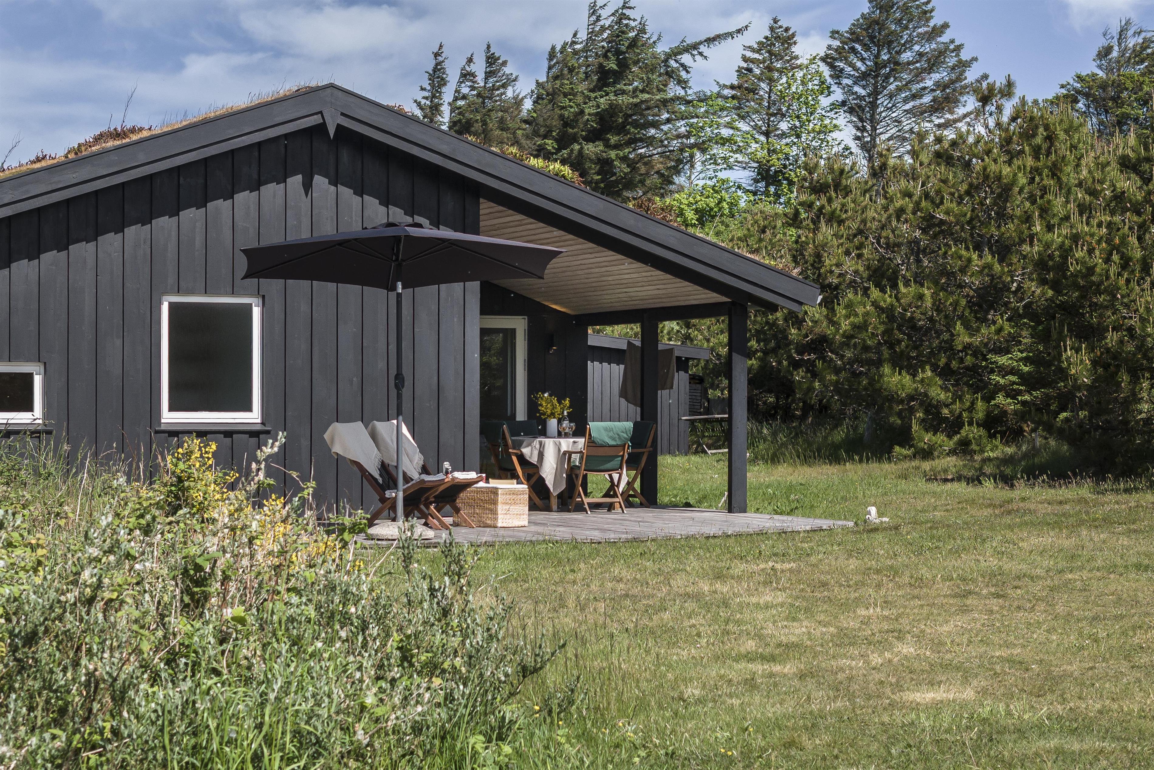 Fra feriehuset har I direkte adgang til flere skønne terrasser, hvoraf de 2 er overdækkede. Den vestvendte terasse indbyder til at samles omkring bordet til en dejlig middag og lange sommeraftener med solnedgang i baggrunden. Her kan I nyde udsigten over det kuperede klitlandskab - I er helt ugeneret her og med god afstand til nærmeste nabo.
