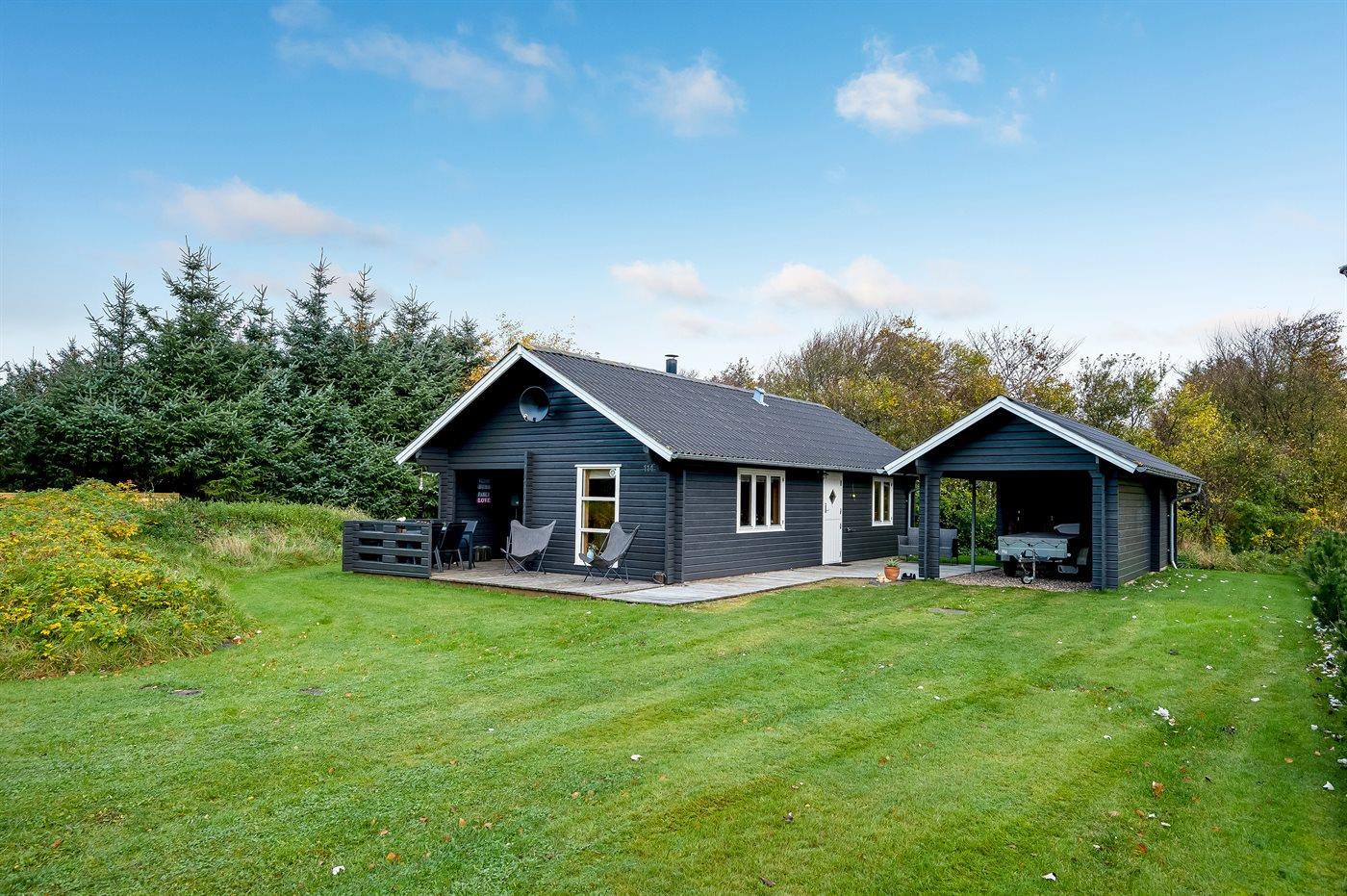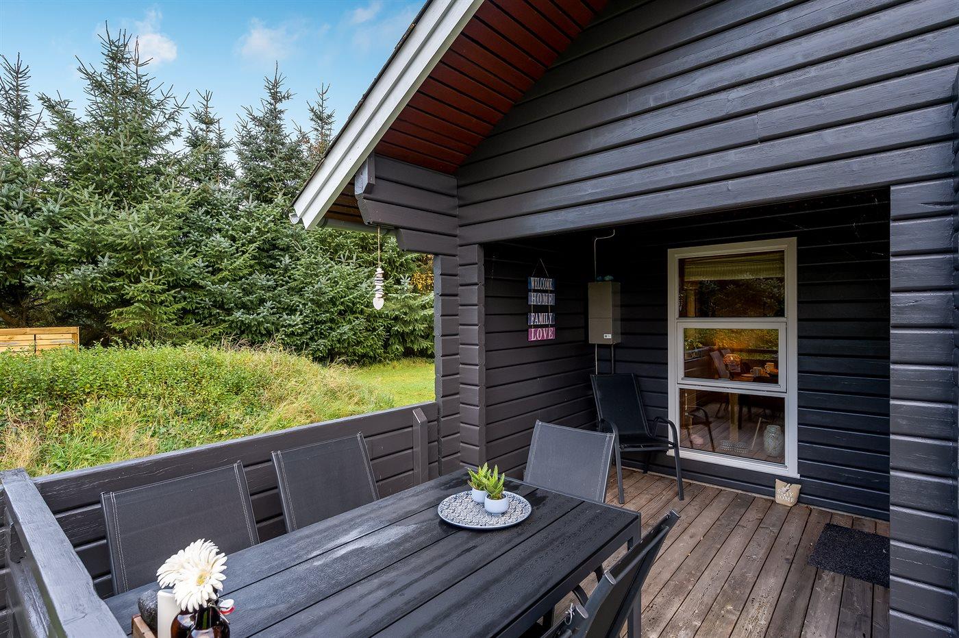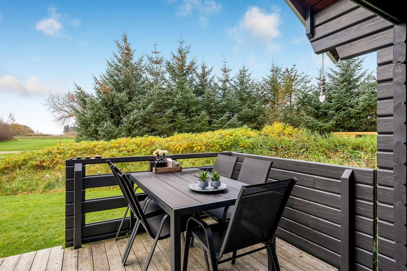 Der er træterrasse på øst-og sydsiden, for både morgen- og middagssol. Den hyggelige overdækkede terrasse vender mod syd, hvor den smukke udsigt og de dejlige aftentimer også kan nydes. Der er havemøbler; stole, bord, to liggestole, hynder samt parasol. Der er carport med plads til både bil og cykler.