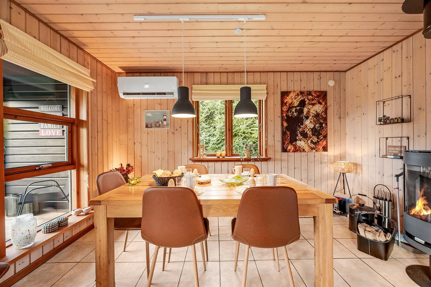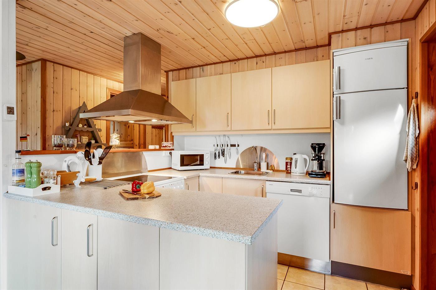 Det særdeles veludstyret køkken har god skabsplads, køle-/fryseskab, keramisk komfur med almindelig + varmluftsovn, mikrobølgeovn, emhætte og opvaskemaskine. Stuen, der er i åben forbindelse med køkkenet, har en hyggespredende brændeovn, der også alene kan varme hele huset op. Der er TV med parabol og chromecast, DVD-afspiller og stereoanlæg med CD-afspiller.