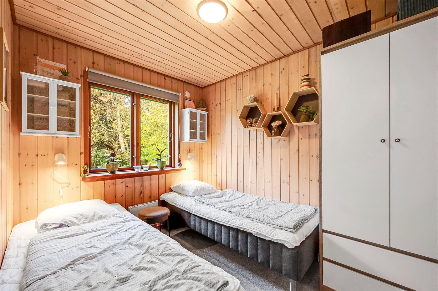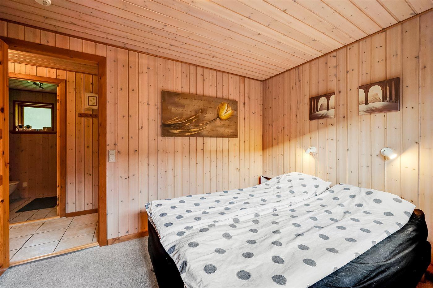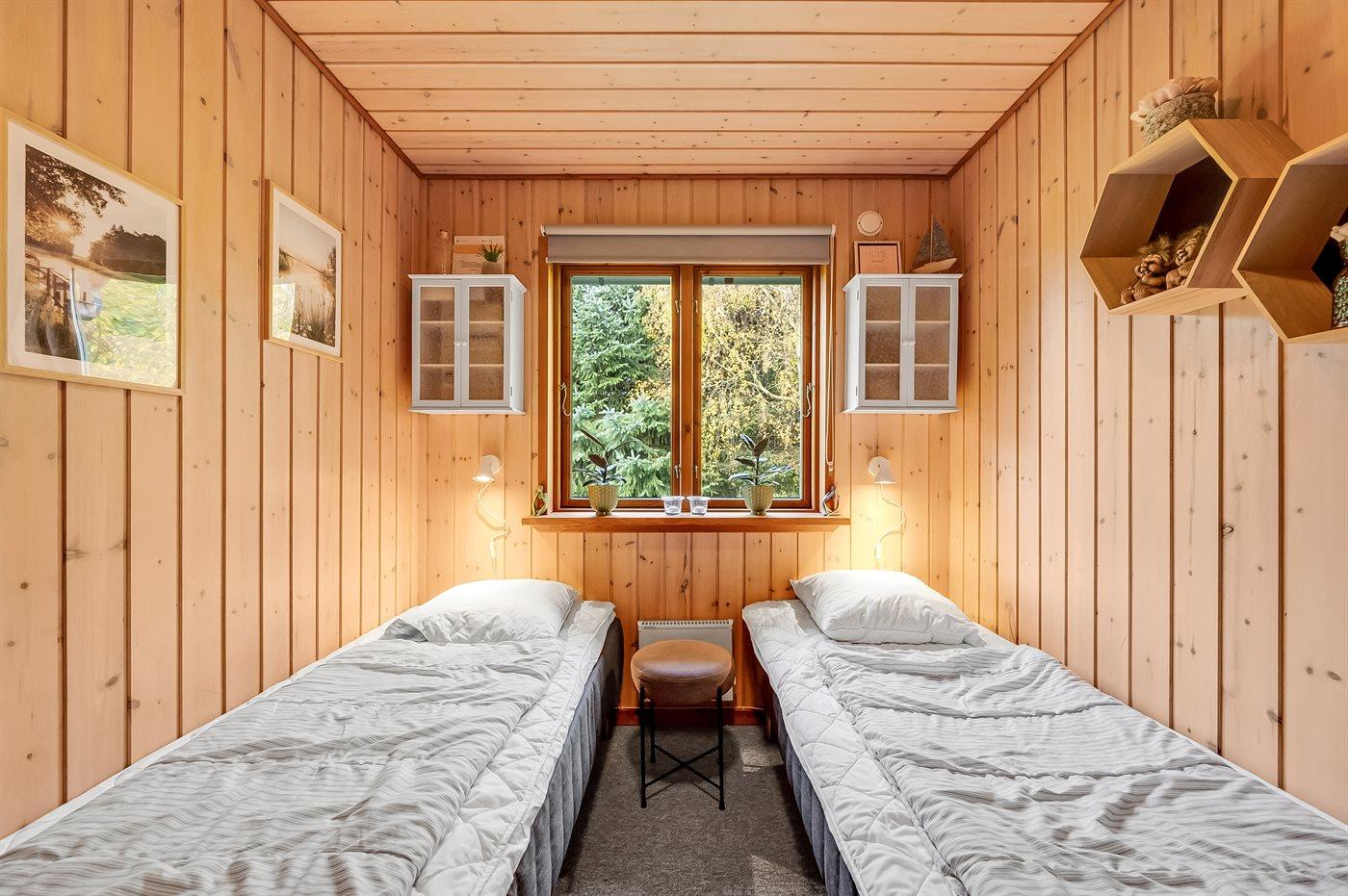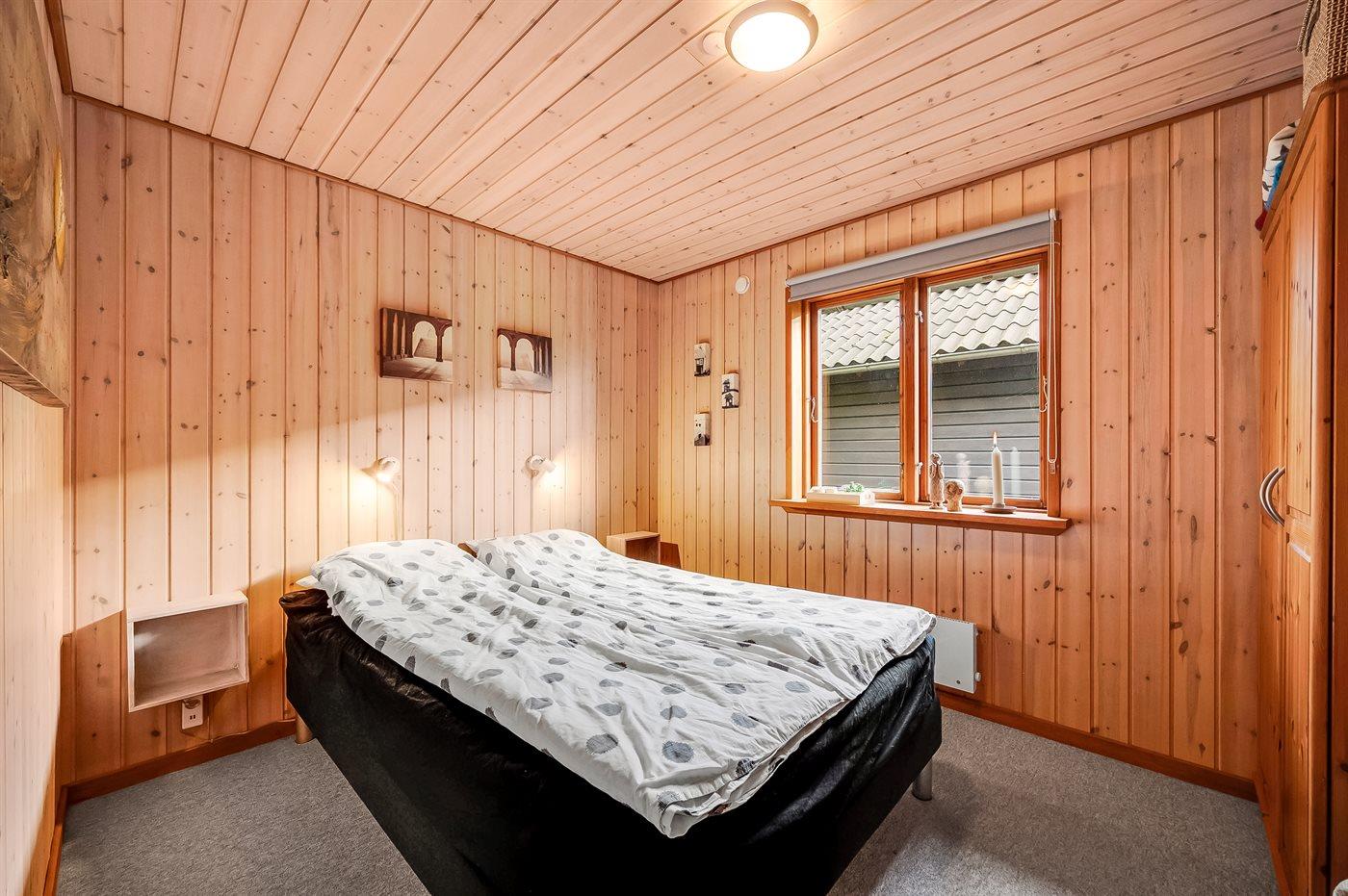 Et soverum med dobbeltseng (140x200 cm) og et med to enkeltsenge (80x190 cm). Begge soverum har skabe. Badeværelset er med muret brusehjørne med forhæng, toilet, håndvask, skabe, vaskemaskine og tørretumbler.