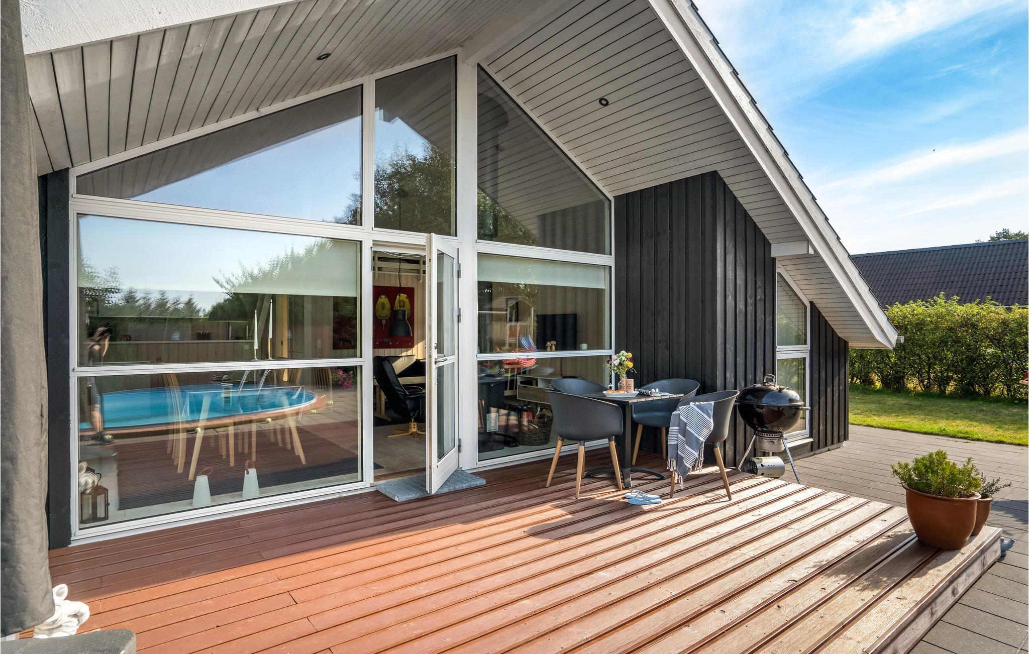 Opholdsstuen fører direkte ud til terrassen og poolen, som byder på badesjov og forfriskende dyp på varme sommerdage. Børnene har også gode underholdningsmulighjed i form af en gynge og en sandkasse.