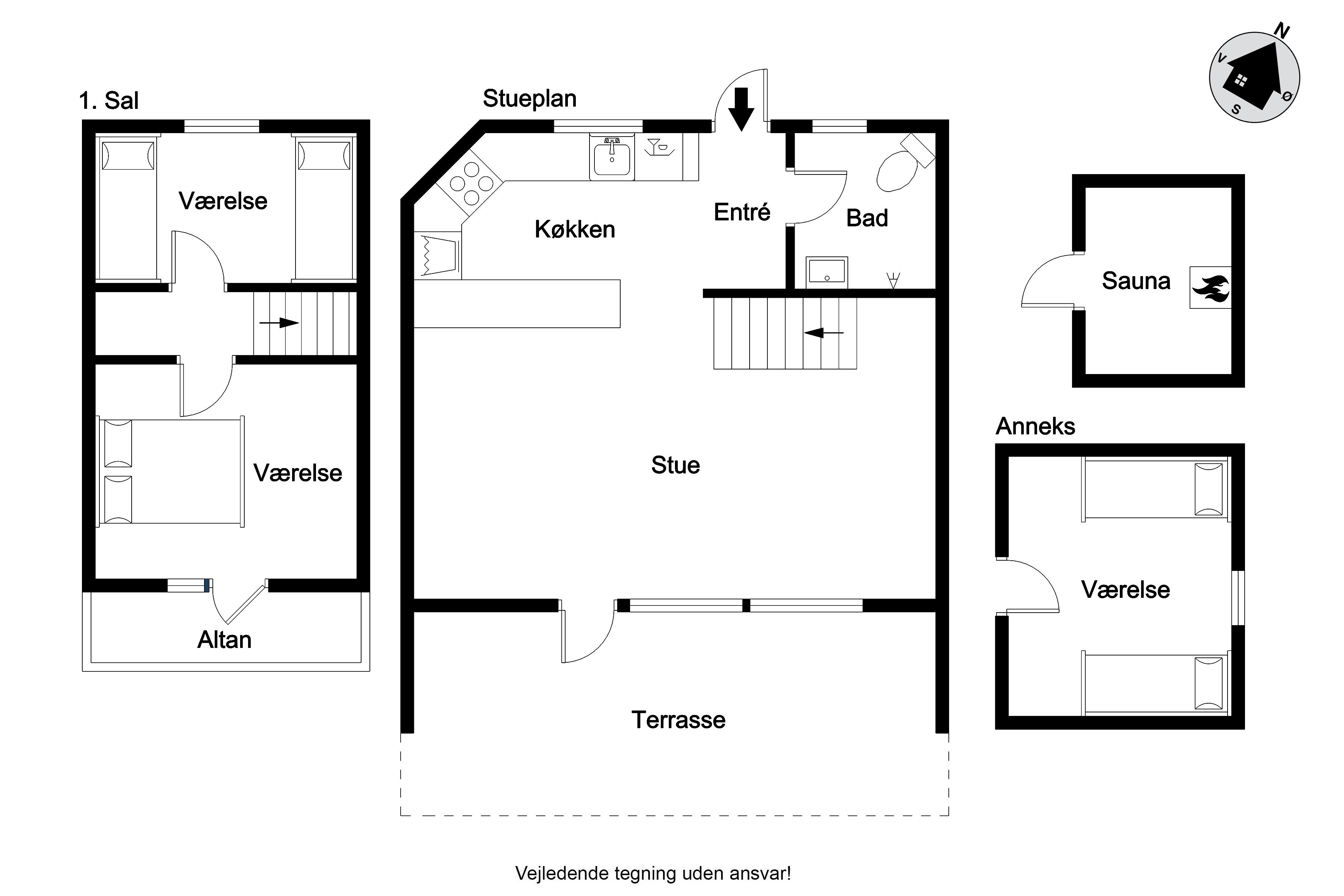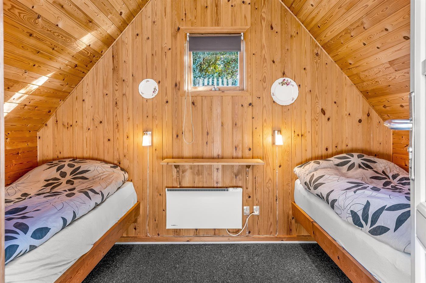 Der er i alt 3 soveværelser. Sovepladserne fordeler sig på: 2 sovepladser i dobbeltseng. 2 sovepladser i enkeltsenge. 2 sovepladser i køjeseng. 2 af disse sovepladser befinder sig i et anneks. Derudover er der 1 stk. barneseng.