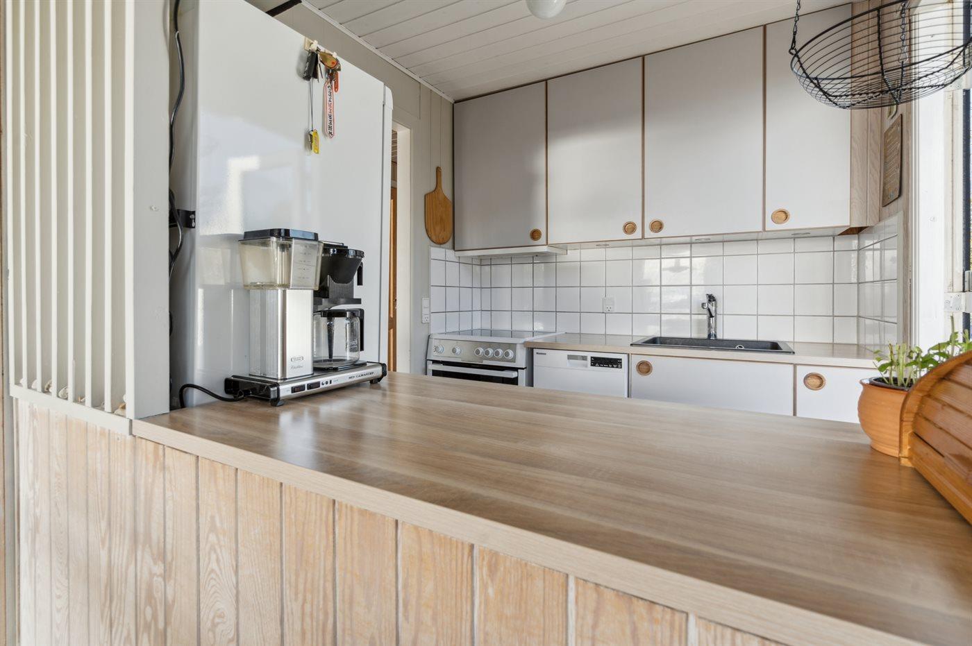 Køkkenet er udstyret med 1 køleskab. Der er 4 keramiske kogeplader, varmluftovn samt opvaskemaskine.