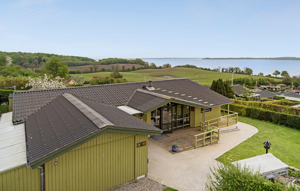 Nyd panoramaudsigt over Aabenraa Fjord fra dette hyggelige træhus tæt på Skarrev Strand.