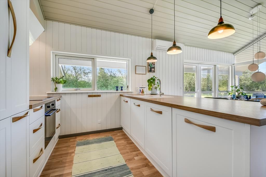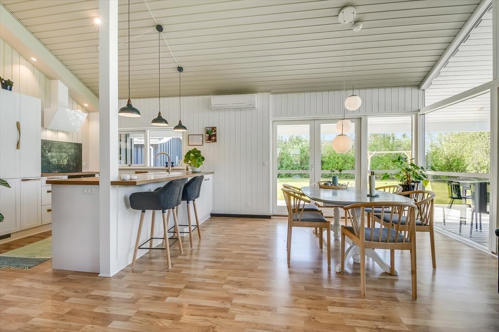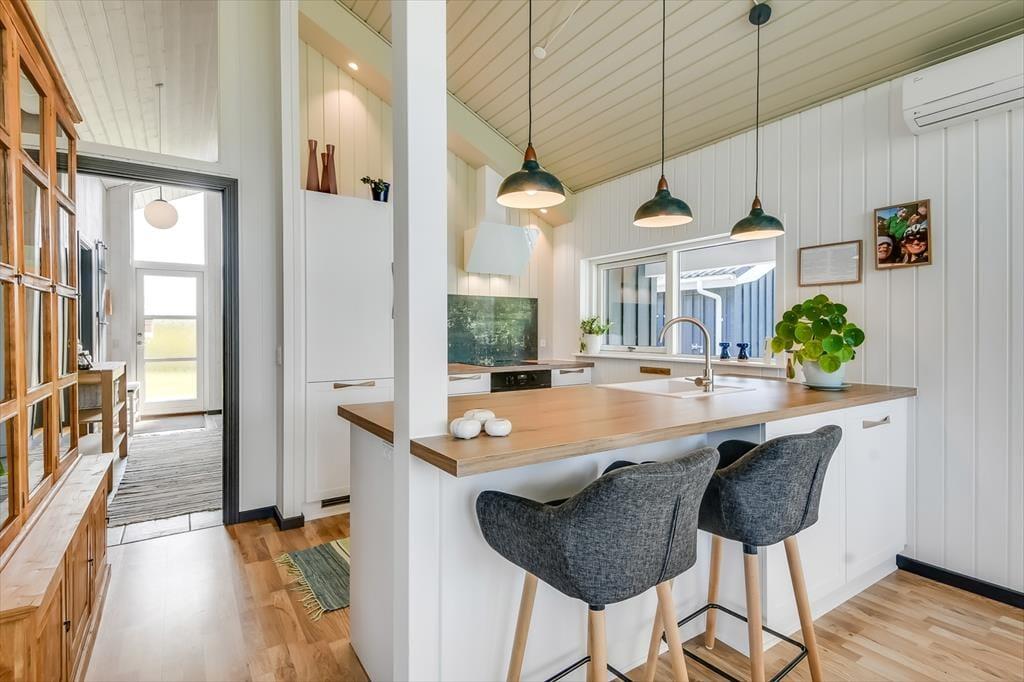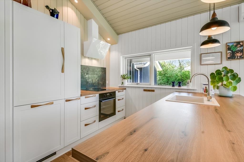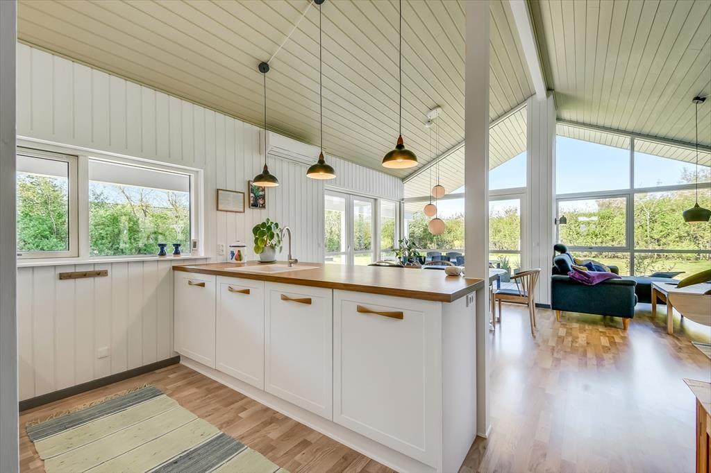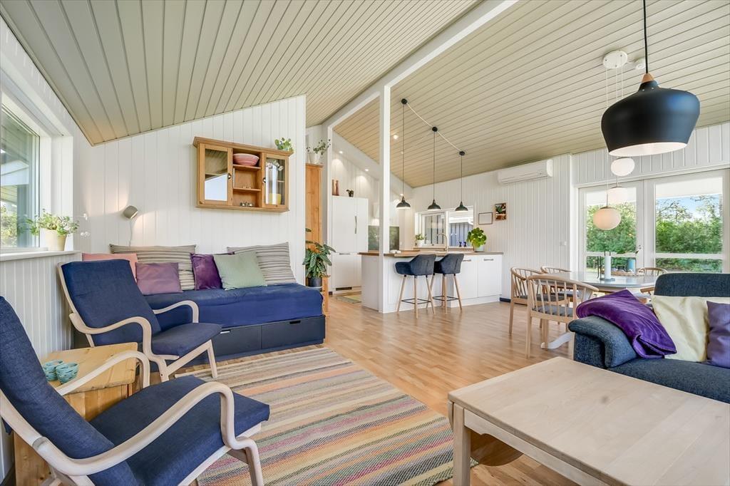 Sommerhuset har med sine 98 m2 god plads til seks feriegæster, og planløsningen sørger for, at alle kan få det rart og komfortabelt – uanset om I hygger jer sammen i opholdsafdelingen eller sover sødt på de tre soveværelser. Selv på badeværelset er der skruet op for velværen, for her står et spabad og en sauna klar til familiens livsnydere. I samme omgang er det værd at bemærke, at stuen er udstyret med en god sofa, bløde lænestole og en dejlig briks, så hvis I alle vil slænge jer med bøger, film eller krydsogtværser, kan det sagtens lade sig gøre. I det åbne køkken kan du forkæle de andre ved at trylle et lækkert måltid frem, og alt efter vejret kan I afgøre, om maden skal serveres ved spisebordet eller ude på den tilstødende terrasse.