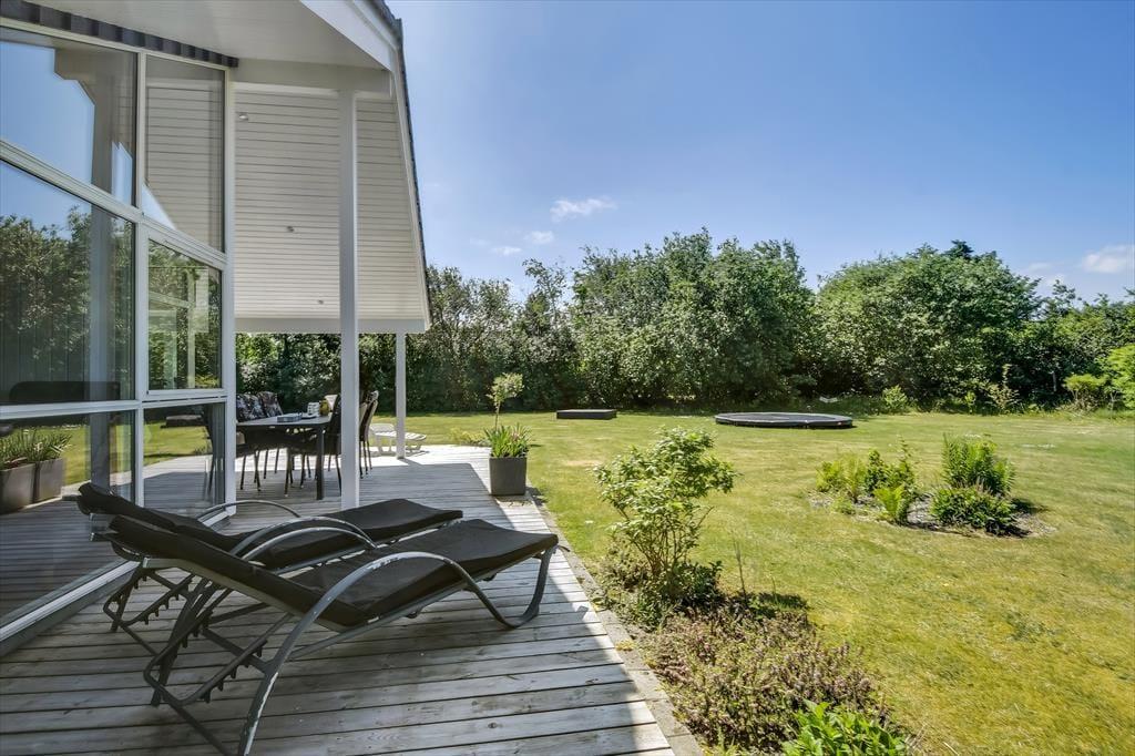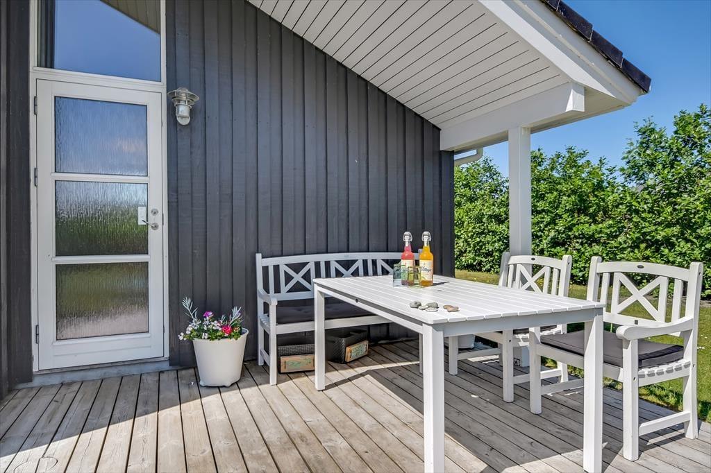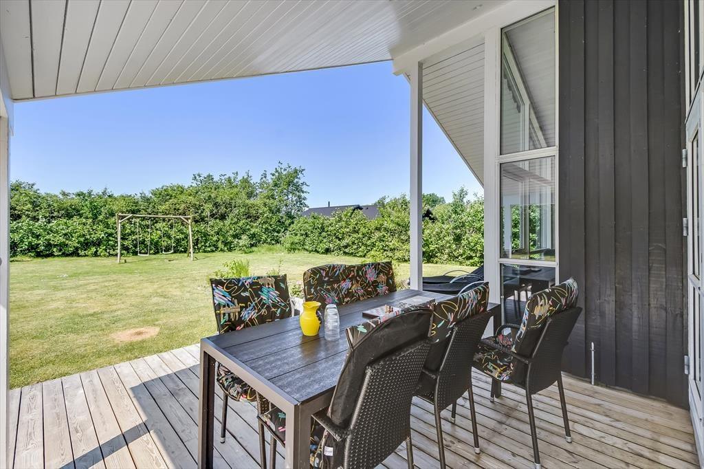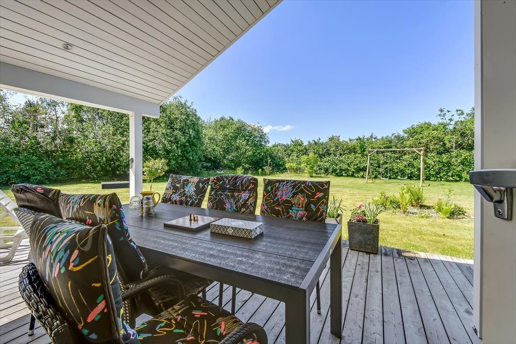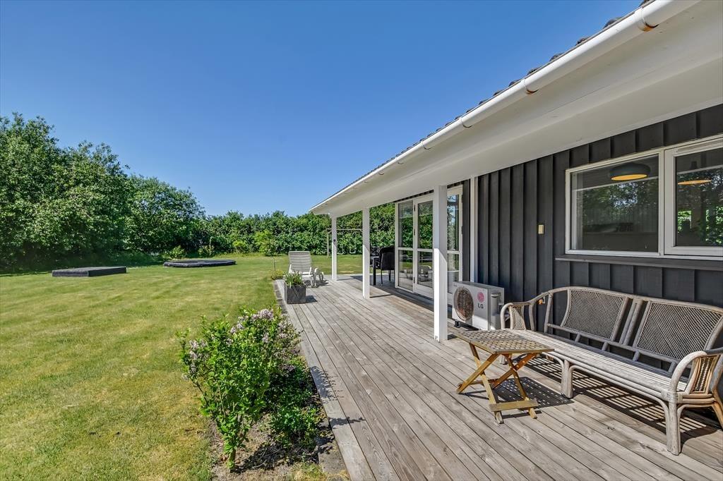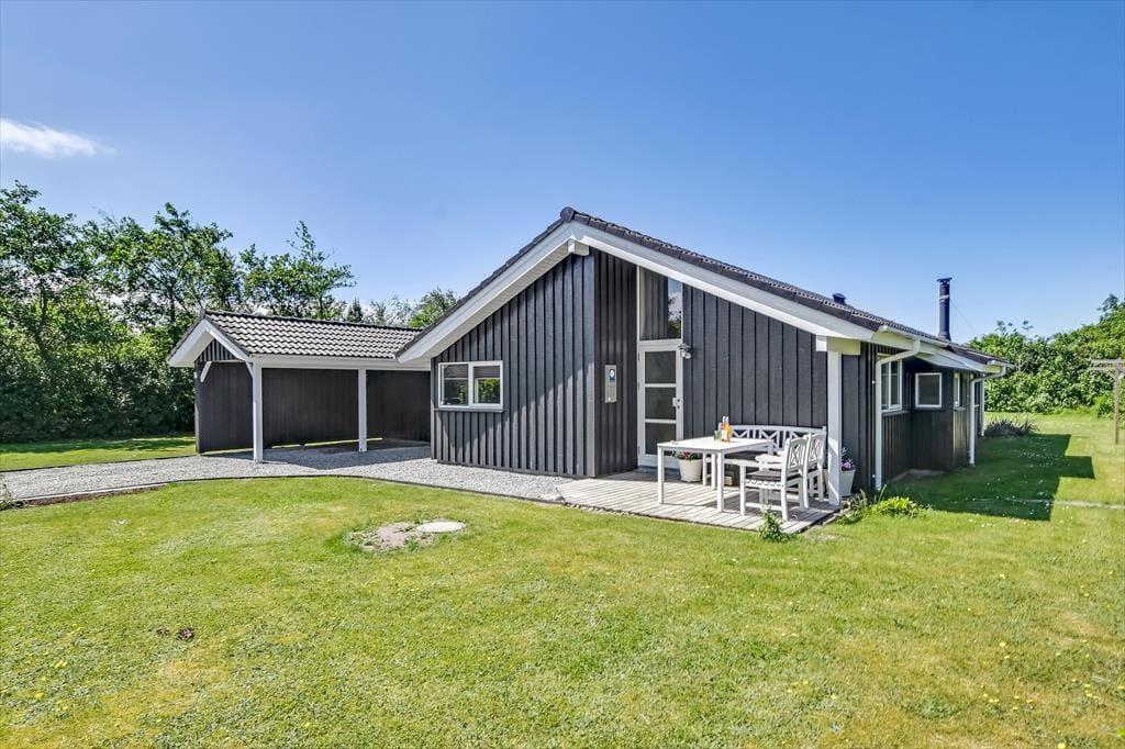 Rundt om sommerhuset breder flere dejlige terrasser sig, så det er ingen sag at finde en dejlig opholdsplads med skygge eller sol alt efter dit humør. Fra den sydvestvendte og delvist overdækkede terrasse har du et godt overblik over baghaven, hvor børnene kan gynge, hoppe på trampolin og lege i sandkassen – og hvis de kan overtale de voksne til en dyst i vikingespil, kan I alle vise, hvad I dur til på græsplænen. Til bilen er der carport, og der er også plads i den grusbelagte indkørsel, hvis I har inviteret bedsteforældre eller venner med på ferie.