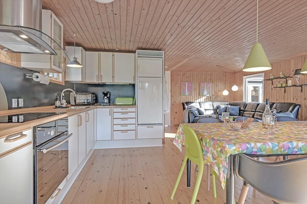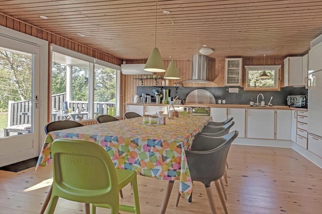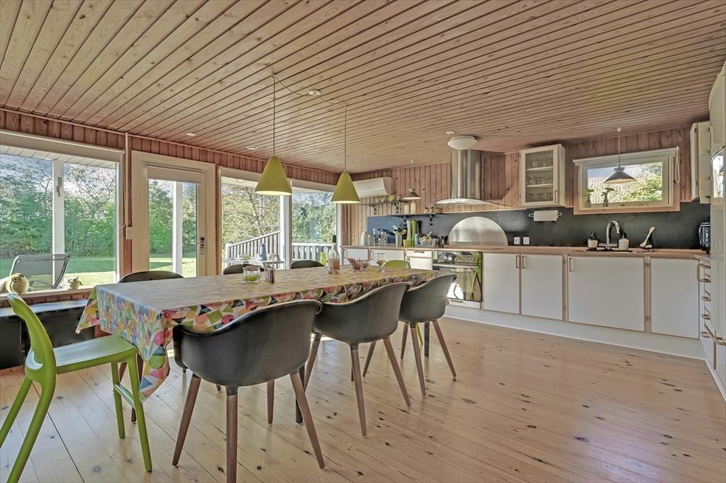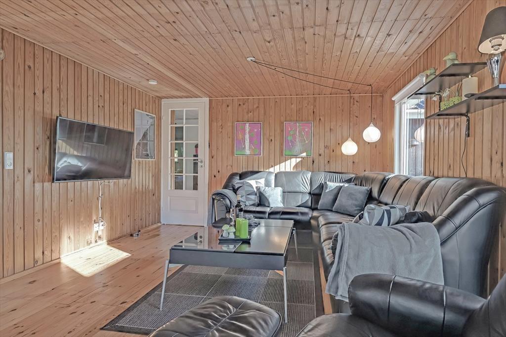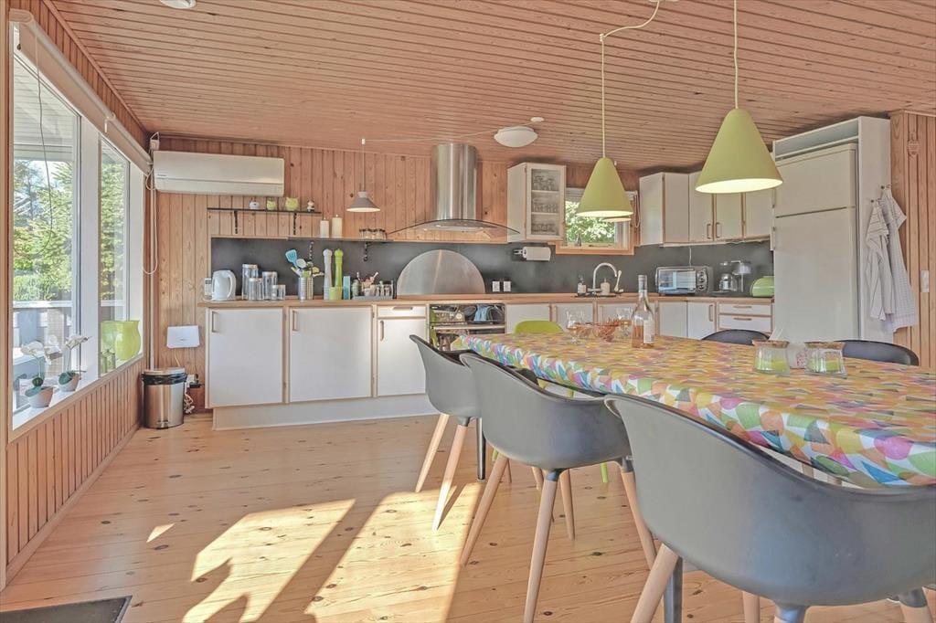 Indenfor mødes du af et lyst og indbydende opholdsrum, hvor feriedagene naturligt samler sig. Her er god plads til både morgenstunder med kaffe ved spisebordet og rolige aftener med spil, grin og afslapning. Lyset strømmer ind gennem vinduerne og skaber en behagelig atmosfære, mens den åbne indretning giver en afslappet fornemmelse af at være sammen – uden at alle skal lave det samme.