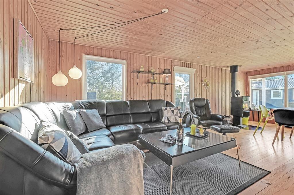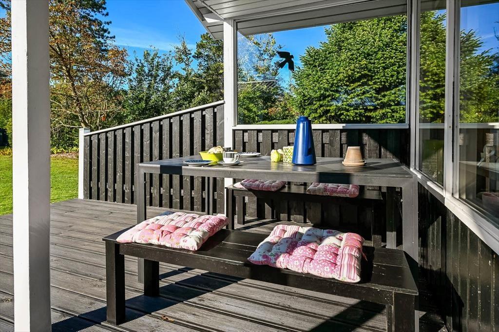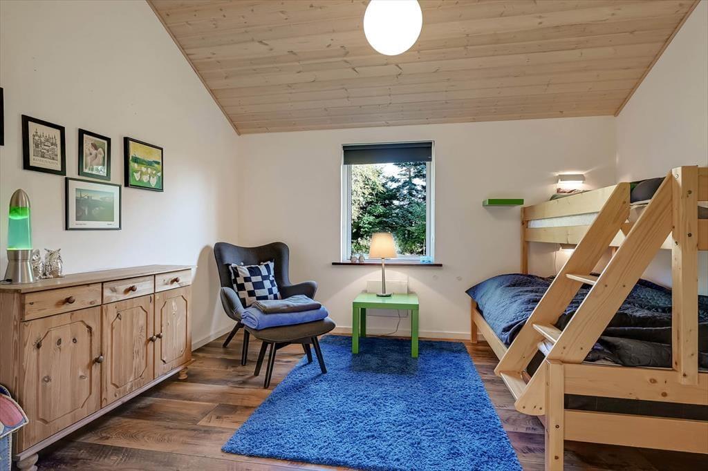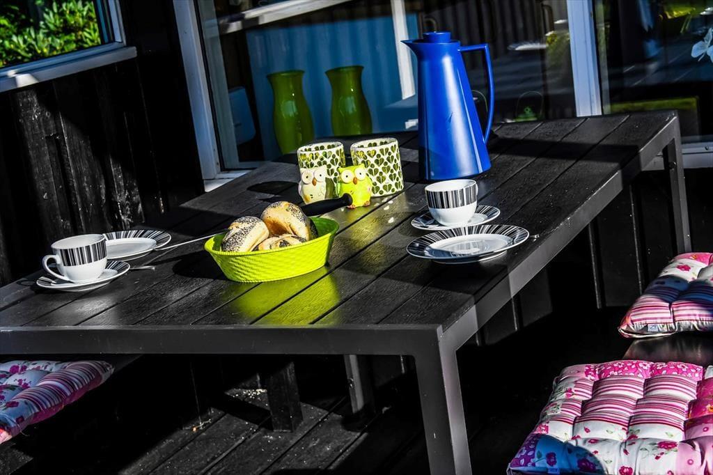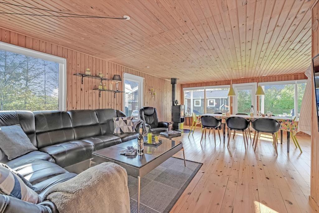 Indenfor mødes du af et lyst og indbydende opholdsrum, hvor feriedagene naturligt samler sig. Her er god plads til både morgenstunder med kaffe ved spisebordet og rolige aftener med spil, grin og afslapning. Lyset strømmer ind gennem vinduerne og skaber en behagelig atmosfære, mens den åbne indretning giver en afslappet fornemmelse af at være sammen – uden at alle skal lave det samme.