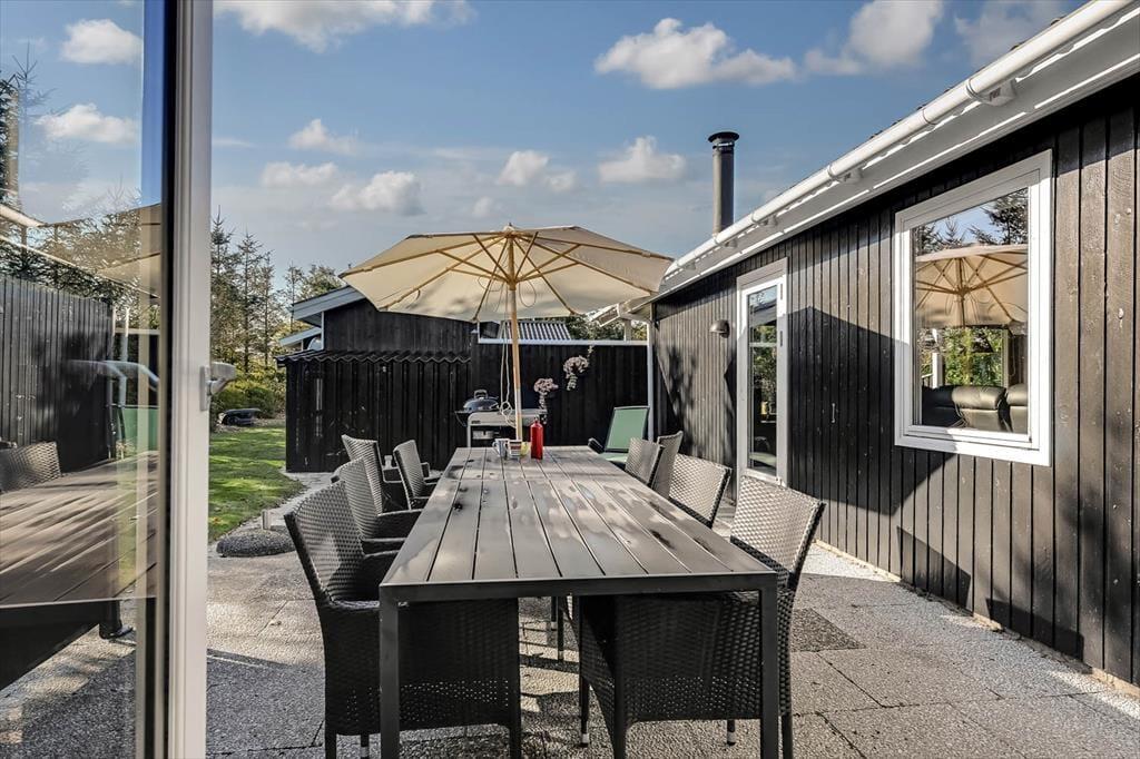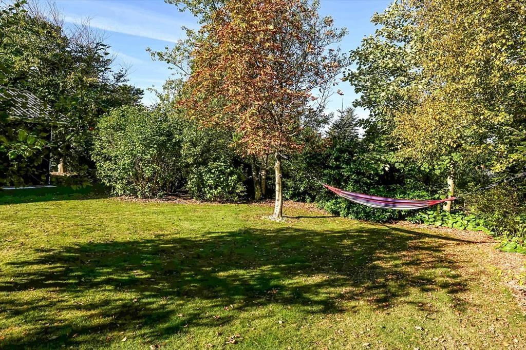 Træd ud i den grønne have, hvor haven omkranset af træer og buske giver jer en helt særlig følelse af privatliv og fred. Her kan I høre fuglene synge højt fra morgenen af, mens solen langsomt rammer terrassen, og der er gode muligheder for at finde netop den plet, der passer til dagens humør. De mange små hyggekroge rundt om huset indbyder til både stille stunder med en bog, leg på græsset eller lange eftermiddage med en kølig forfriskning i hånden. Uanset om I søger skygge eller sol, er der altid et dejligt sted at slå sig ned – og aftensmaden smager lige lidt bedre, når den nydes i den friske, vestjyske luft. Her er virkelig rum til at trække vejret og være til stede i nuet.