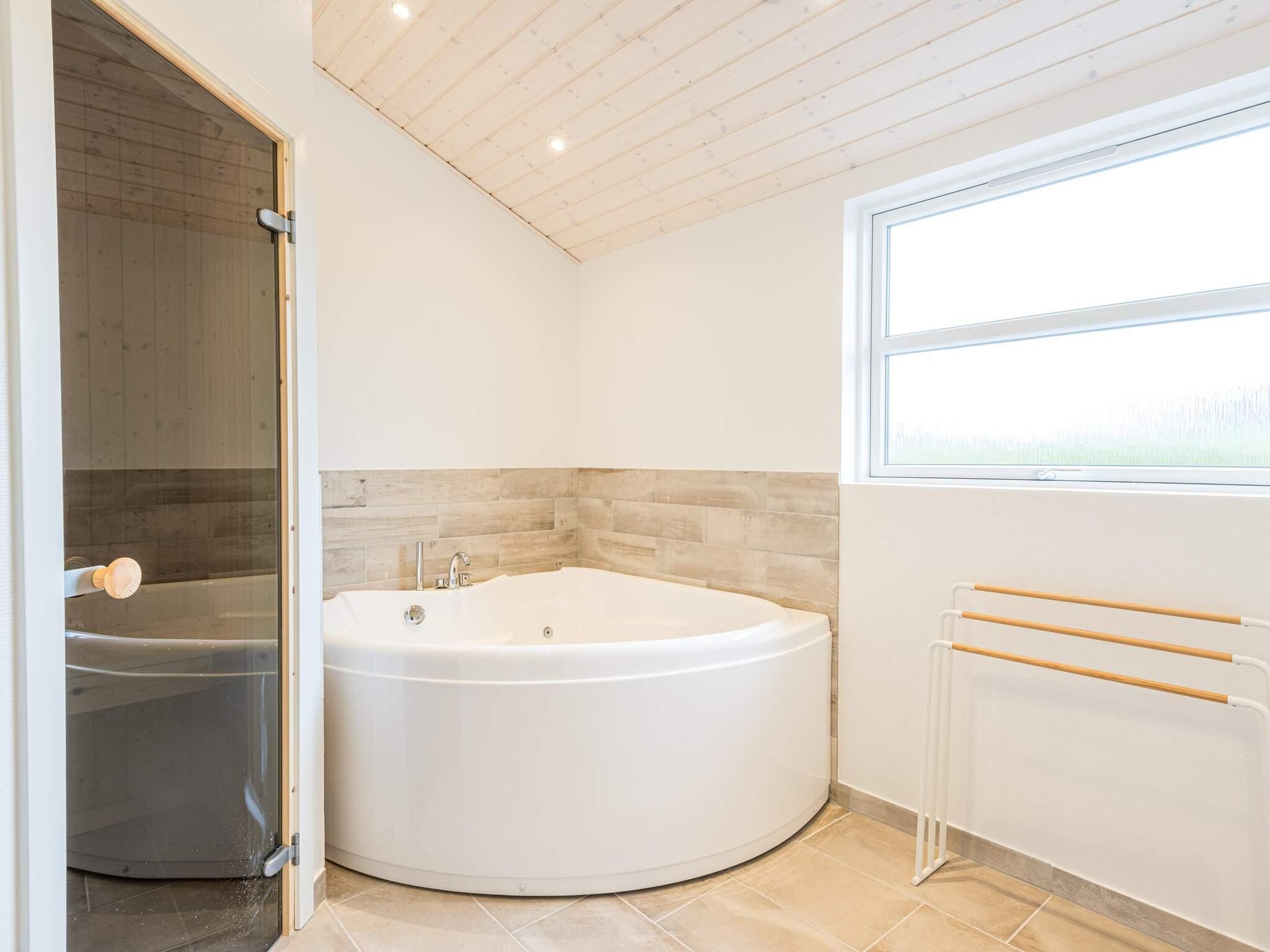 Sommerhuset har tre rummelige soveværelser, alle med dobbeltsenge, og to funktionelle badeværelser, hvoraf det største er udstyret med både spabad og sauna. Entréen har både vaskemaskine og tørretumbler.