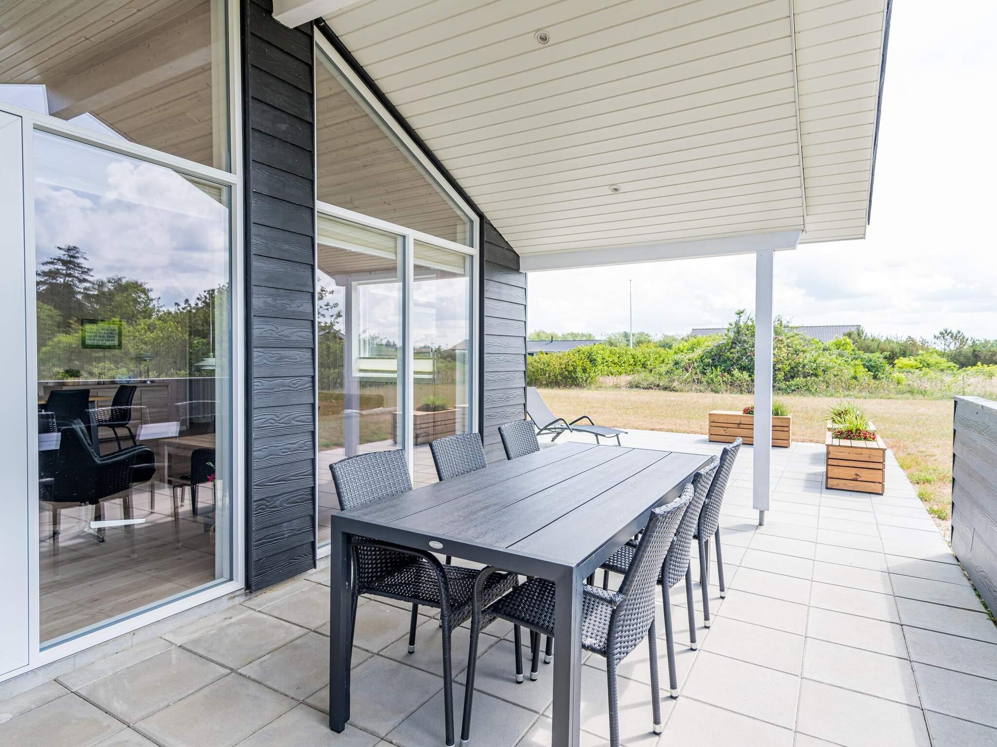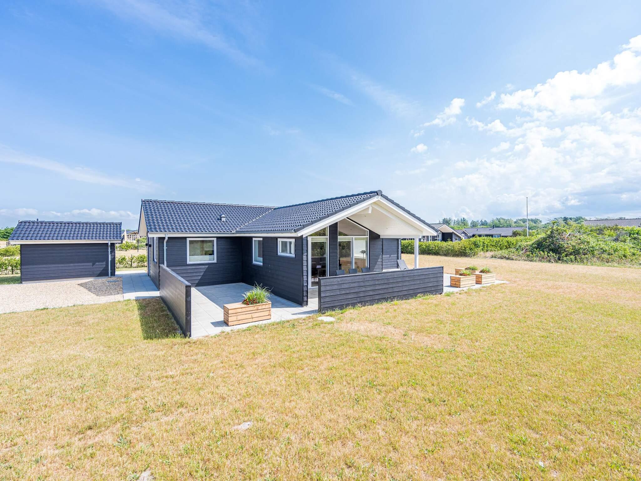 Lyst og moderne feriehus beliggende på dejlig grund i Skaven Strand. Sommerhuset stod færdigt i 2022 og er rummeligt og indbydende overalt. Stue, spisestue og køkken er i åbent plan, og stuen har desuden direkte udgang til en dejlig, delvist overdækket terrasse med havemøbler og liggestole.