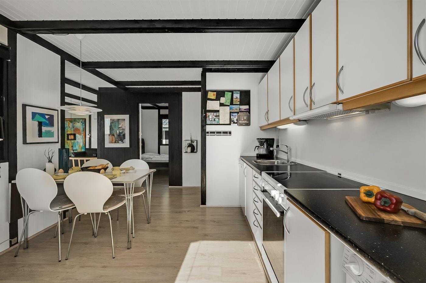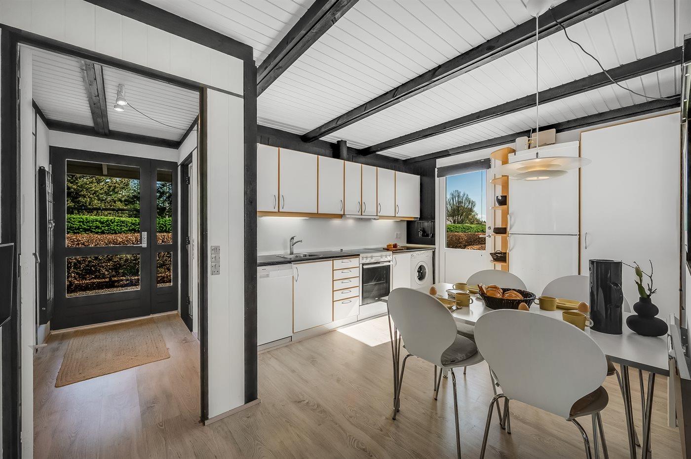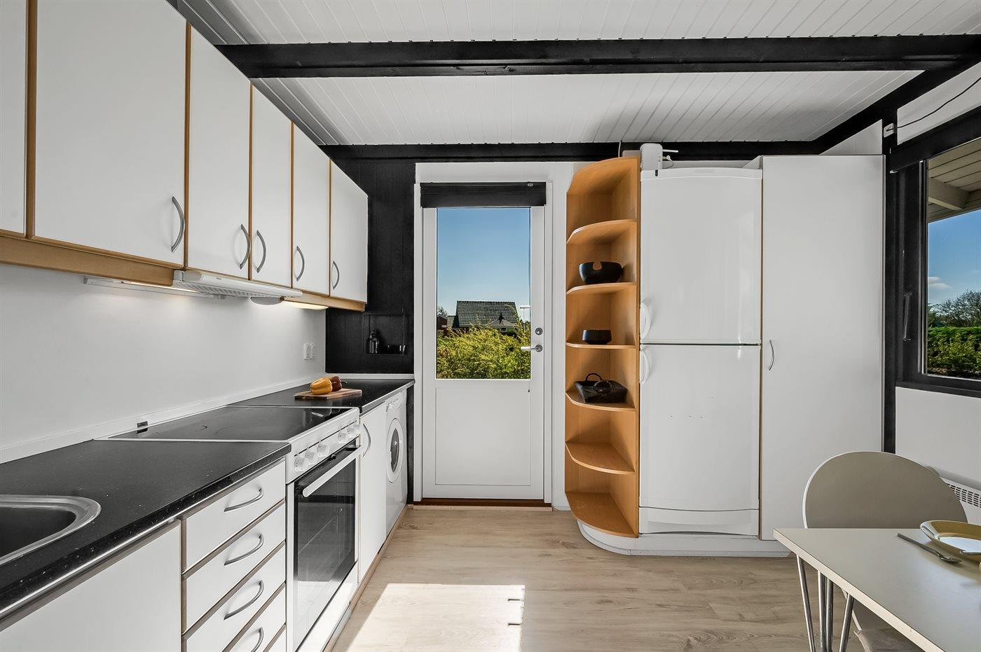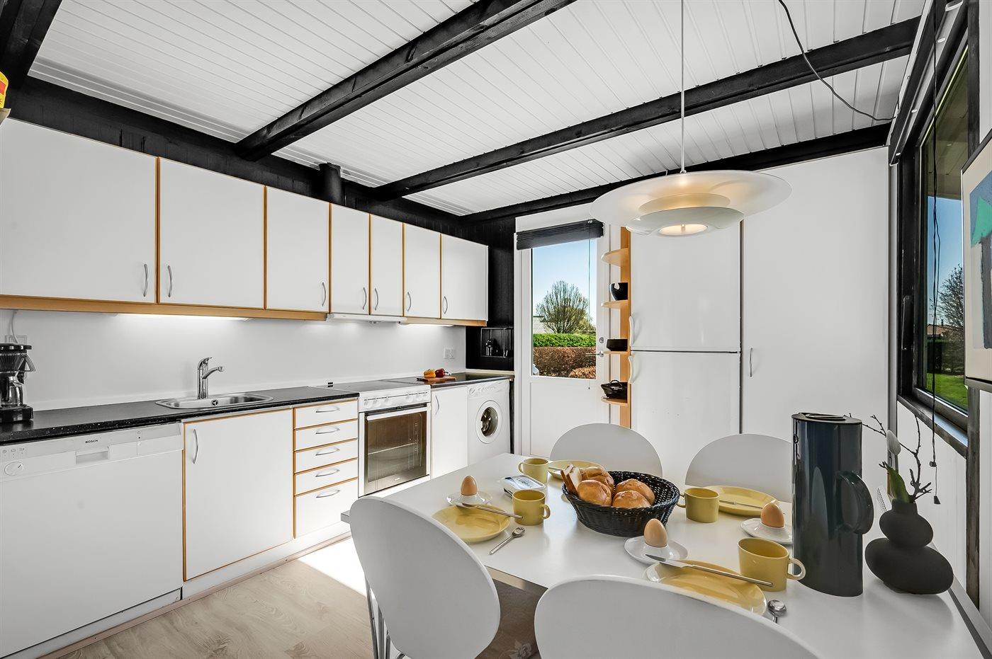 Køkkenet er udstyret med 1 køleskab. Der er 4 elkogeplader, bageovn, mikrobølgeovn samt opvaskemaskine.