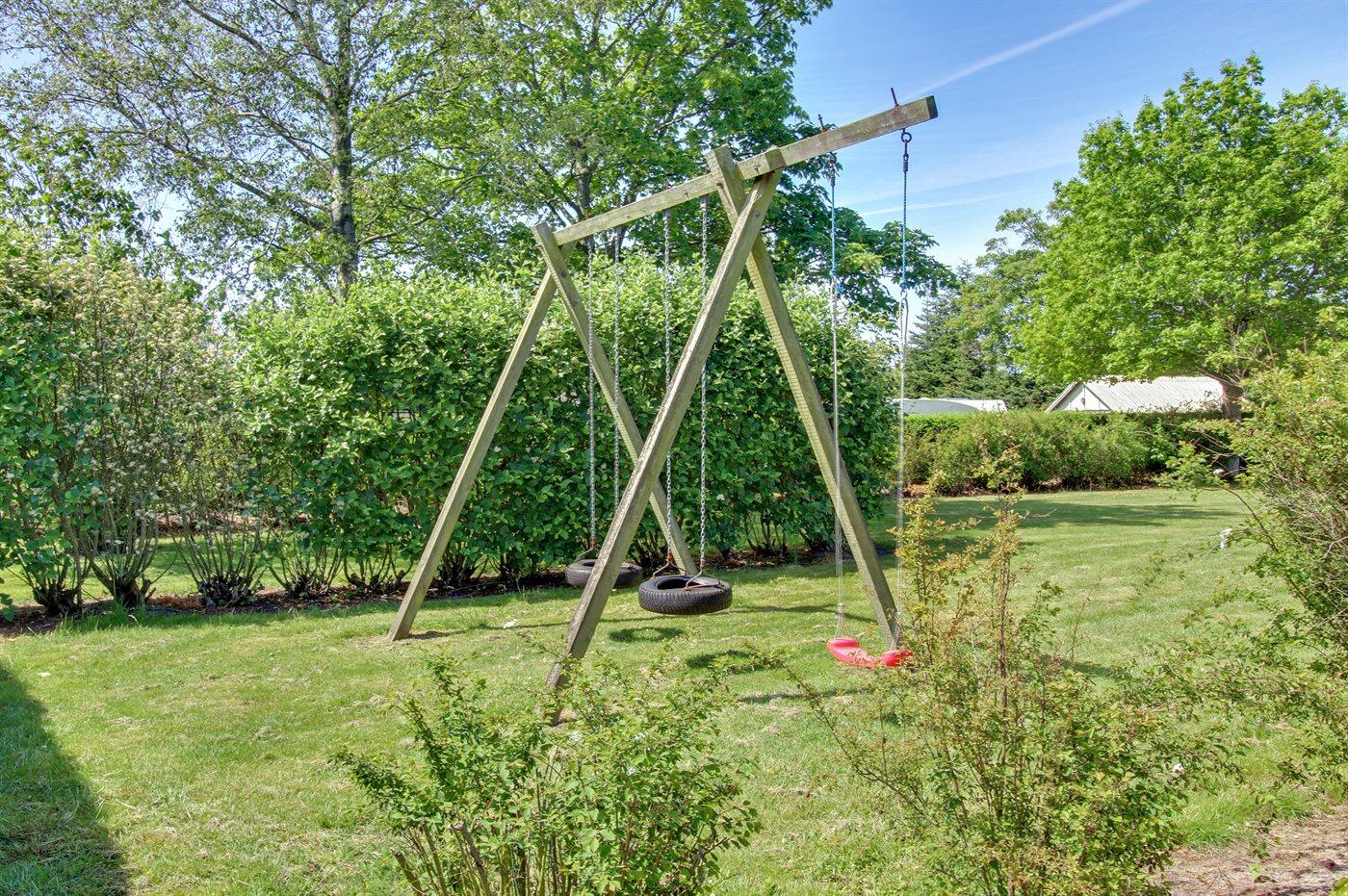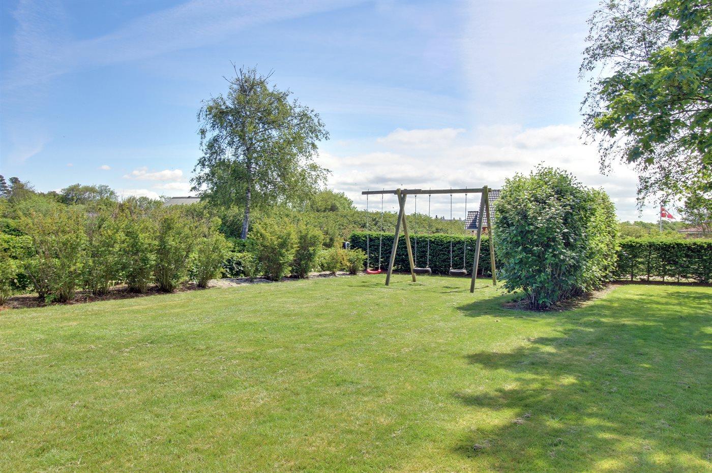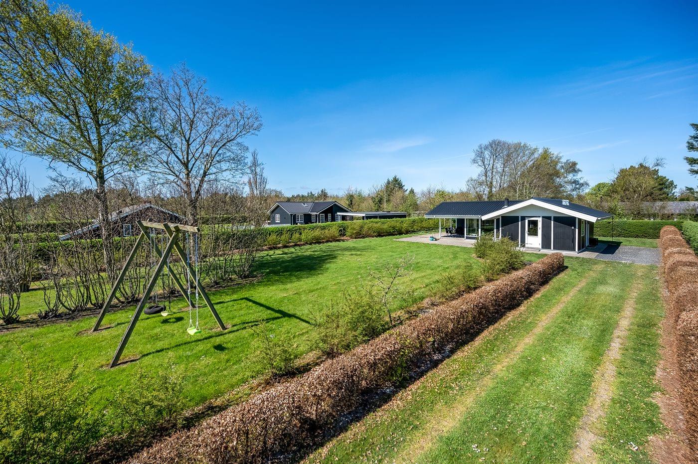 Ferieboligen er beliggende på en 1100 m² stor naturgrund. Der er 12500 m til havet. Der er 350 m til fjorden. Nærmeste forretning er beliggende i en afstand af 1000 m. Til ferieboligen hører 110 m² terrasseareal. Desuden er der 10 m² overdækket terrasse. Der er redskabsrum. Gynge. Parkering ved ferieboligen.