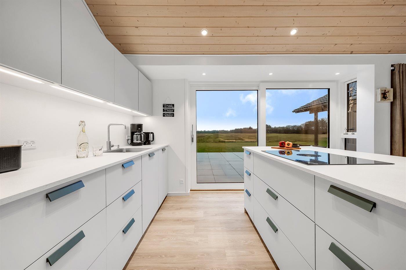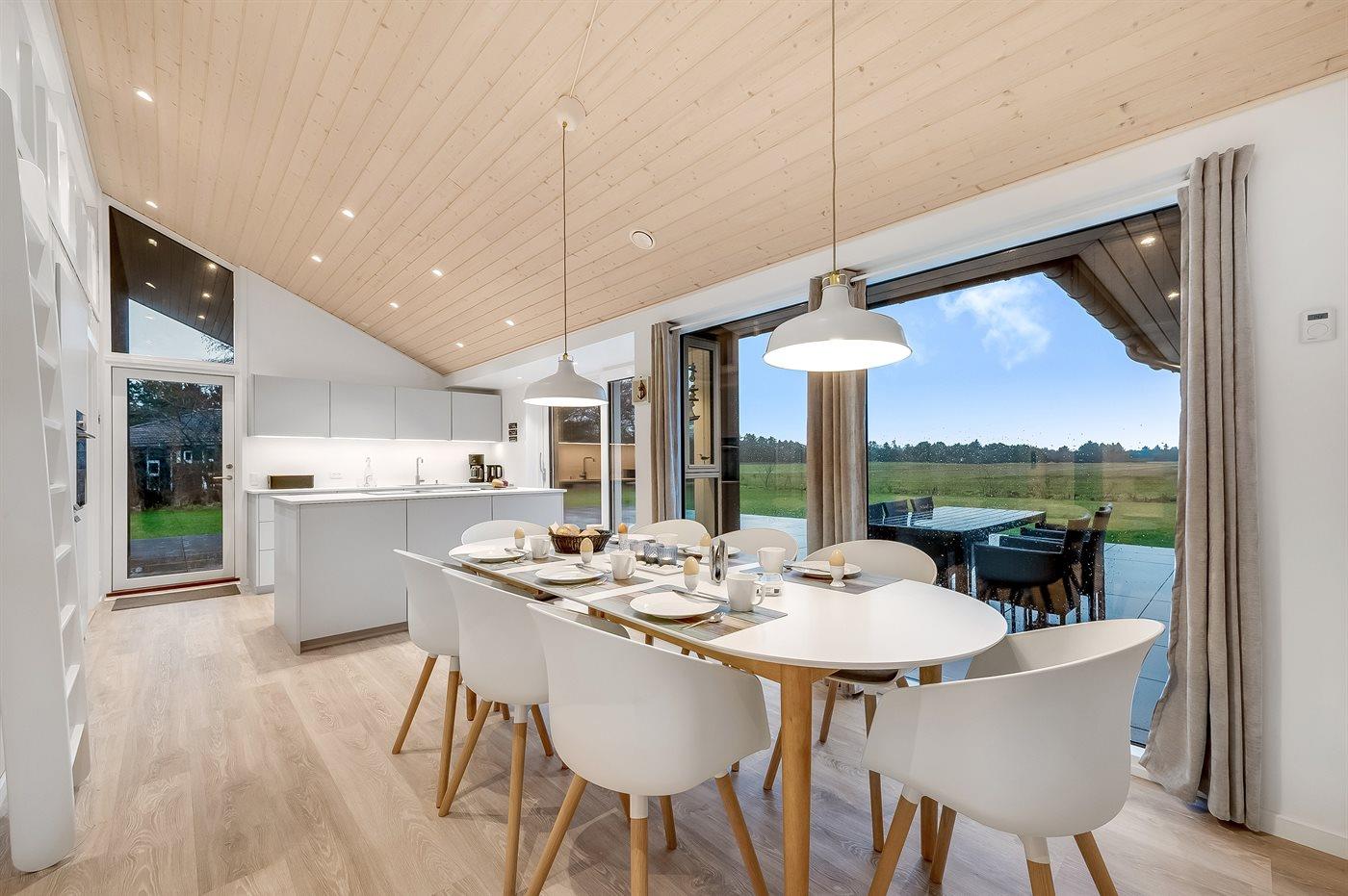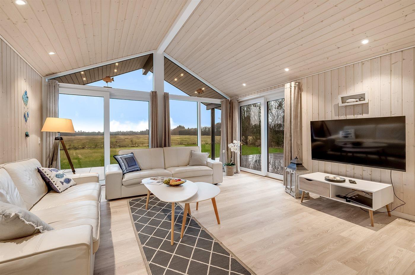 Sommerhuset er smukt indrettet og bygget i de lækreste materialer med sans for detaljen, og her er god plads at boltre sig på. Fra det store og hyggelige køkken-alrum er der den smukkeste udsigt over markerne via de store panoramavinduer, og her kommer harer, ræve og rådyr ofte på besøg.