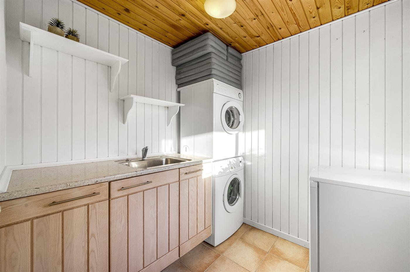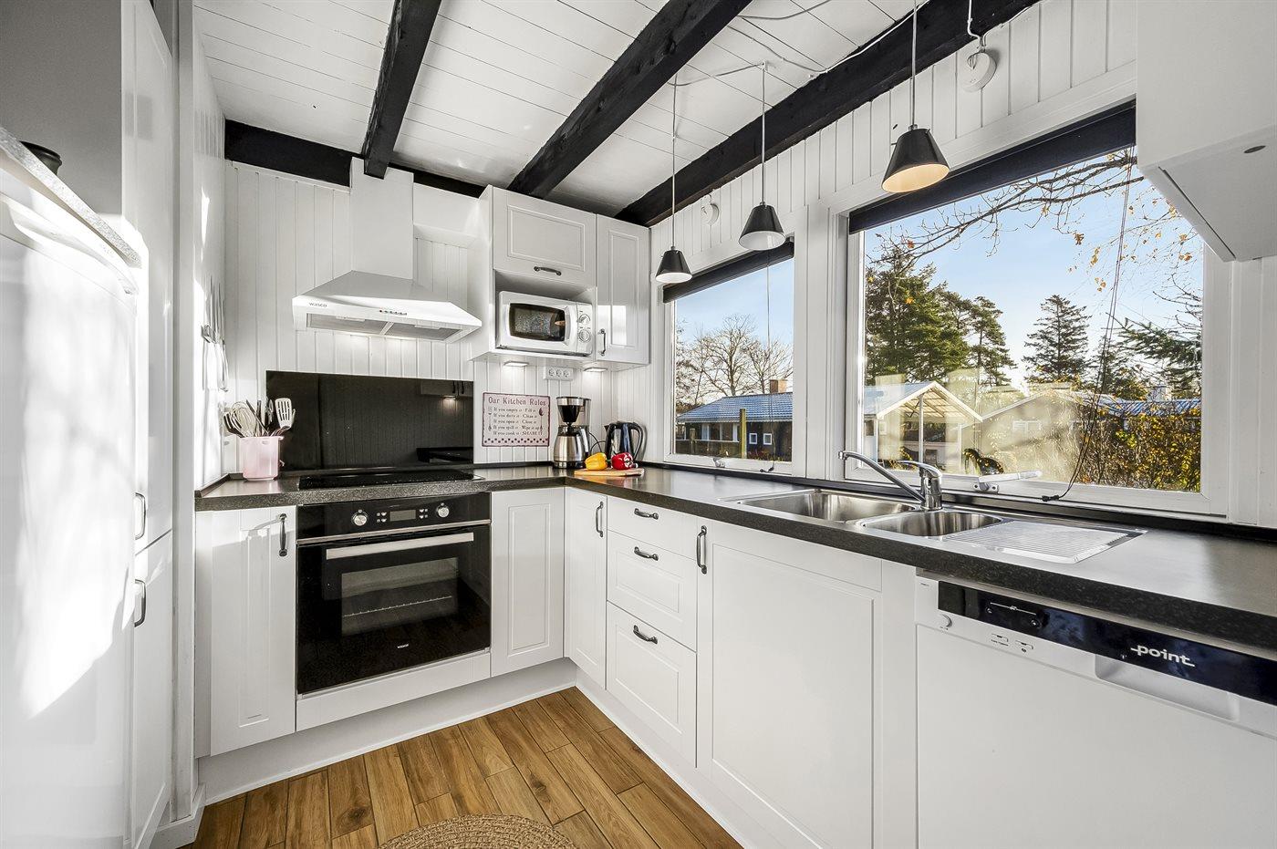 Køkkenet er udstyret med 1 køleskab. Der er 4 keramiske kogeplader, varmluftovn, mikrobølgeovn, Airfryer samt opvaskemaskine.