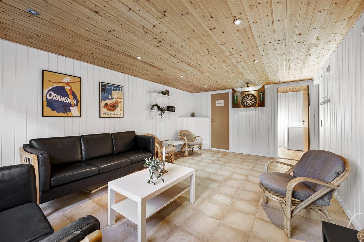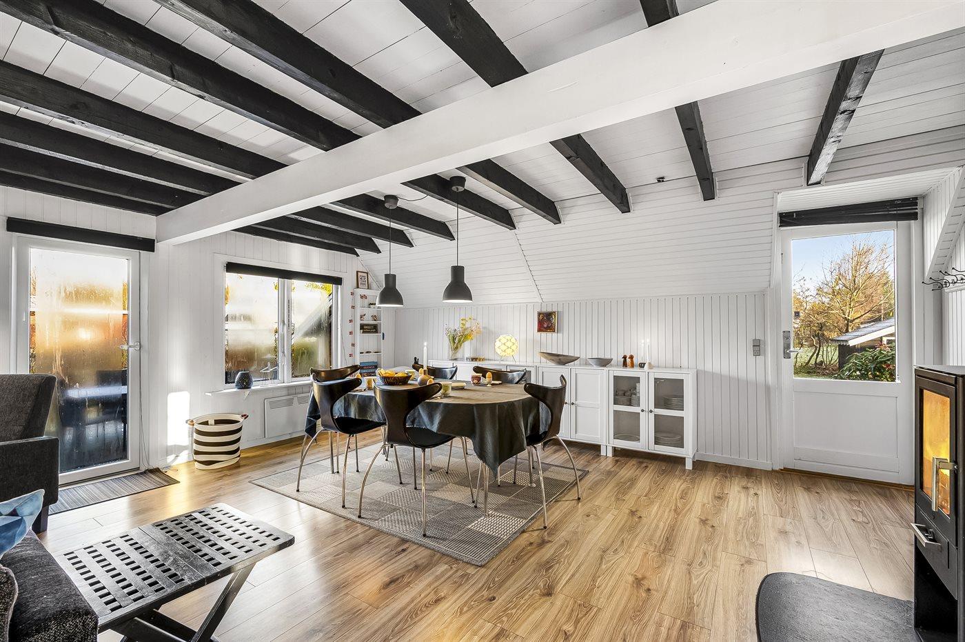Huset er bl.a. indrettet med et køkken, som er integreret med stuen, hvor en centralt placeret brændeovn skaber varme og atmosfære. Der findes også der et lille aktivitetsrum ved siden af sommerhuset.