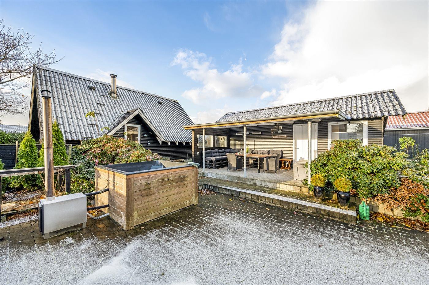 Den hyggelige grund byder på flere dejlige terrasser, herunder en skøn overdækket terrasse. Desuden findes der et vildmarkskar og flere små hyggekroge.