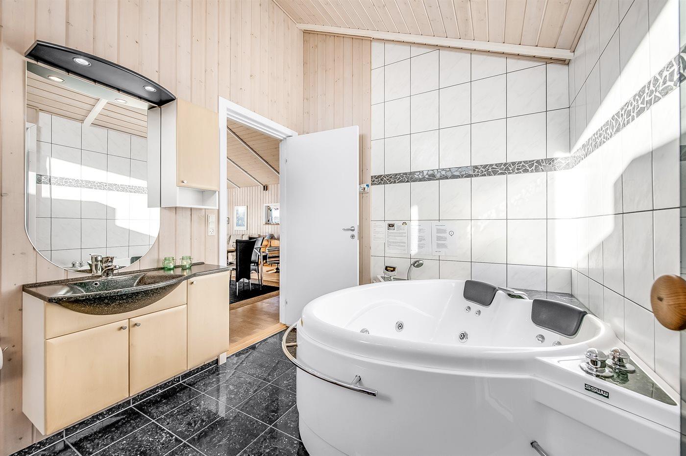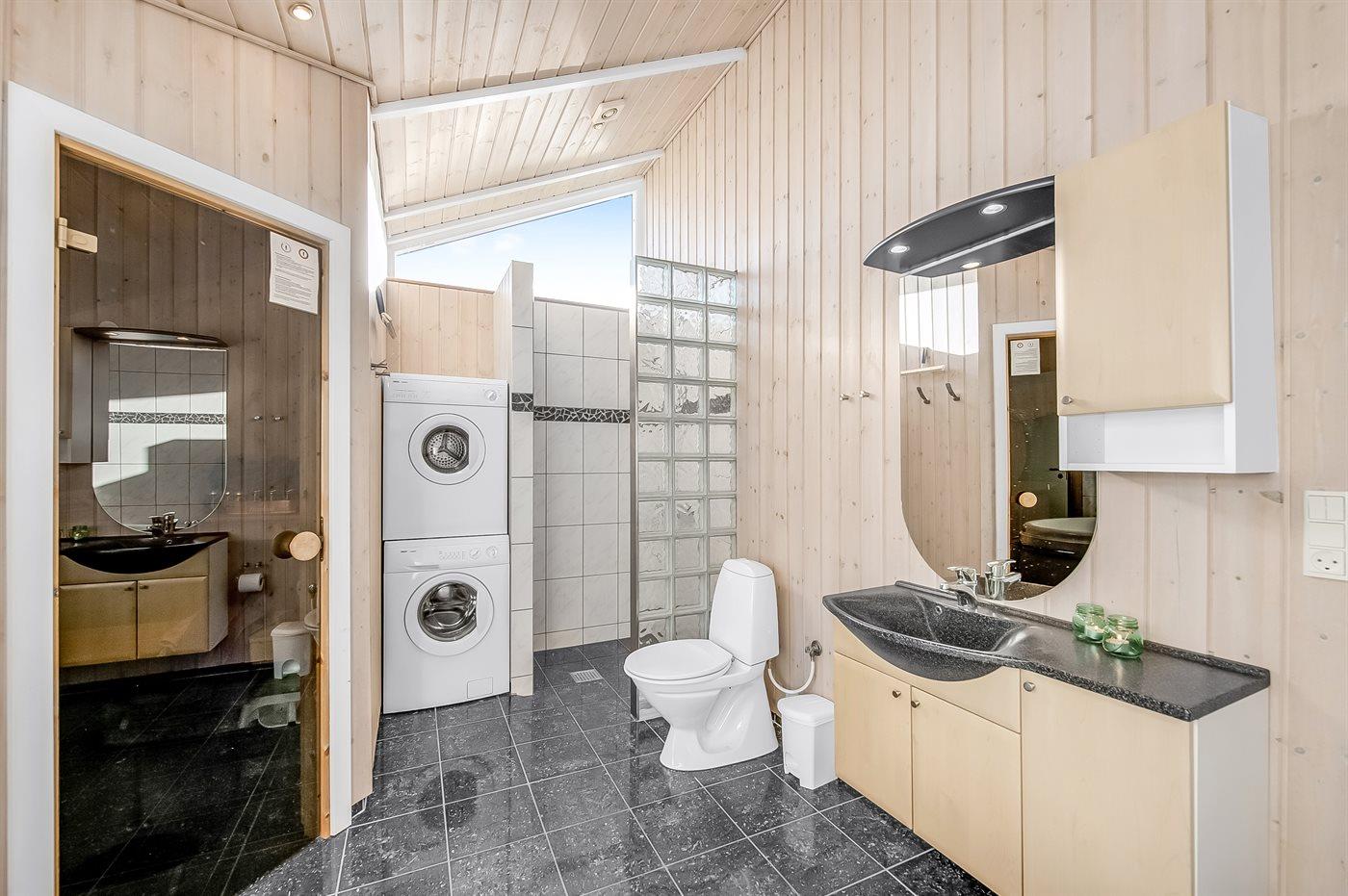 Der er 1 badeværelse med bruseniche og 1 toilet.. Der er gulvvarme på 1 badeværelse. I saunaen er der mulighed for afslapning.