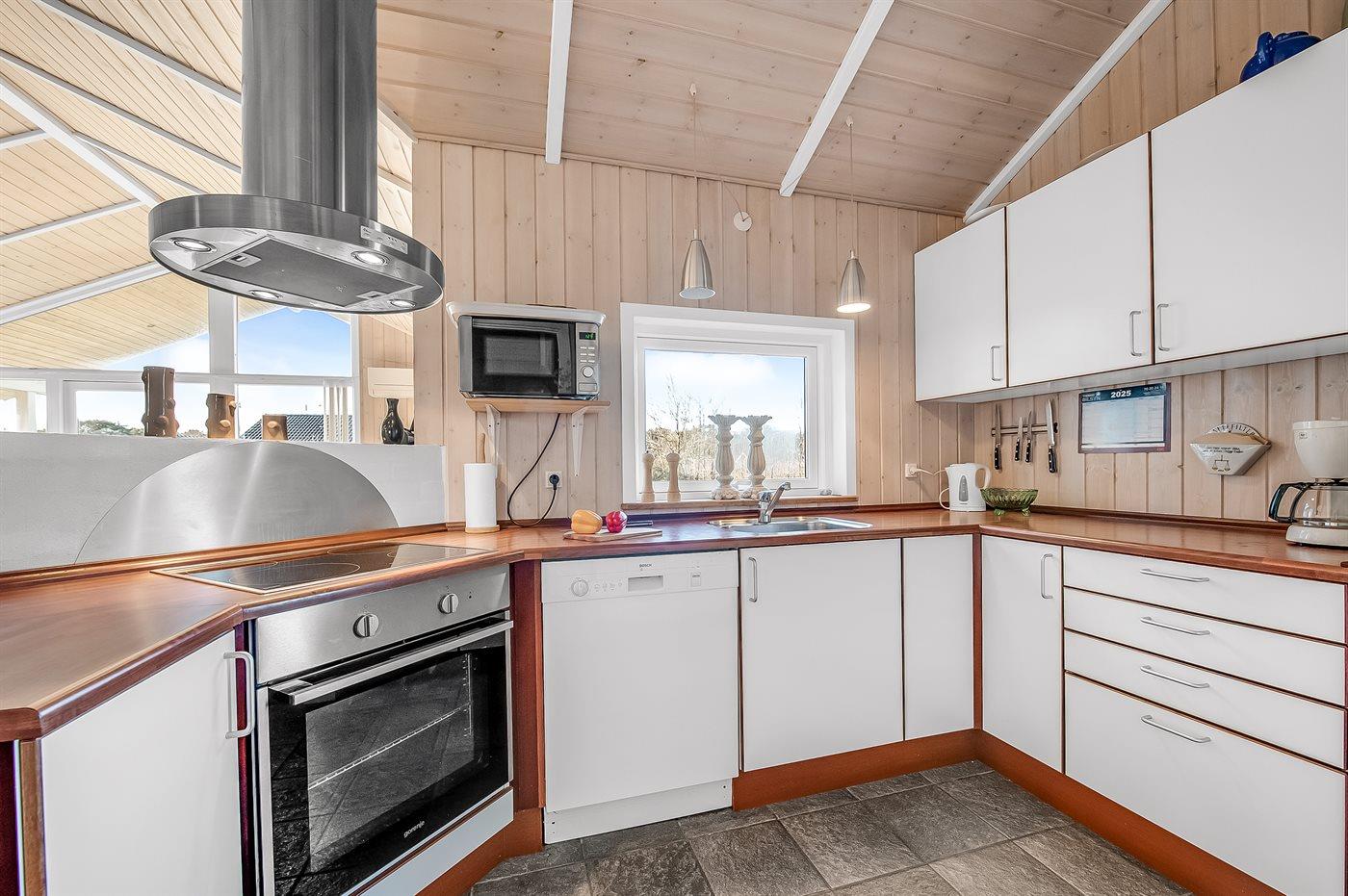 Køkkenet er udstyret med 1 køleskab. Der er 4 keramiske kogeplader, varmluftovn, mikrobølgeovn samt opvaskemaskine.