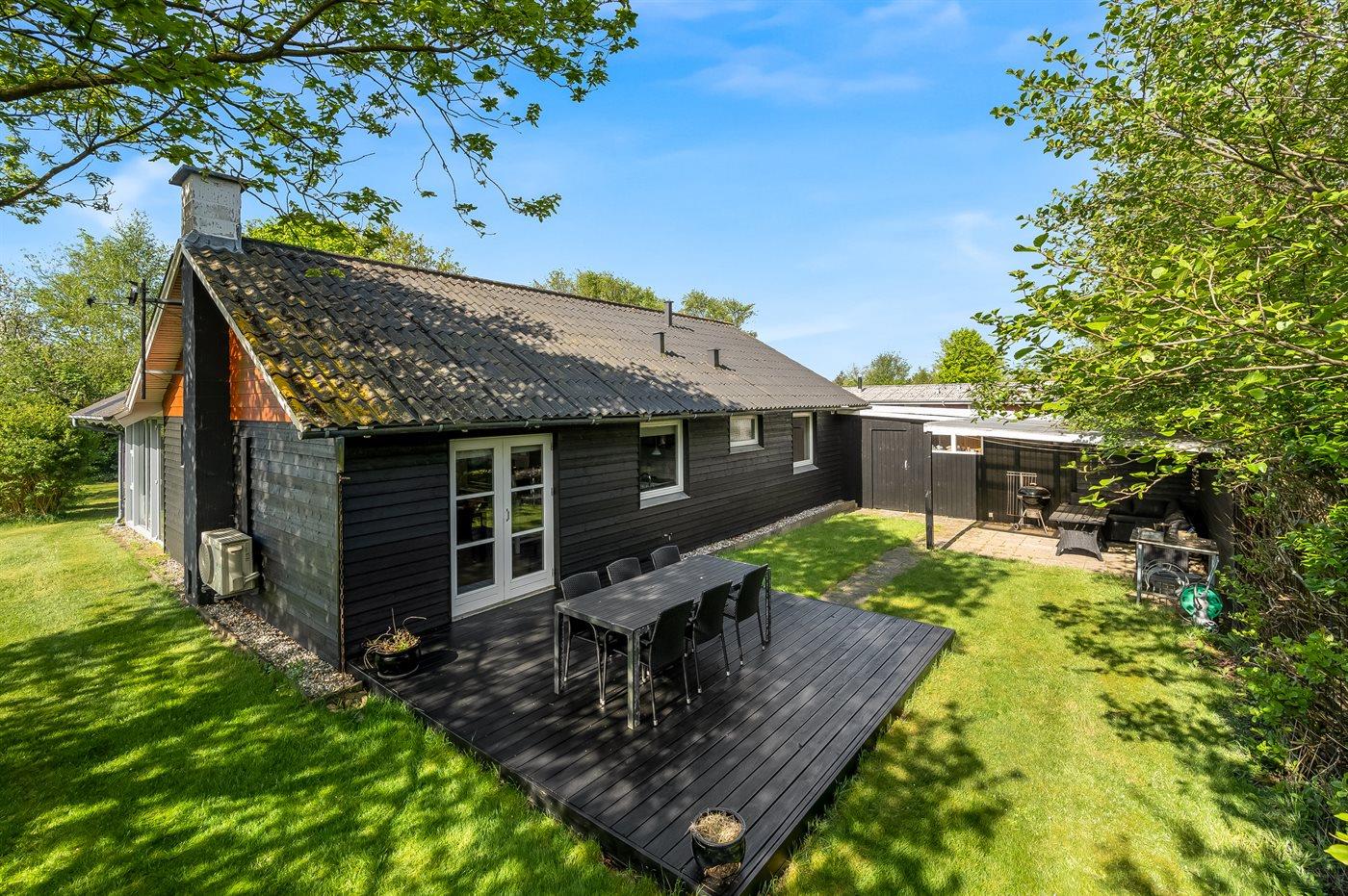 Sommerhuset ligger på en ugenert og indhegnet grund med gode læforhold - for enden af en lukket vej. Her kan du altid finde en hyggekrog på de mange terrasser, og børn og hunde kan lege på den store græsplæne.