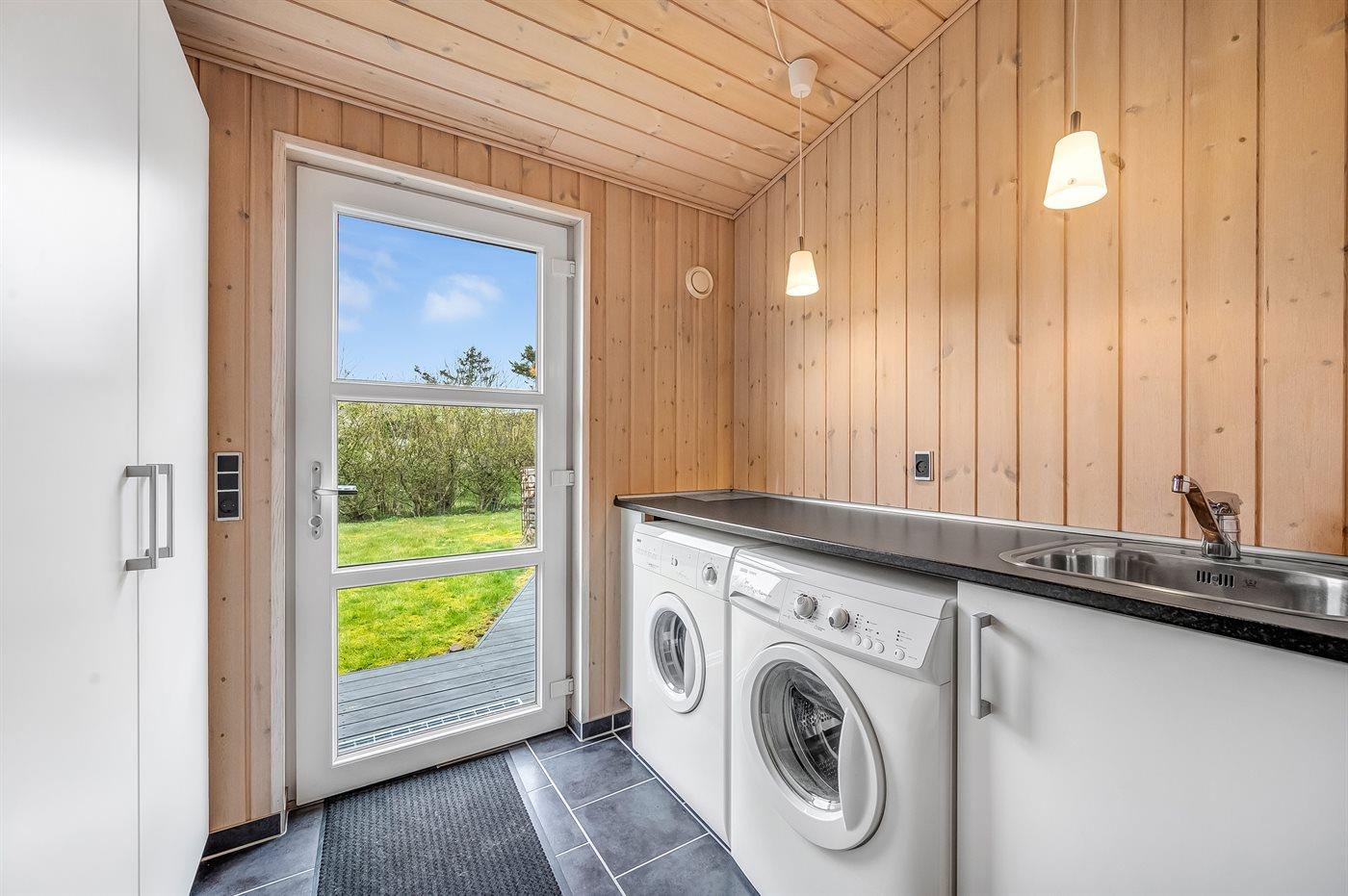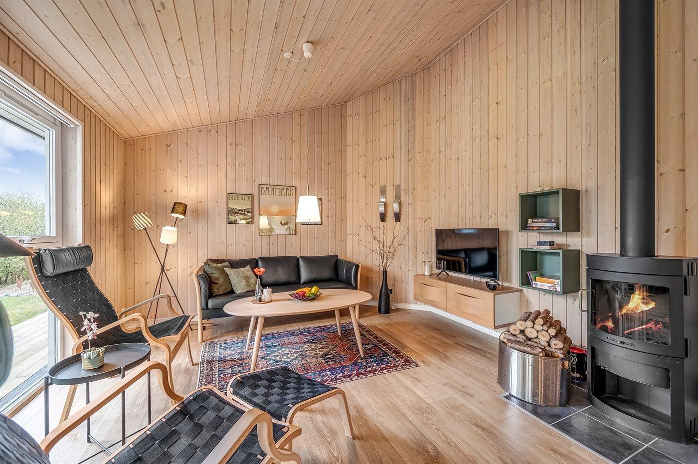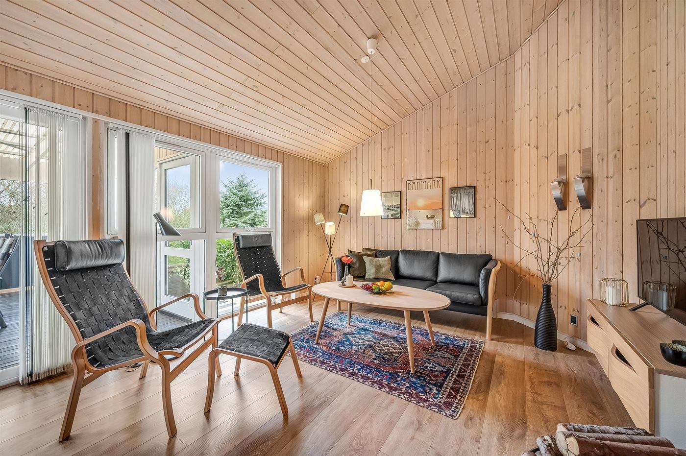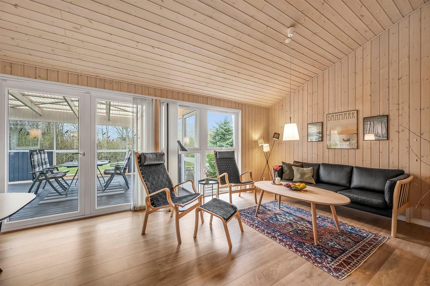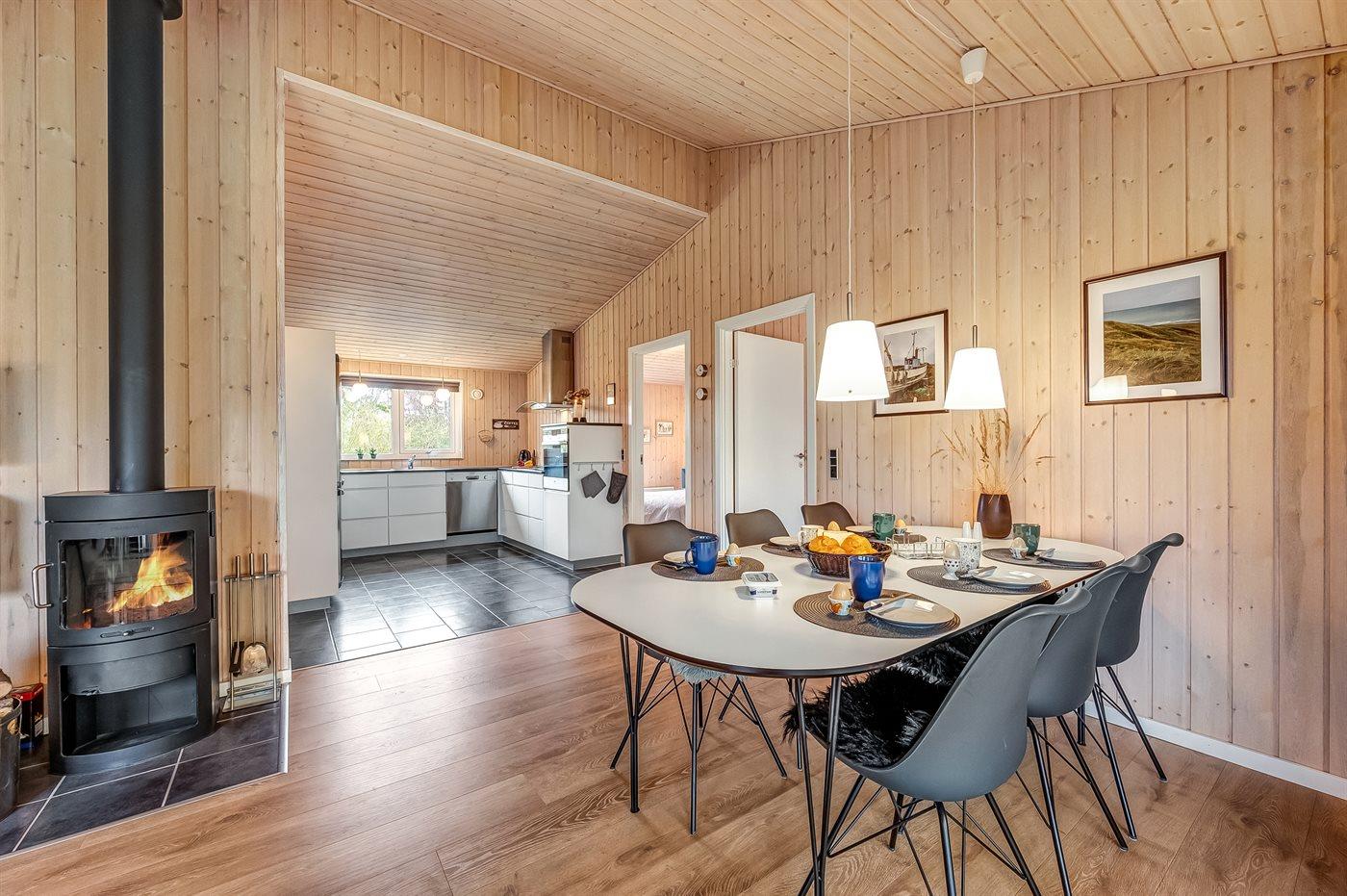 Sommerhusets samlingspunkt er det store og velindrettet køkken-alrum. Her er der plads til hygge og afslapning i sofagruppen, mens brændeovnens knitren spiller som baggrundsmusik, og i det store køkken er der rig mulighed for at udfolde jeres kulinariske ambitioner?? Men dette dejlige sommerhus overrasker med endnu et skønt samlingspunkt - som en ekstra bonus. Fra køkken-alrummet er der nemlig direkte adgang til den store overdækkede terrasse, som er et vidunderligt opholdssted i både regn- og solskinsvejr. Den overdækkede terrasse hjælper til med at gøre de lange lyse sommernætter endnu længere, og skulle det regne, så er det en hel meditativ fornemmelse at sidde i tørvejret og lytte til regnens trommen på taget.