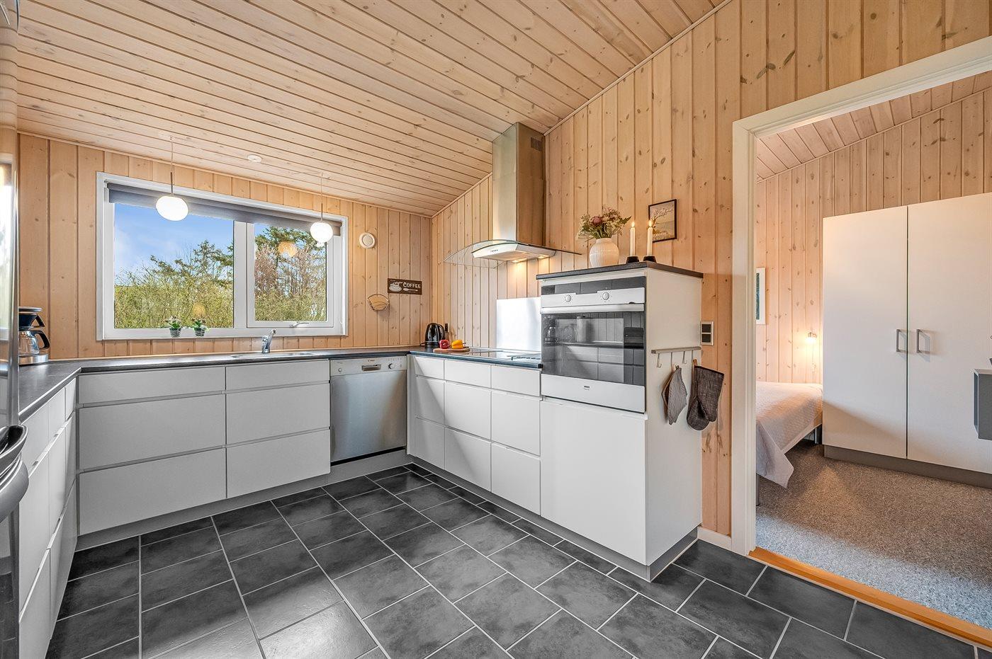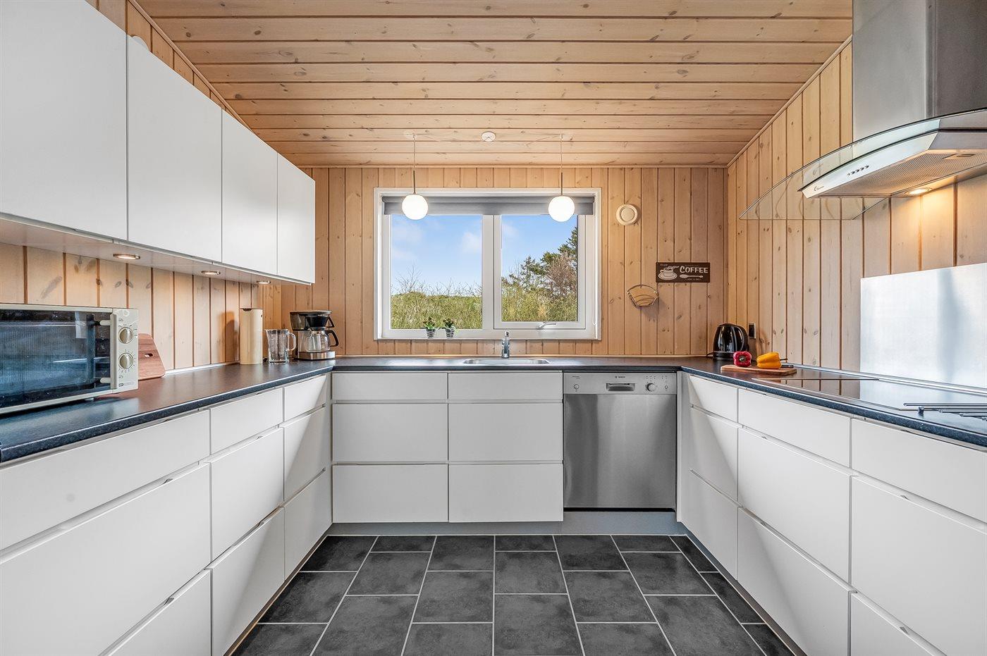 Køkkenet er udstyret med 1 køleskab. Der er 4 keramiske kogeplader, varmluftovn, mikrobølgeovn samt opvaskemaskine.