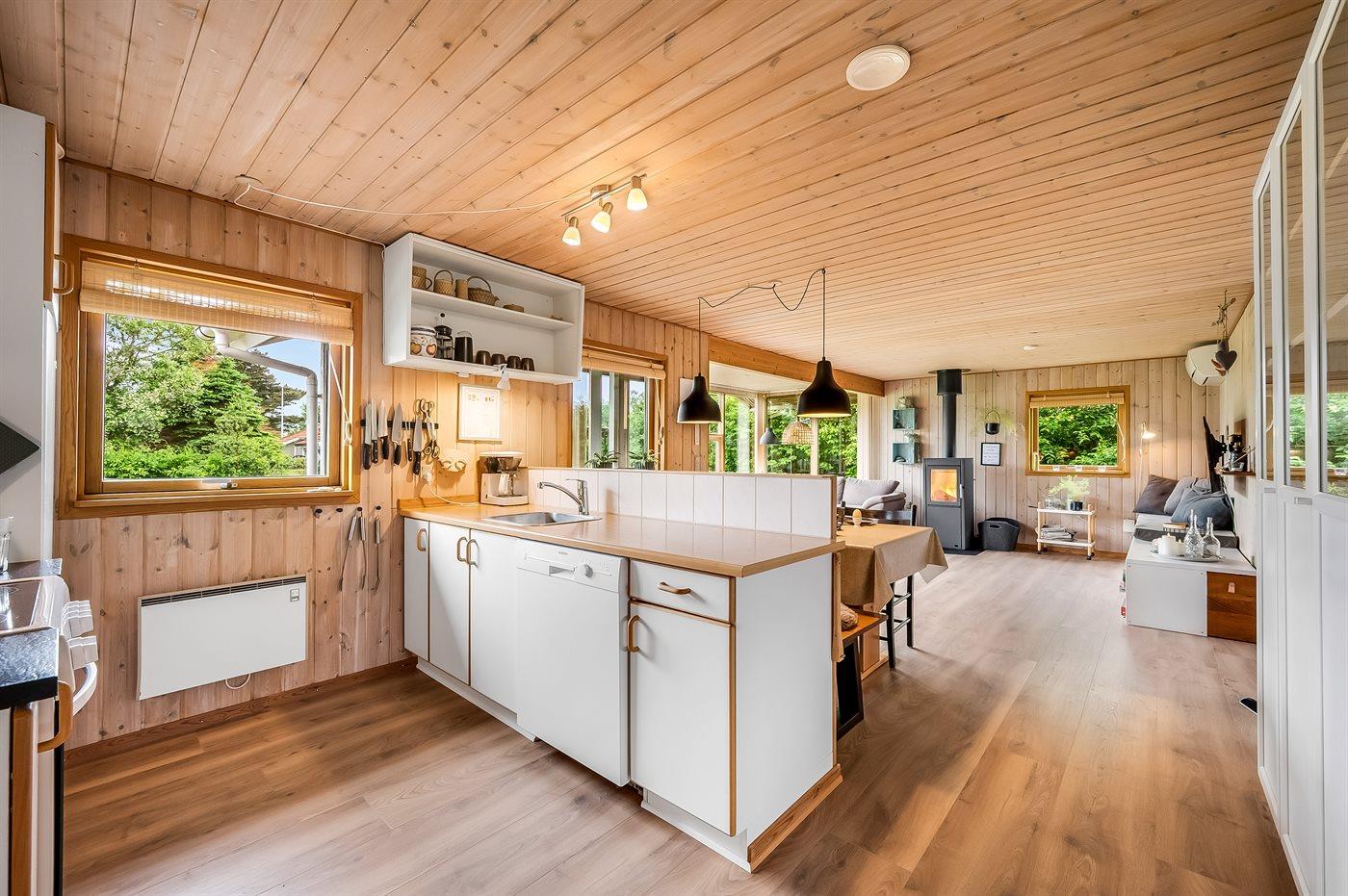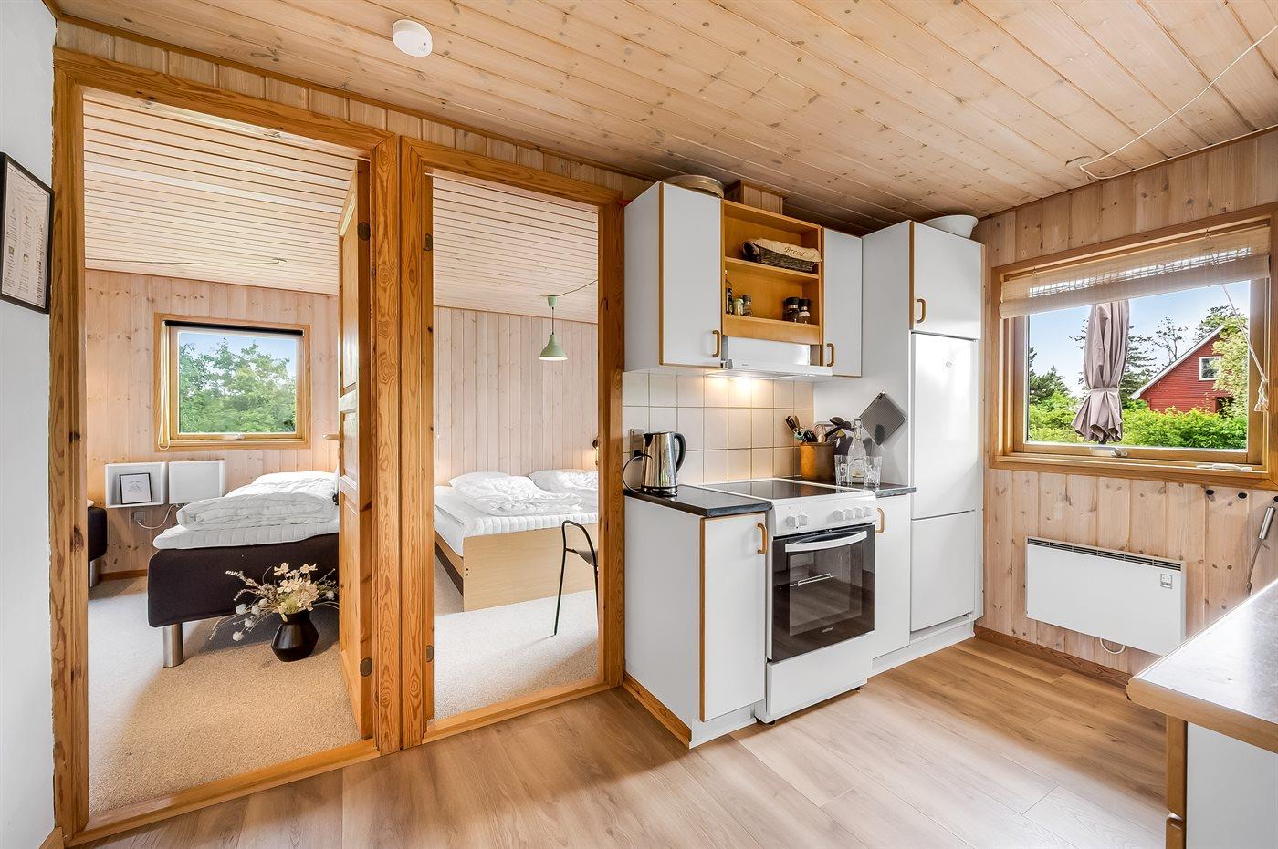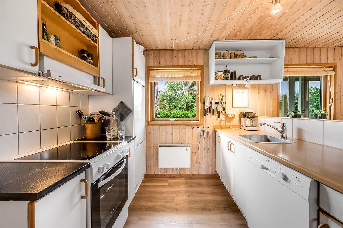 Køkkenet er udstyret med 1 køleskab. Der er 4 keramiske kogeplader, varmluftovn, mikrobølgeovn samt opvaskemaskine.