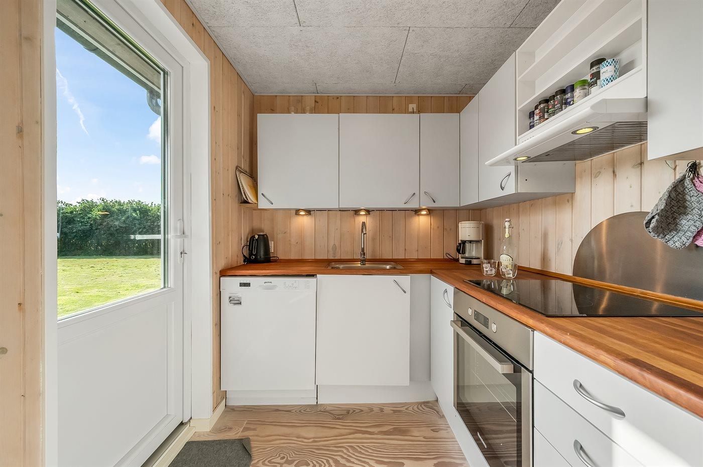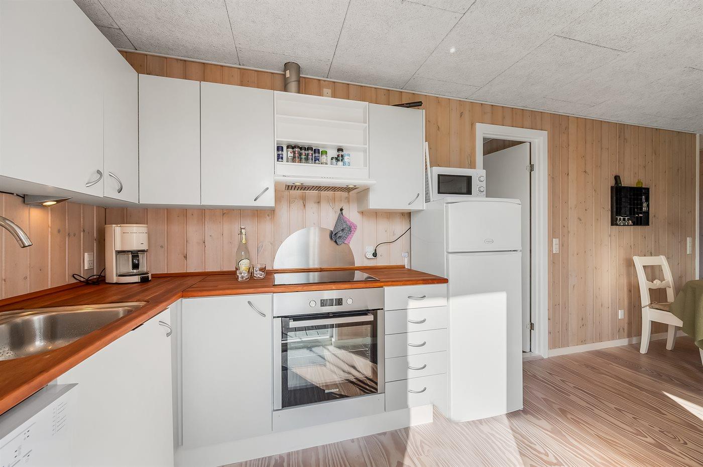 Køkkenet er udstyret med 1 køleskab. Der er 4 keramiske kogeplader, varmluftovn, mikrobølgeovn samt opvaskemaskine.