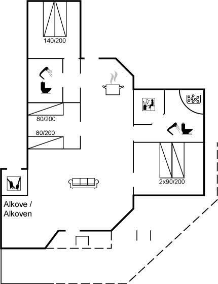 Der er i alt 3 soveværelser. Sovepladserne fordeler sig på: 2 sovepladser i dobbeltseng. 2 sovepladser i enkeltsenge.2 sovepladser i elevationssenge. Derudover er der 1 stk. barneseng.