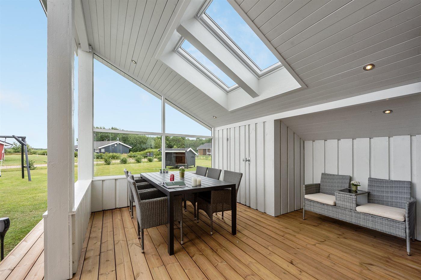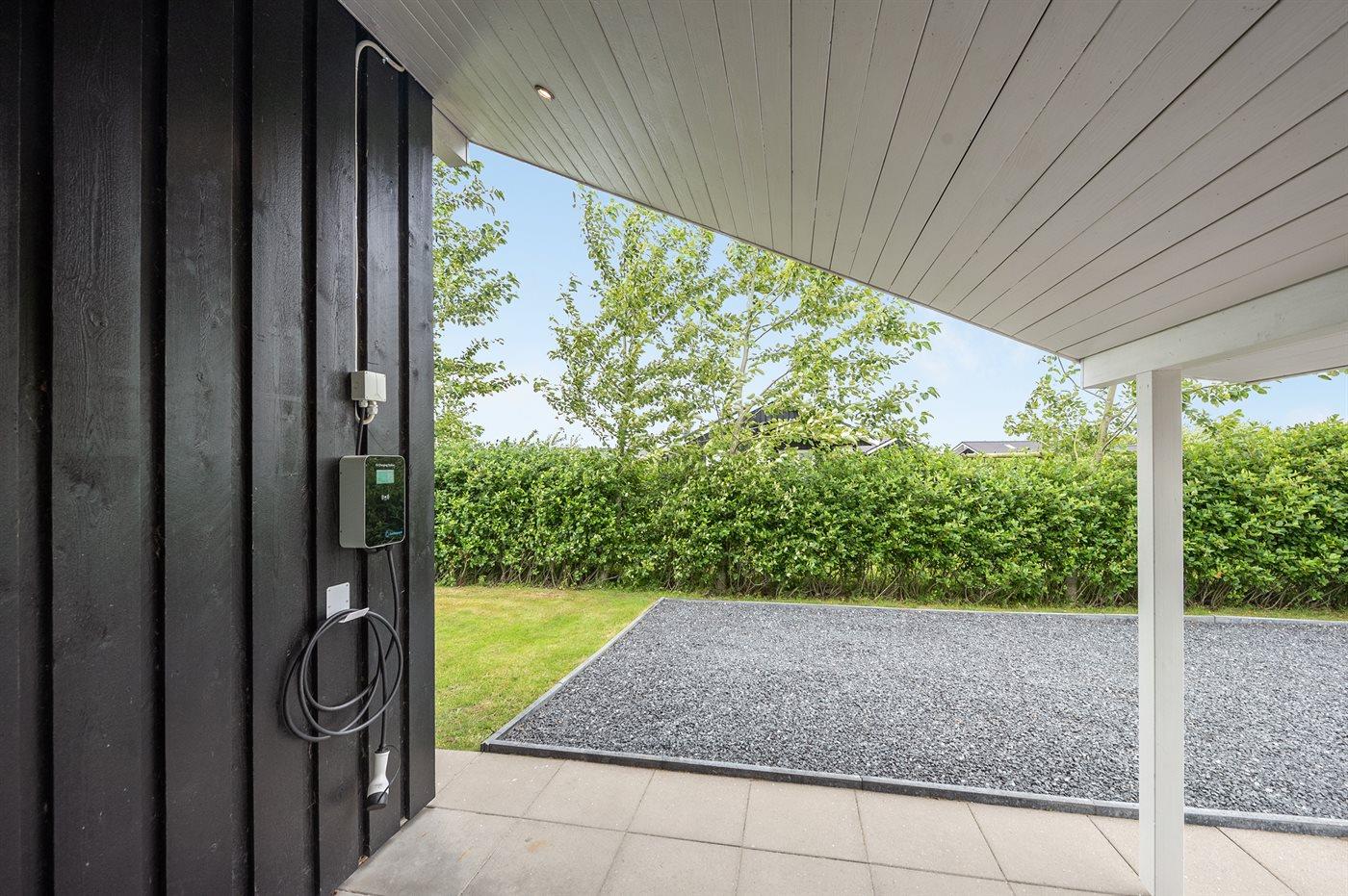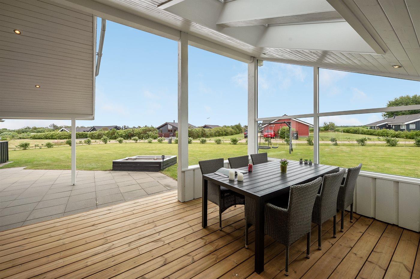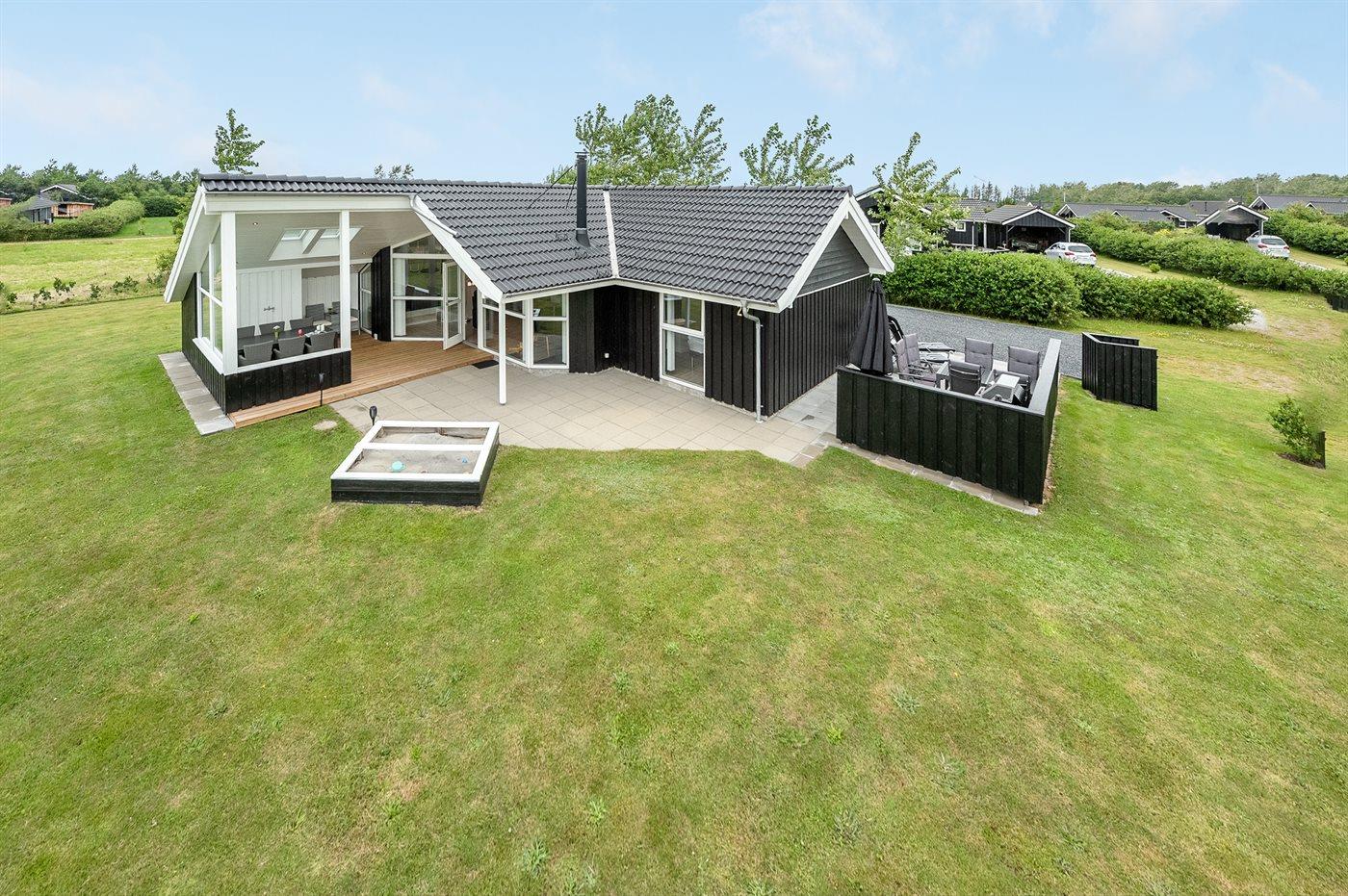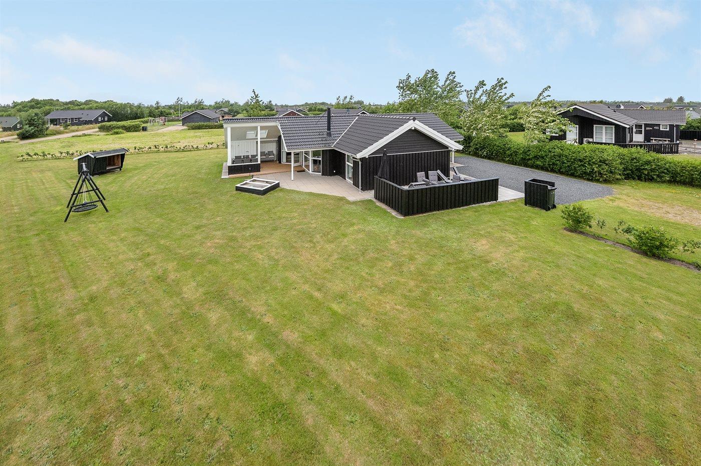 Ferieboligen er beliggende på en 1330 m² stor havegrund. Der er 11000 m til havet. Der er 700 m til fjorden. Nærmeste forretning er beliggende i en afstand af 600 m. Til ferieboligen hører 50 m² terrasseareal. Desuden er der 20 m² overdækket terrasse. Der er redskabsrum. Gynge. Sandkasse. Shelter. Der er installeret stik til opladning af elbil. Type 2 stik. Med 9 kW ladeeffekt. Parkering ved ferieboligen.