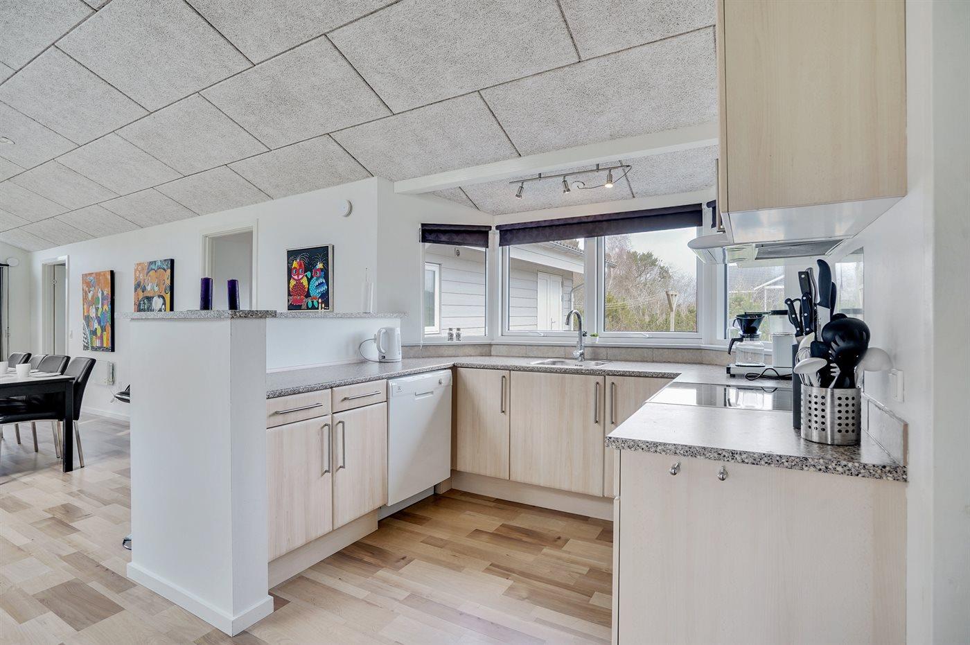 Køkkenet er udstyret med 1 køleskab. Der er 4 keramiske kogeplader, varmluftovn, mikrobølgeovn samt opvaskemaskine.