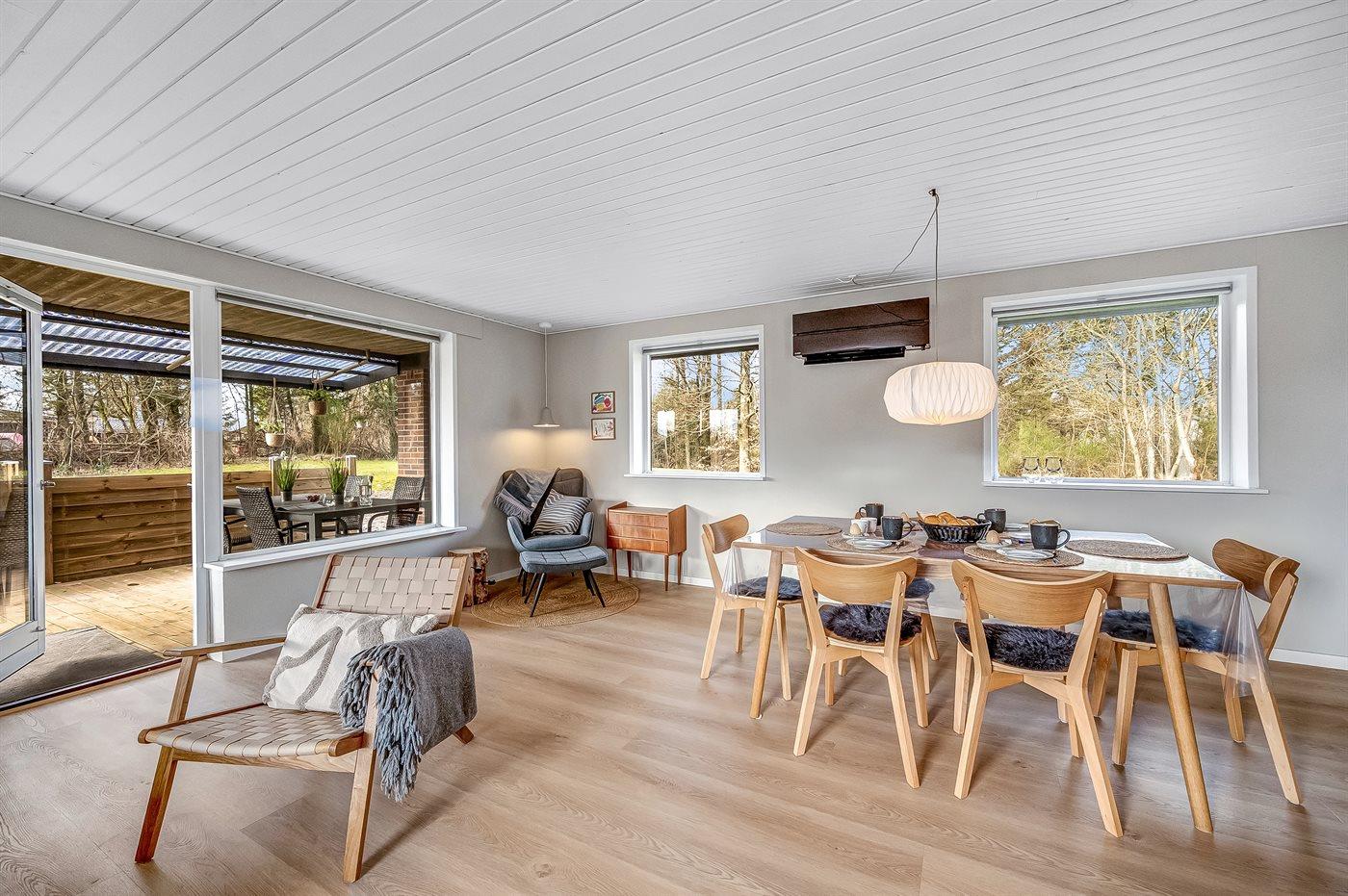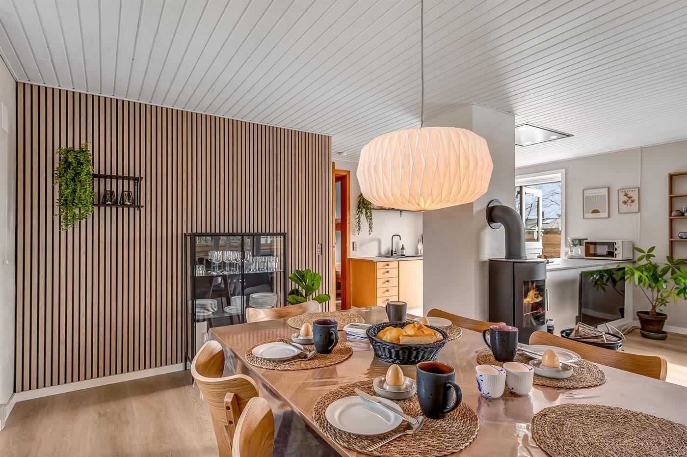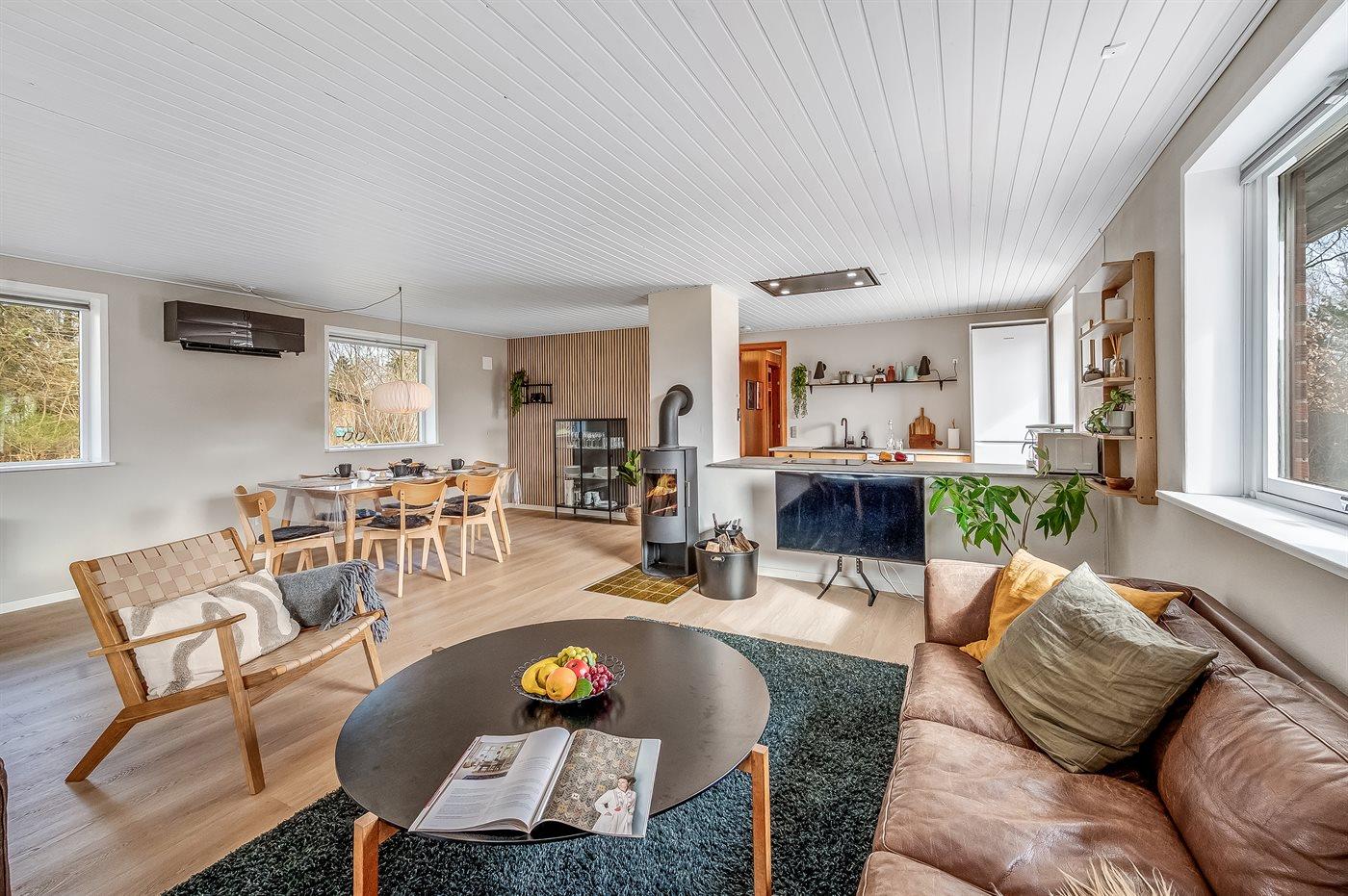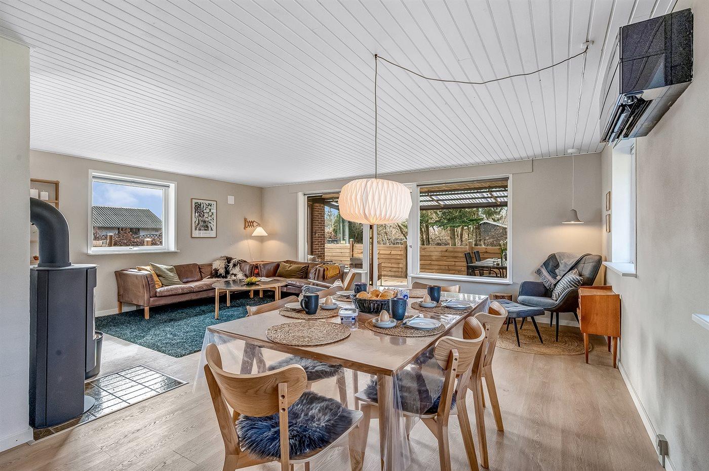 Sommerhusets hjerte er det store køkken-alrum, der er indrettet i nordisk stil, og som oser af hygge. Her kan i slappe af i sofaerne og se en god film, eller bare sidde og se på flammerne i brændeovnen og lytte til dens knitren. Fra køkken-alrummet er der direkte adgang til den overdækkede terrasse og den store have, som indbyder til spil og leg for både hunde og børn.