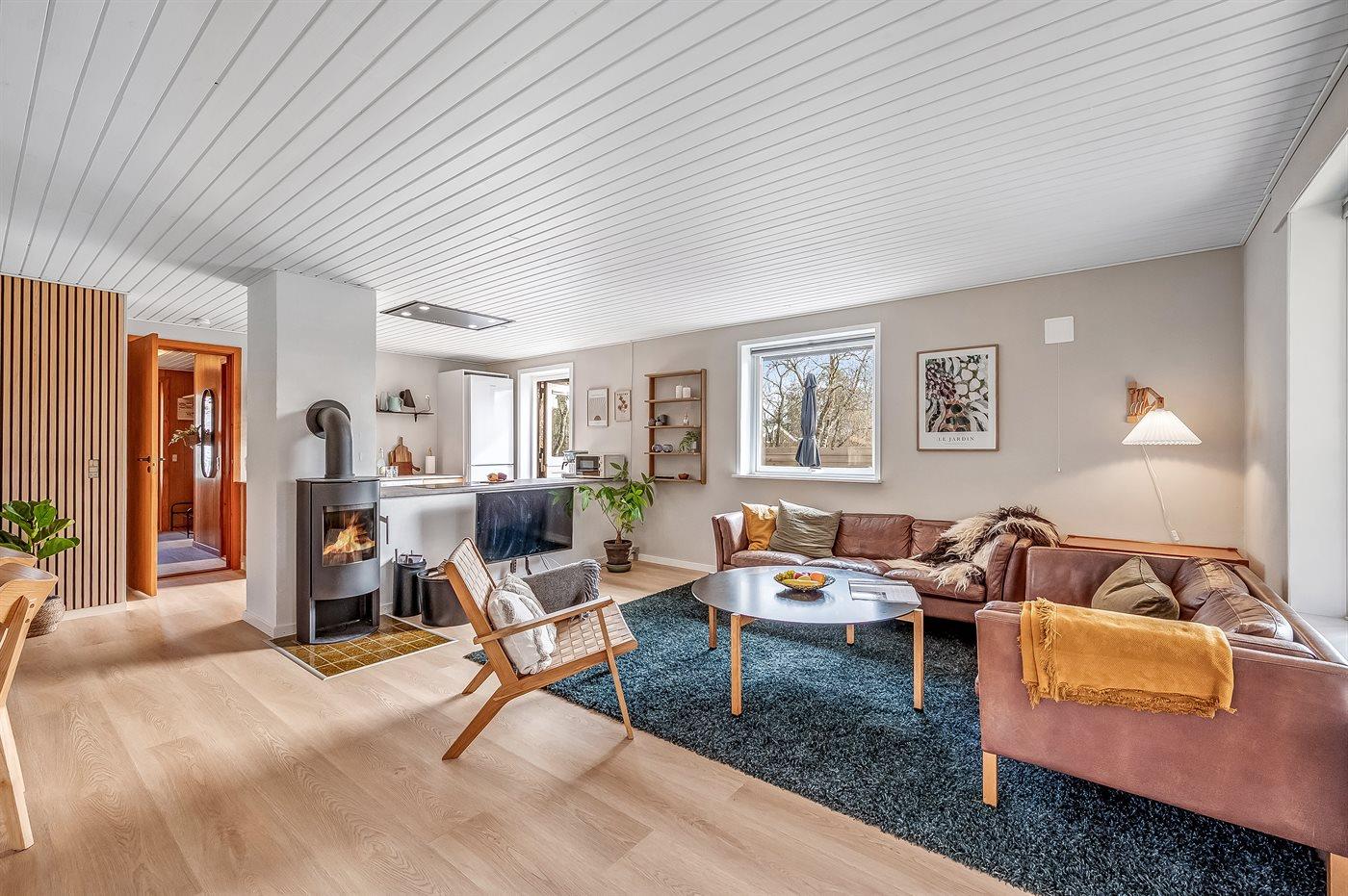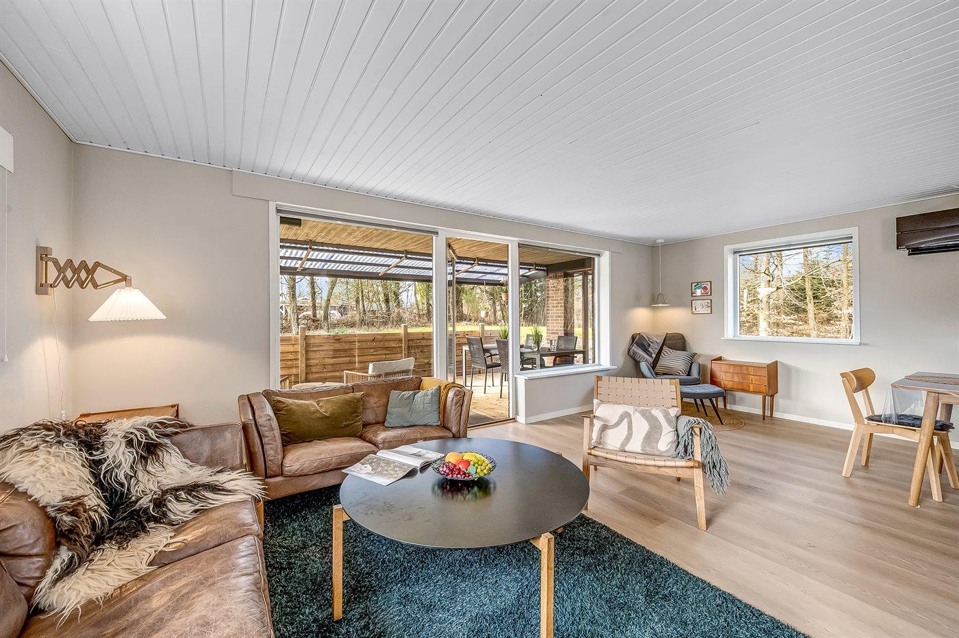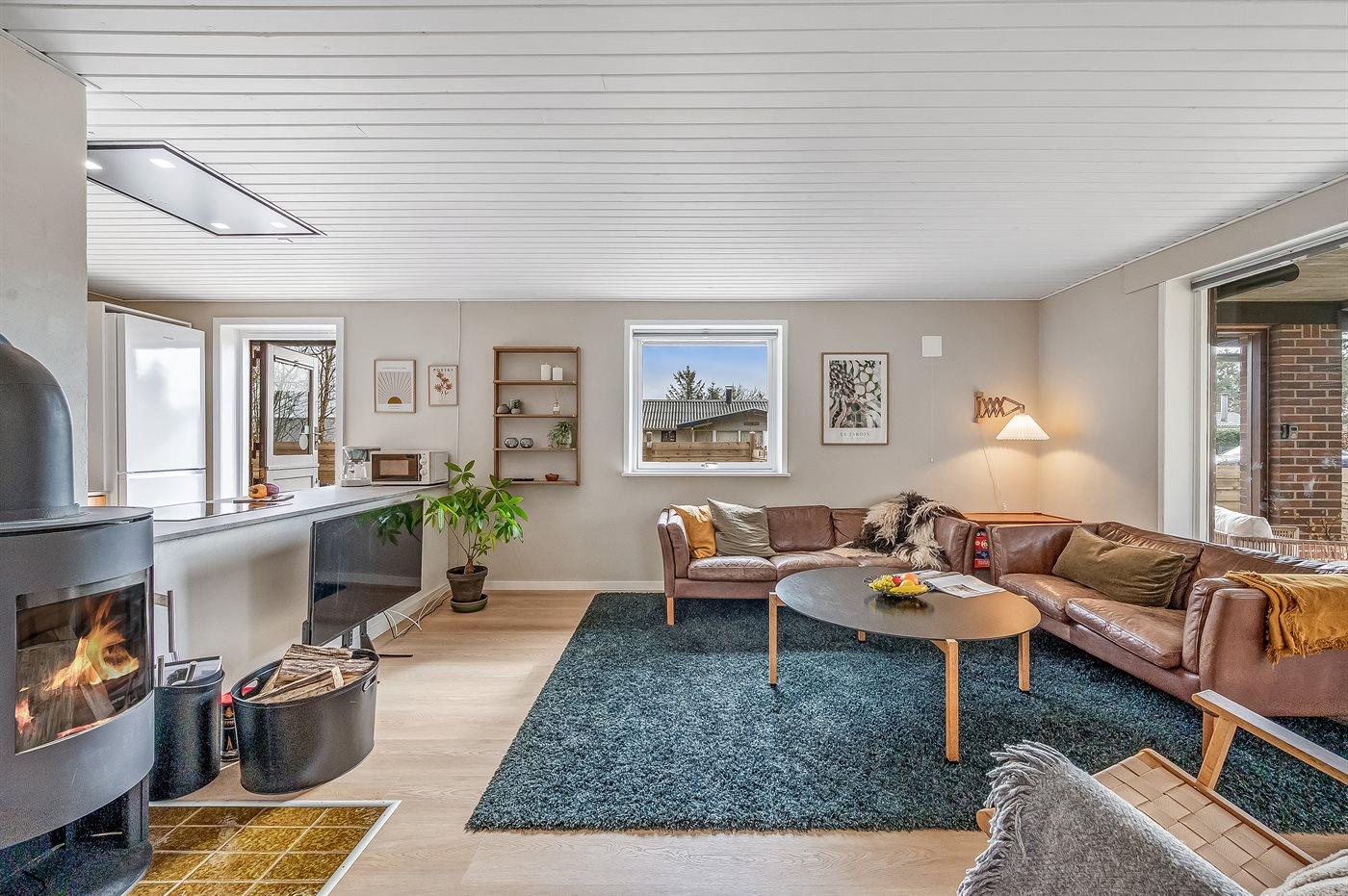 Sommerhusets hjerte er det store køkken-alrum, der er indrettet i nordisk stil, og som oser af hygge. Her kan i slappe af i sofaerne og se en god film, eller bare sidde og se på flammerne i brændeovnen og lytte til dens knitren. Fra køkken-alrummet er der direkte adgang til den overdækkede terrasse og den store have, som indbyder til spil og leg for både hunde og børn.