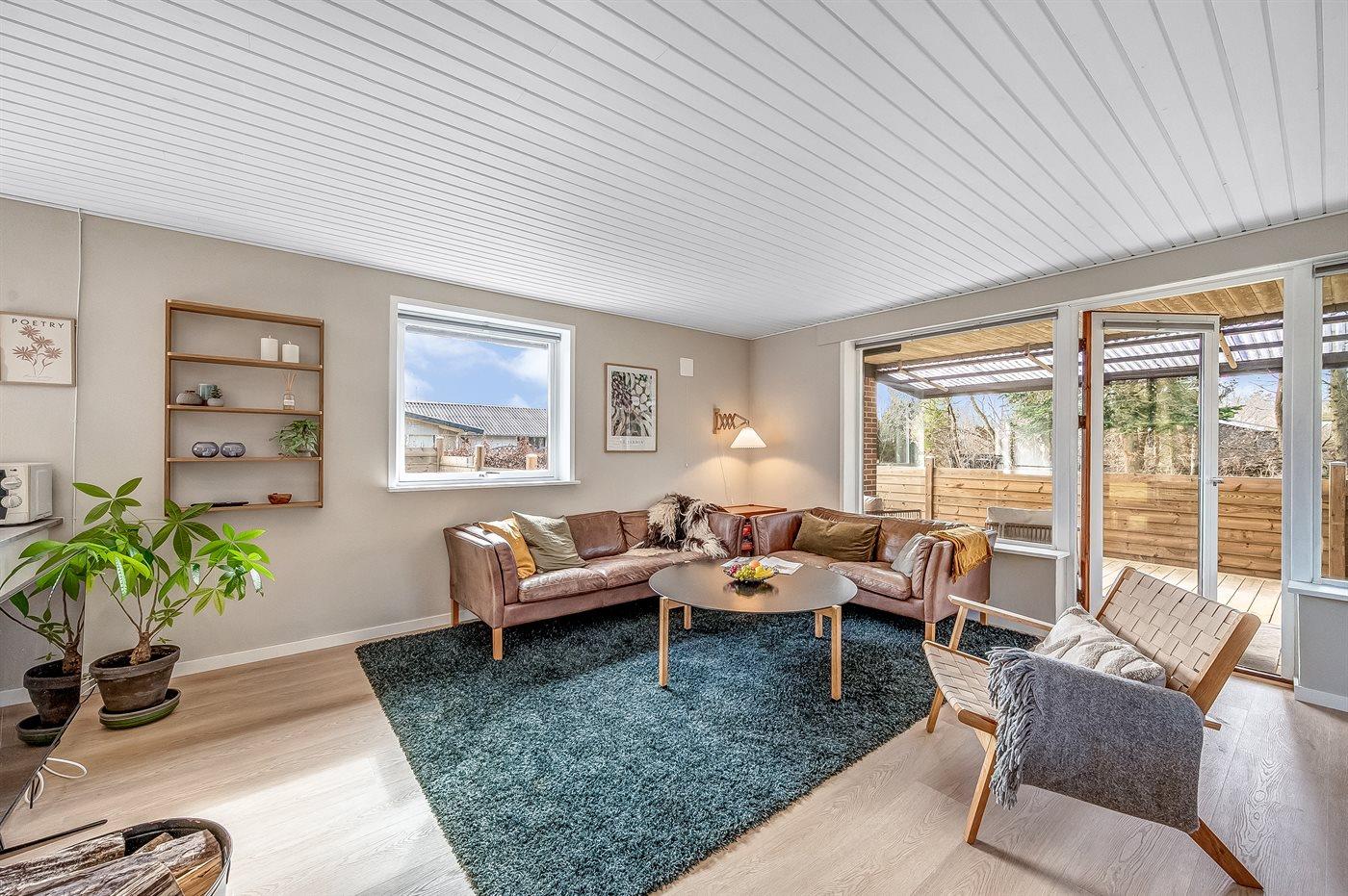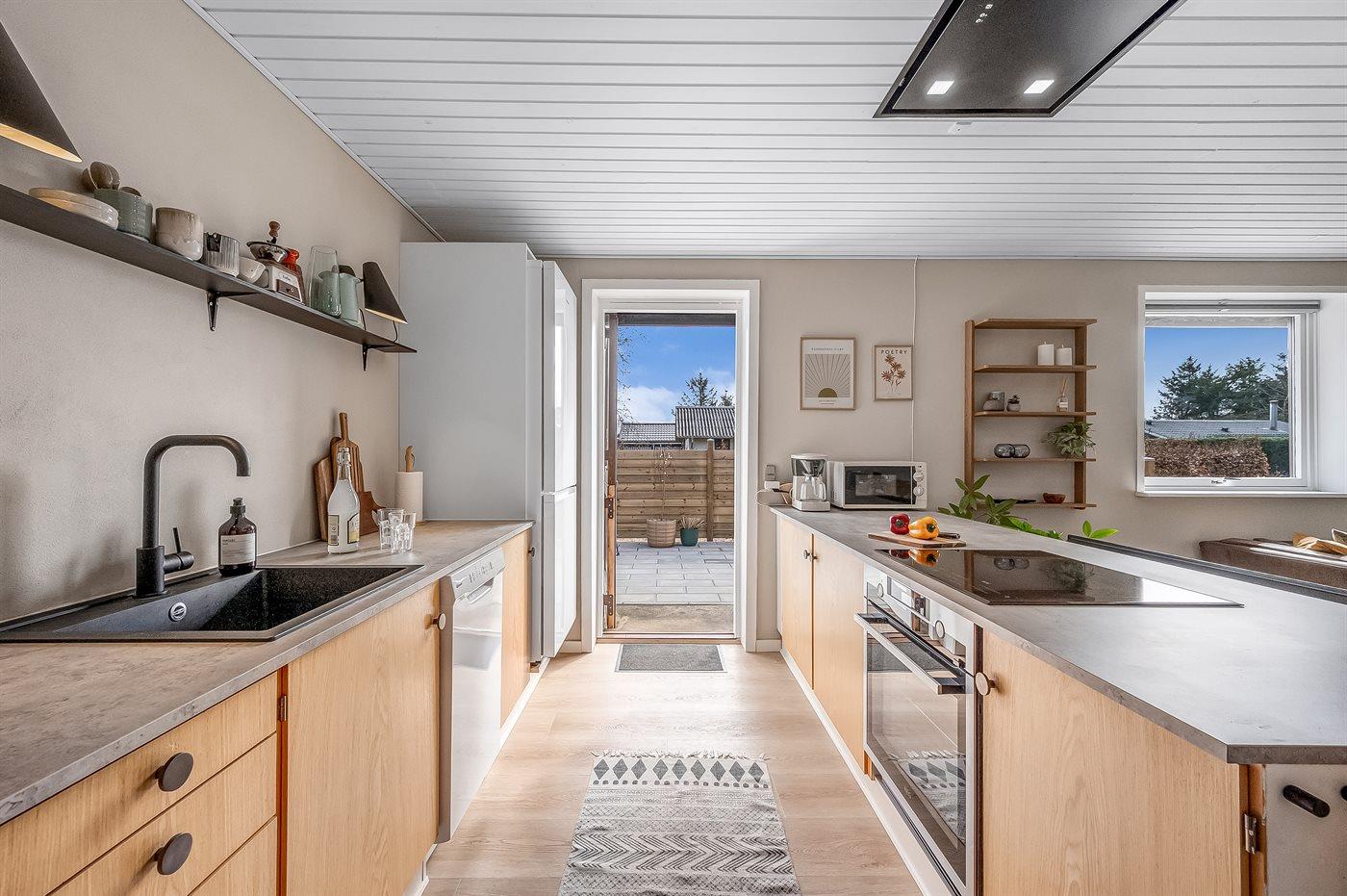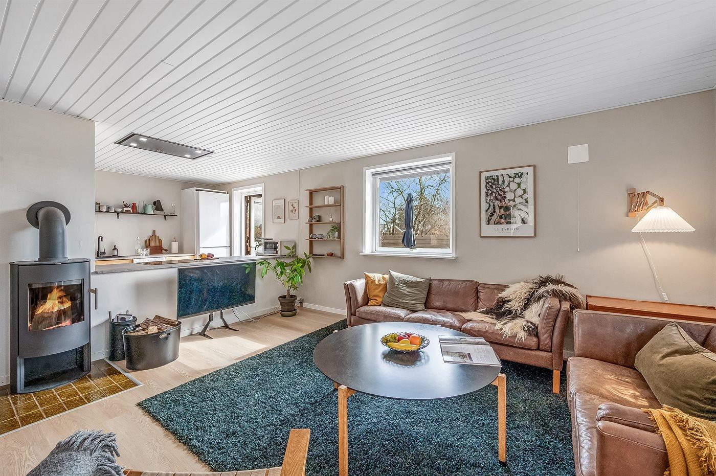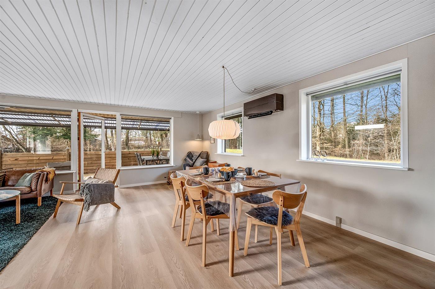 Sommerhusets hjerte er det store køkken-alrum, der er indrettet i nordisk stil, og som oser af hygge. Her kan i slappe af i sofaerne og se en god film, eller bare sidde og se på flammerne i brændeovnen og lytte til dens knitren. Fra køkken-alrummet er der direkte adgang til den overdækkede terrasse og den store have, som indbyder til spil og leg for både hunde og børn.