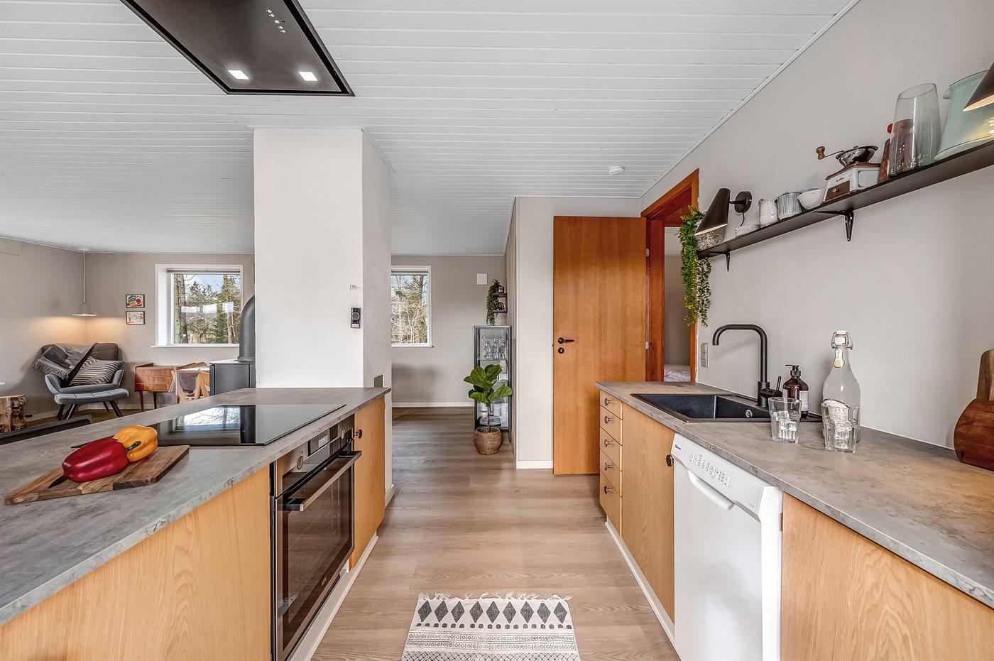 Køkkenet er udstyret med 1 køleskab. Der er 4 induktionskogeplader, varmluftovn, mikrobølgeovn samt opvaskemaskine.