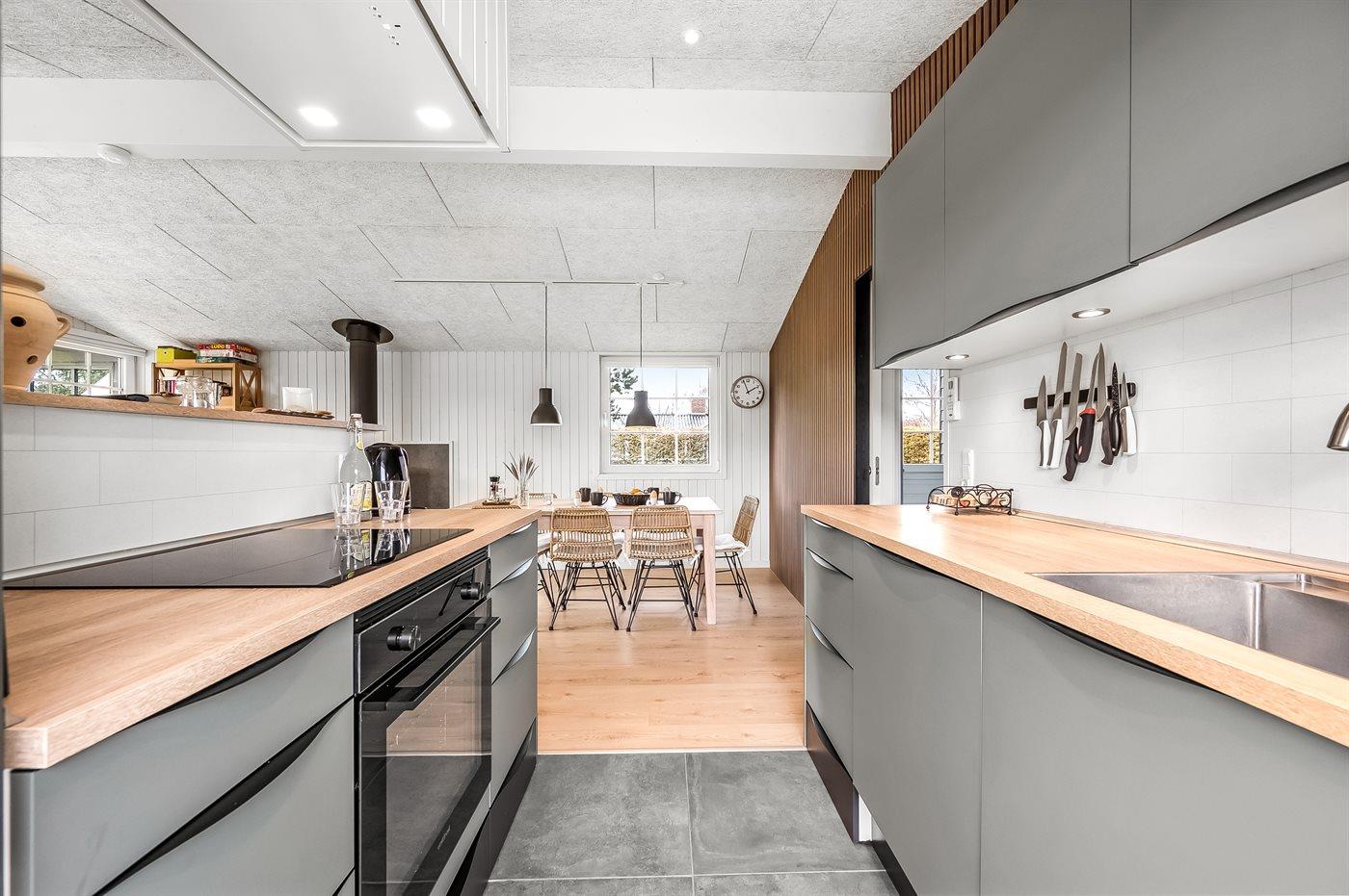 Køkkenet er udstyret med 1 køleskab. Der er 4 induktionskogeplader, varmluftovn, mikrobølgeovn samt opvaskemaskine.