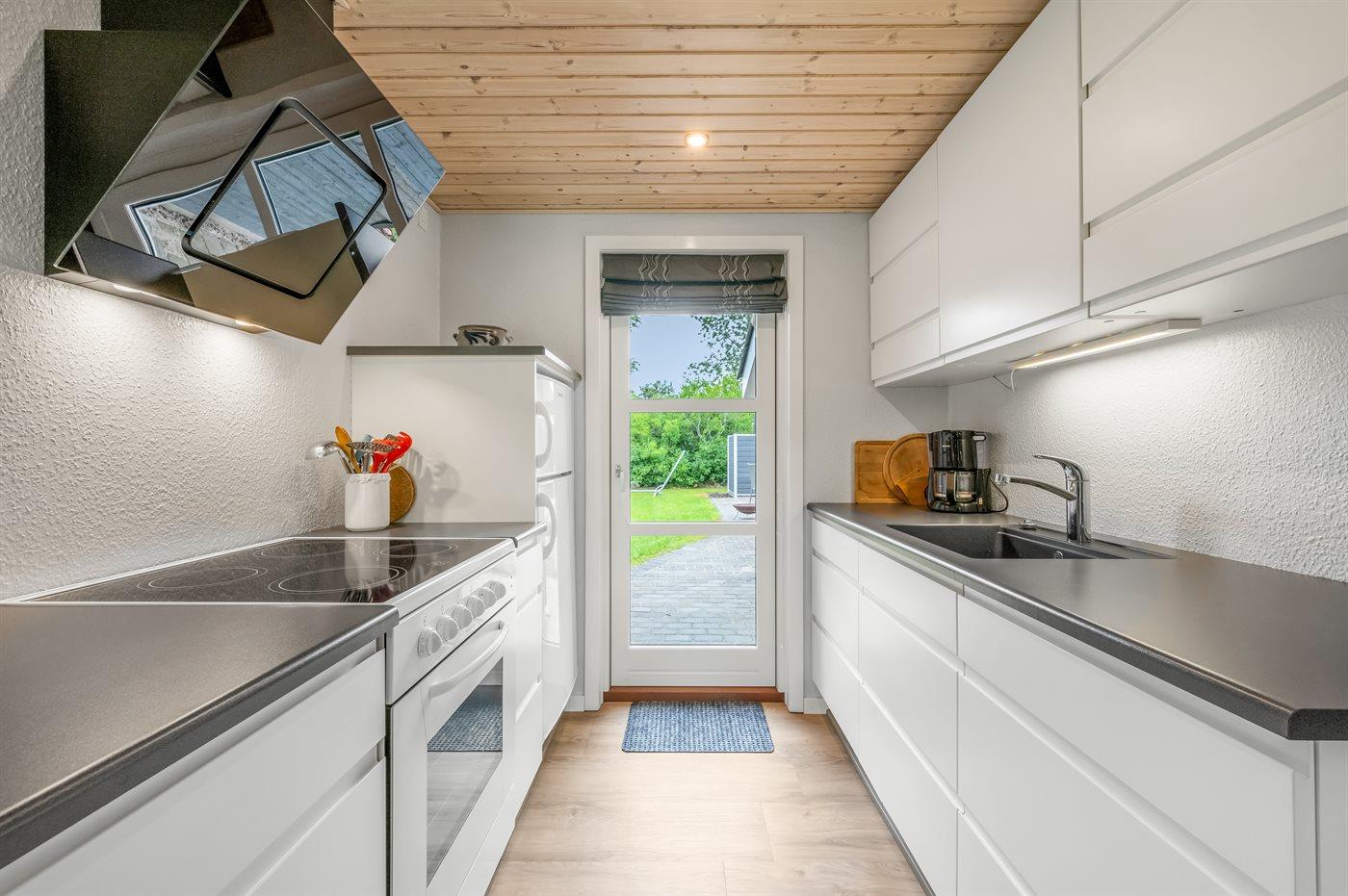 Køkkenet er udstyret med 1 køleskab. Der er 4 elkogeplader, varmluftovn.