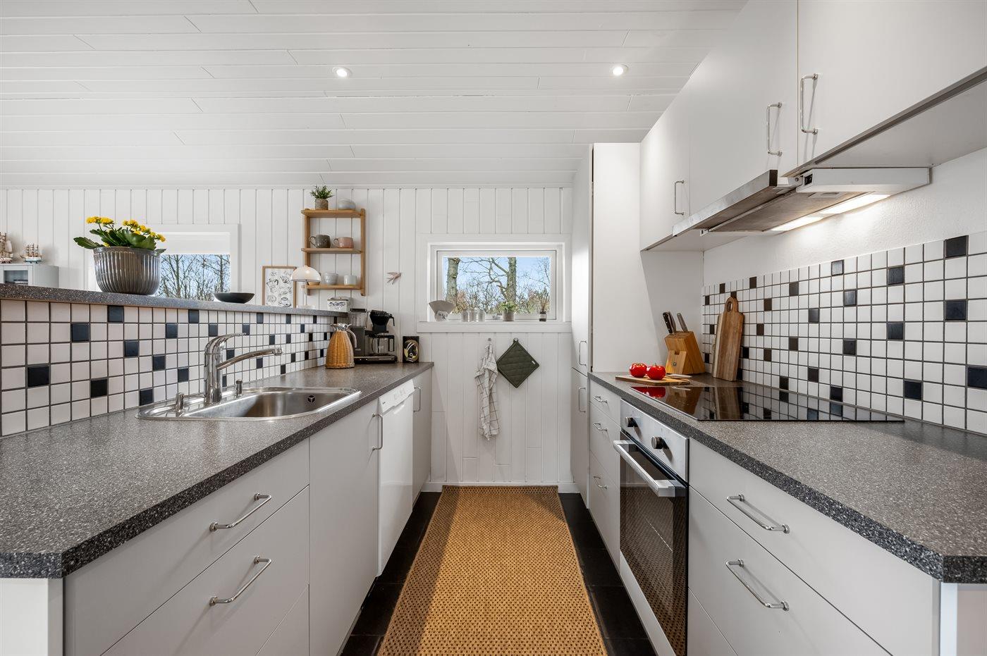 Køkkenet er udstyret med 1 køleskab. Der er 4 keramiske kogeplader, varmluftovn, mikrobølgeovn samt opvaskemaskine.