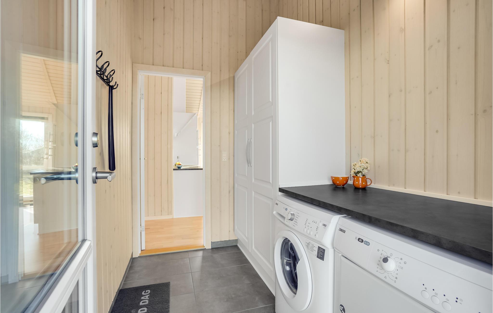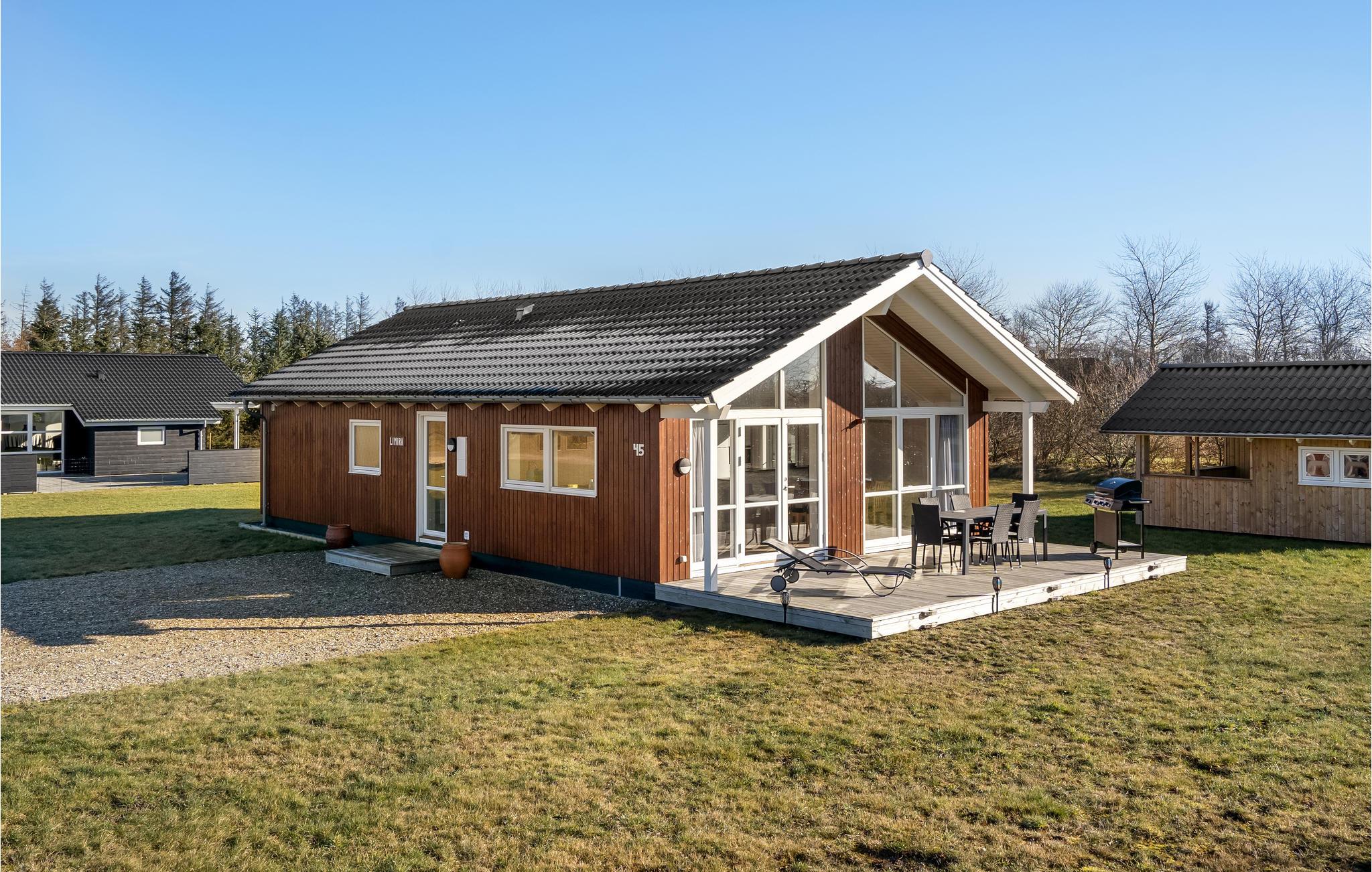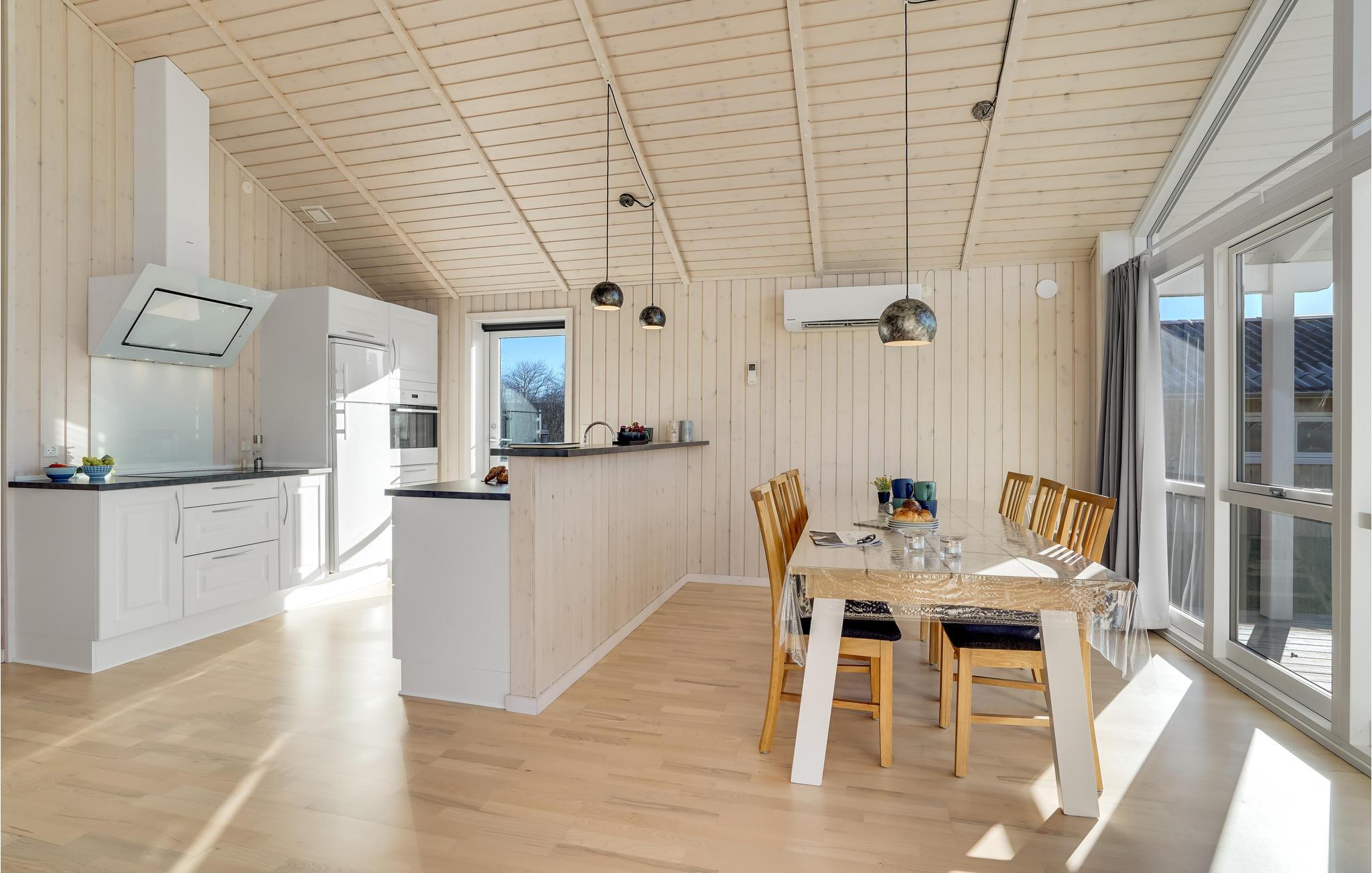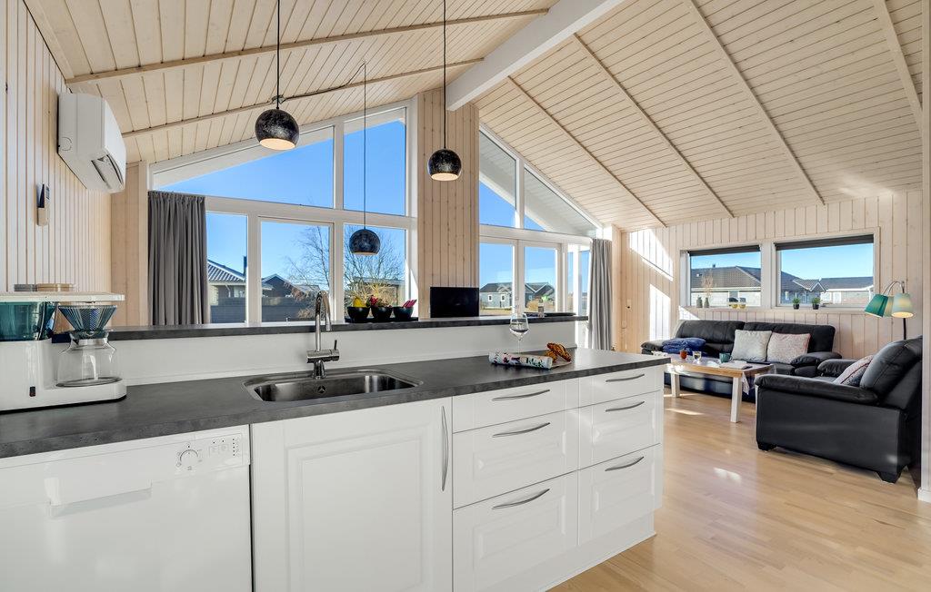 I husets lyse rum kan I slappe af med hele familien på alle tider af året. Den hyggelige indretning med et smukt lysindfald gennem den store glasfront sørger for en hyggelig atmosfære. Lav mad sammen med en vidunderlig udsigt til haven, nyd måltiderne ved spisebordet, hvor I også nyder en smuk udsigt. Senere kan I føle jer godt tilpas i siddeområdet og lade jeres blik vandre over det omkringliggende grønne område. Feriehusets udendørsområde indbyder til mange glade timer i det fri. Nyd solen på terrassen, slap af i en liggestol og afslut en dejlig dag med et måltid fra grillen.