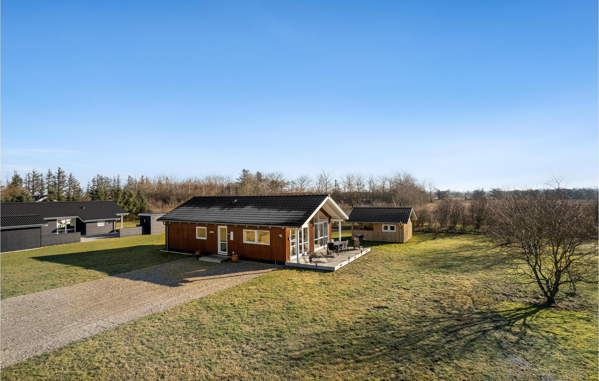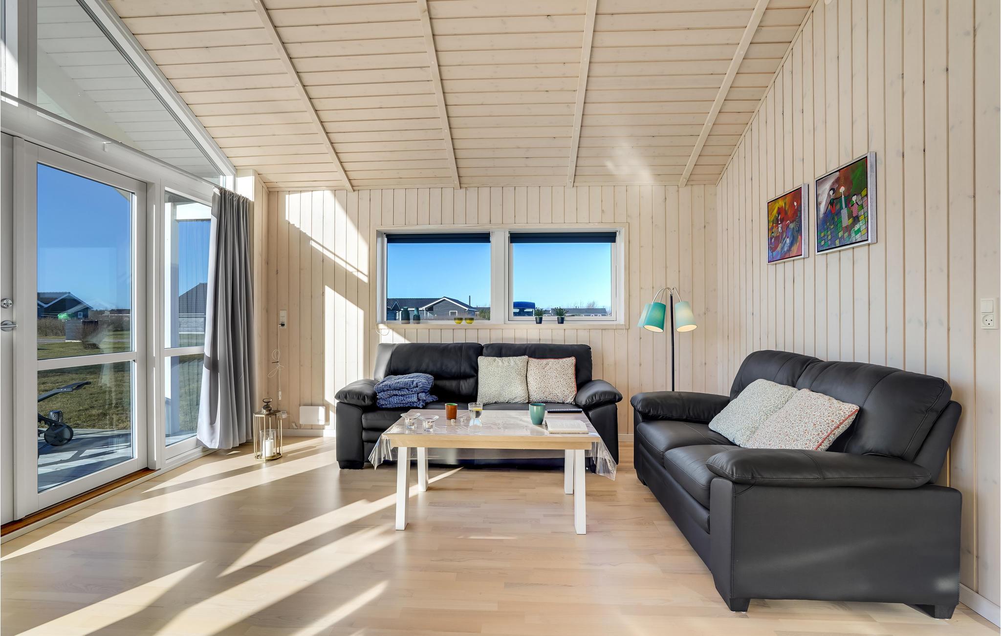 Hyggeligt feriehus nær Skaven Strand med stor glasfront og dejlig haveudsigt.