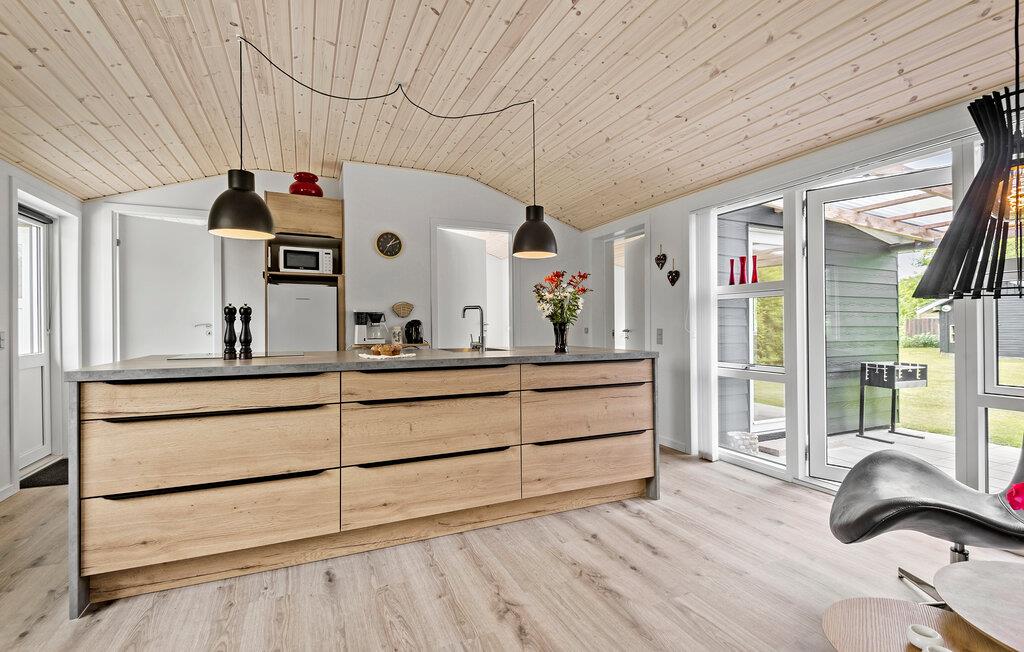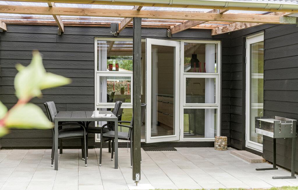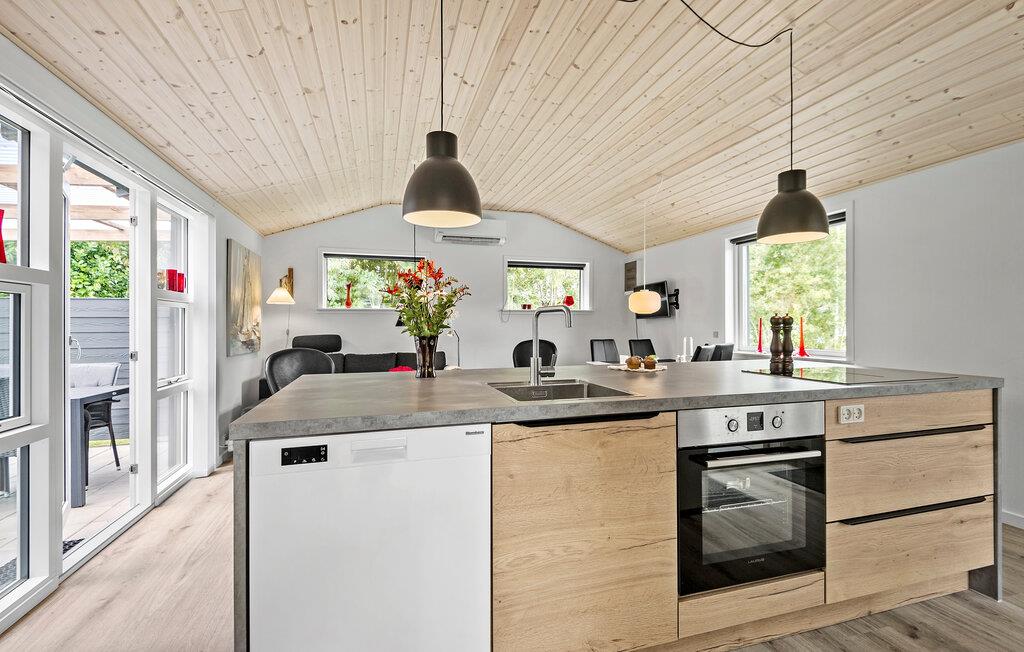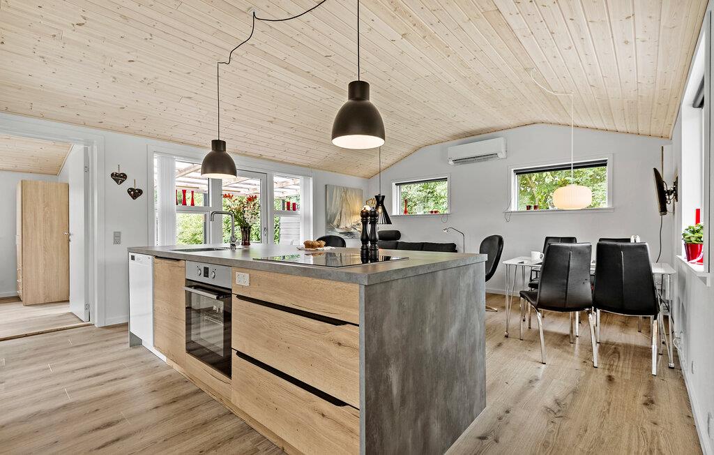Nyd jeres velfortjente ferie i dette hyggelige feriehus, kun et stenkast fra fjorden. Det moderne åbne køkken gør det nemt at lave måltider i løbet af dagen. I forlængelse af køkkenet er spiseområdet og sofahjørnet, hvor I kan hygge med spilleaftener og gode film på tv’et. Fra stuen er der direkte udgang til en overdækket terrasse, der byder på en dejlig grøn udsigt over haven. For enden af haven er der endnu en overdækket terrasse med komfortable loungemøbler, der er oplagte til nogle afslappende stunder.