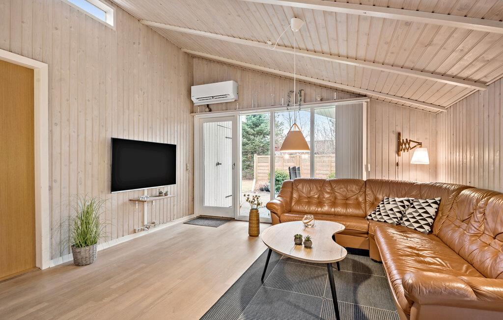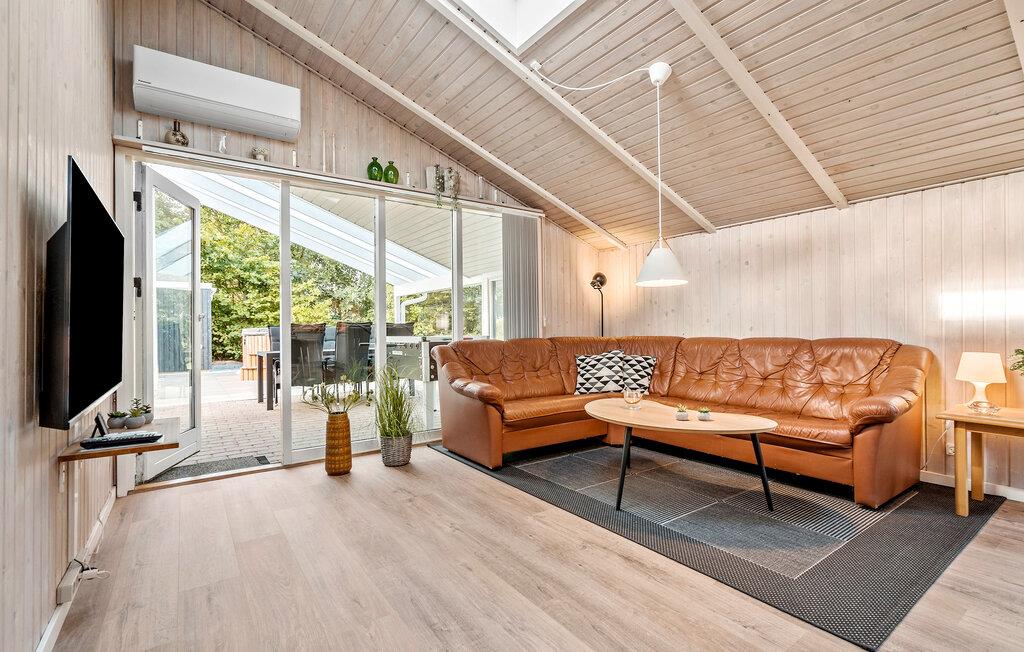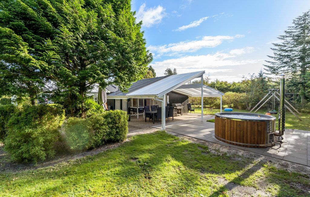 Flot familievenligt hus ved Skaven Strand med spa, træelementer og overdækket terrasse til afslapning.