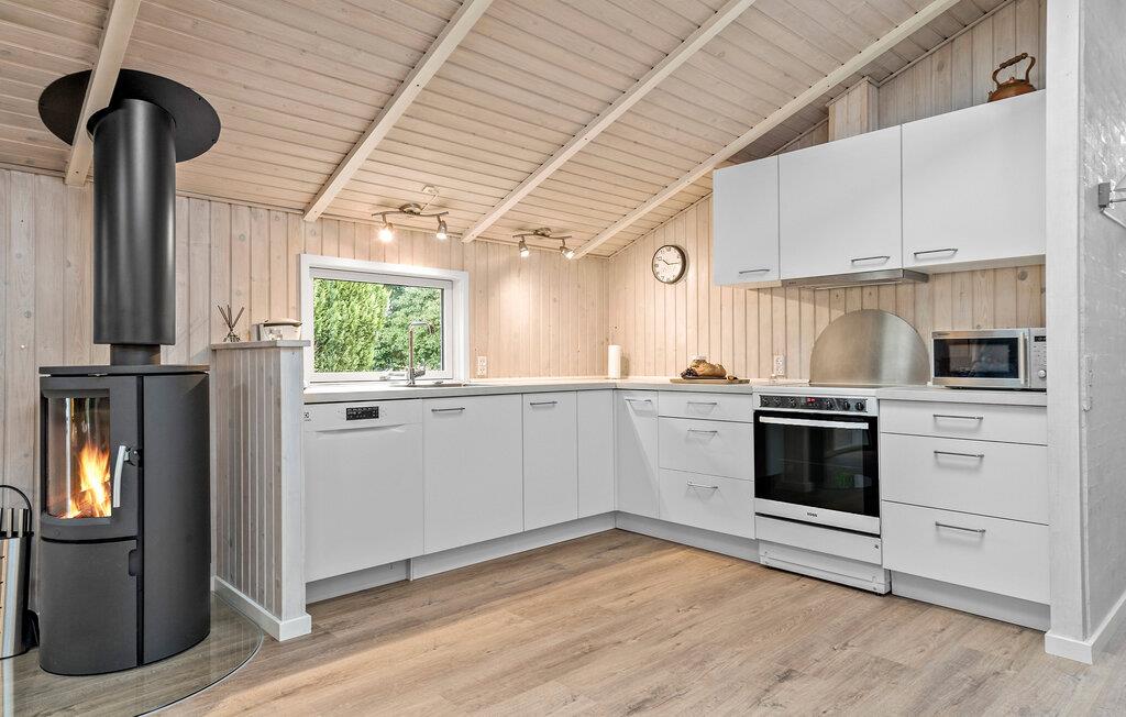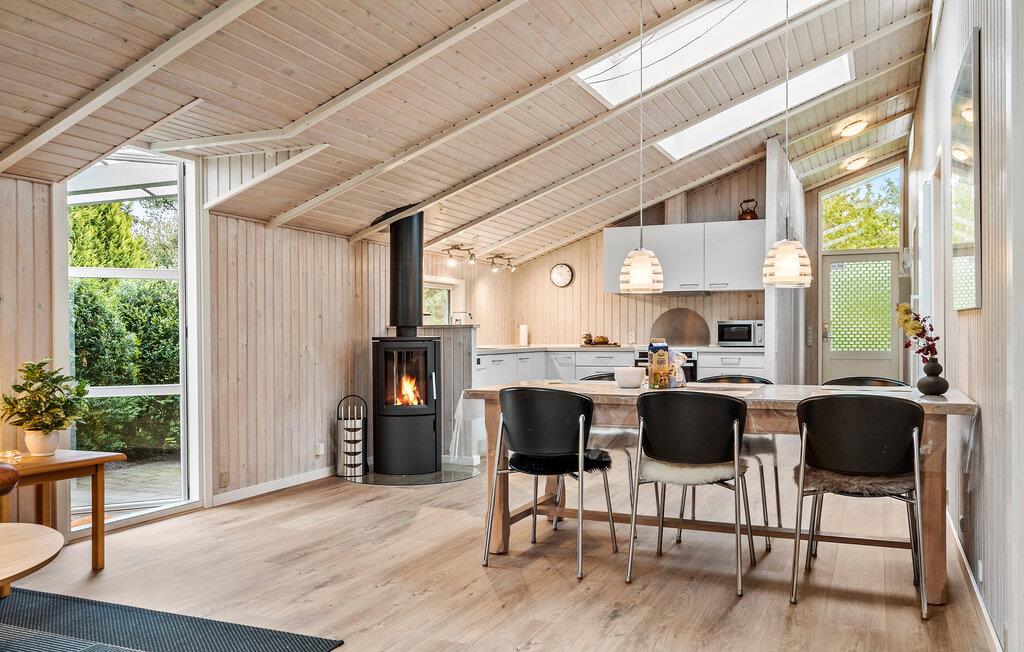 Indretningen byder på fremtrædende træelementer og et åbent boligkoncept, der forener køkken og stue og indbyder til mange hyggelige stunder sammen. Tag jer god tid med madlavningen i det veludstyrede køkken og nyd måltiderne ved spisebordet, mens I lægger planer for den kommende dag. Om aftenen kan I hvile stængerne med en god film eller et underholdende brætspil i sofaen.